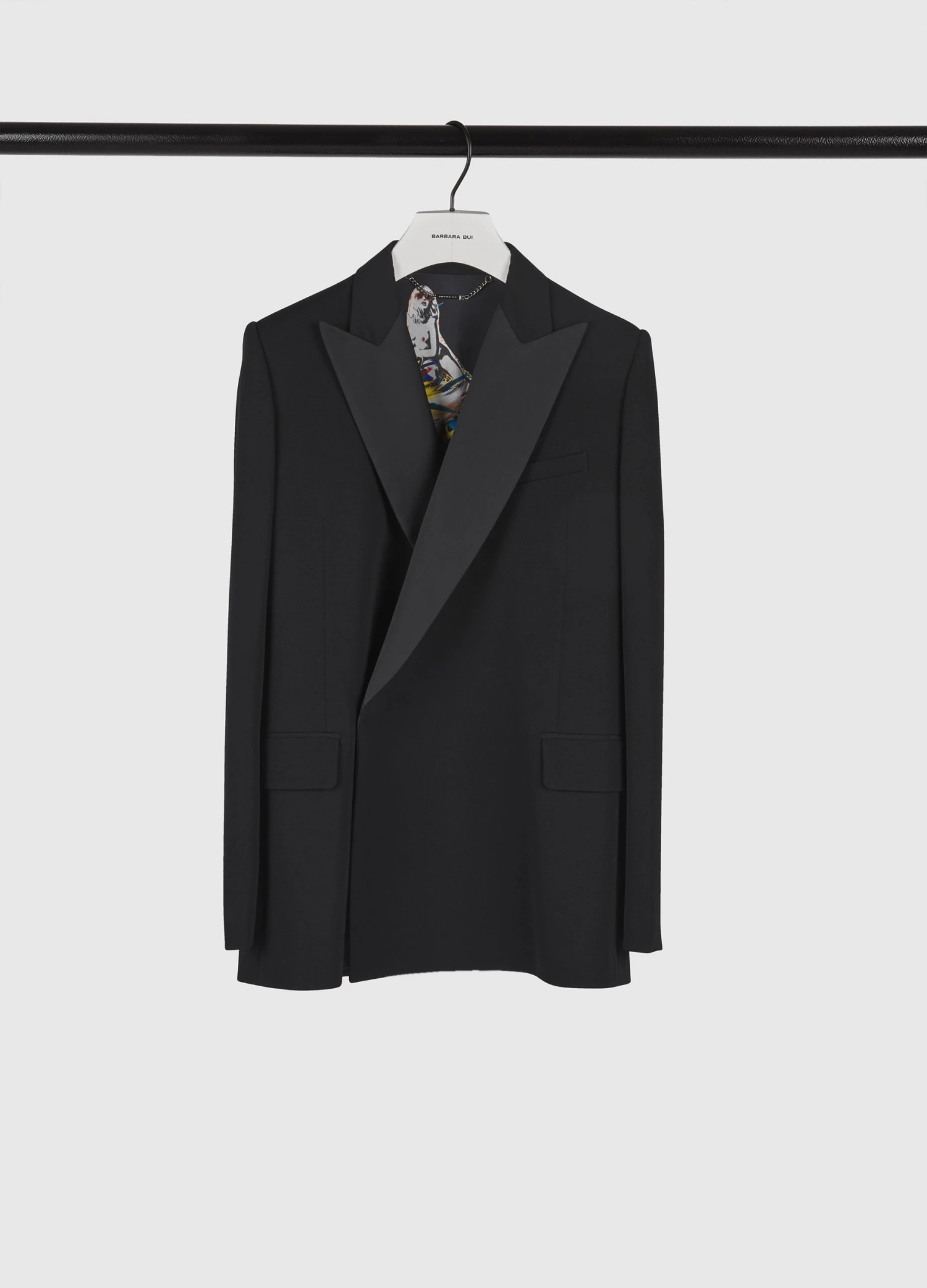 Veste blazer de smoking en laine grain de poudre au volume 80’s. Coupe ample et fermeture croisée asymétrique par un bouton caché et une patte côté. Col smoking en satin ton sur ton, poches poitrine et passepoilées à rabats.