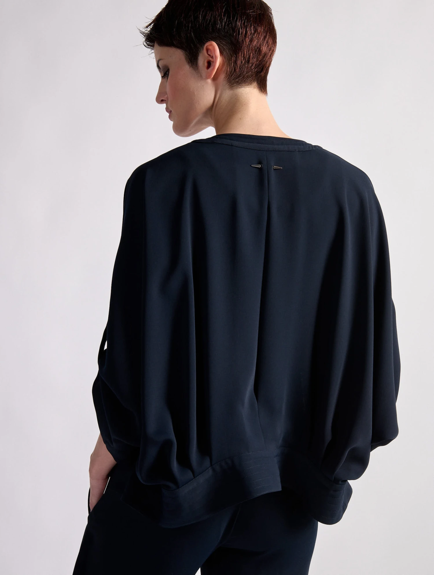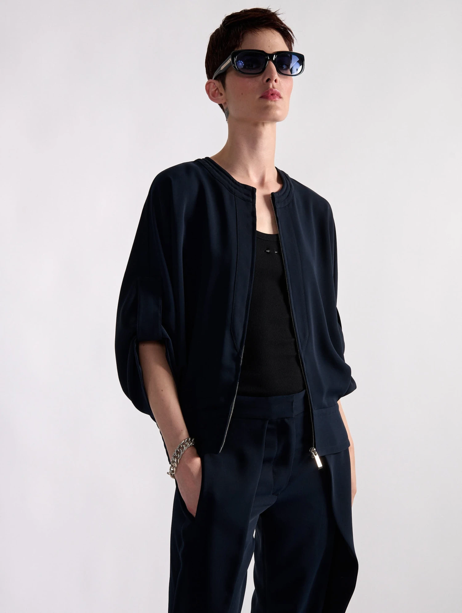 Ce blouson zippé en crêpe fluide et léger est une pièce idéale pour l’entrée de saison. Ses manches 3/4 sont retenues à l’aide d’une patte d’attache cousue tandis que son col rond matelassé et ses bords-côtes à la taille assurent un tomber impeccablement structuré. Porté fermé associé à notre pantalon à jeux de plis, ce blouson fin compose un look en trompe l’oeil façon combinaison pantalon, tenue idéale pour une cérémonie ou une soirée d’été habillée.