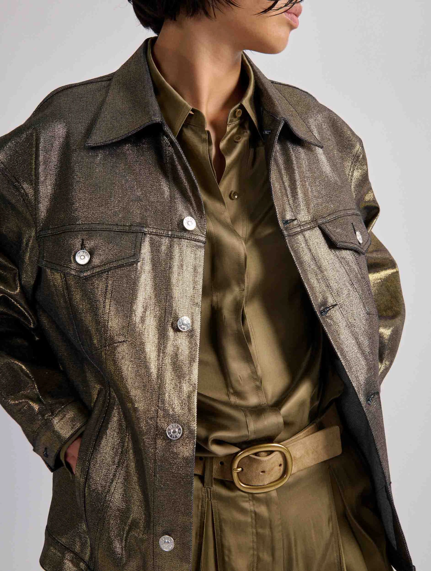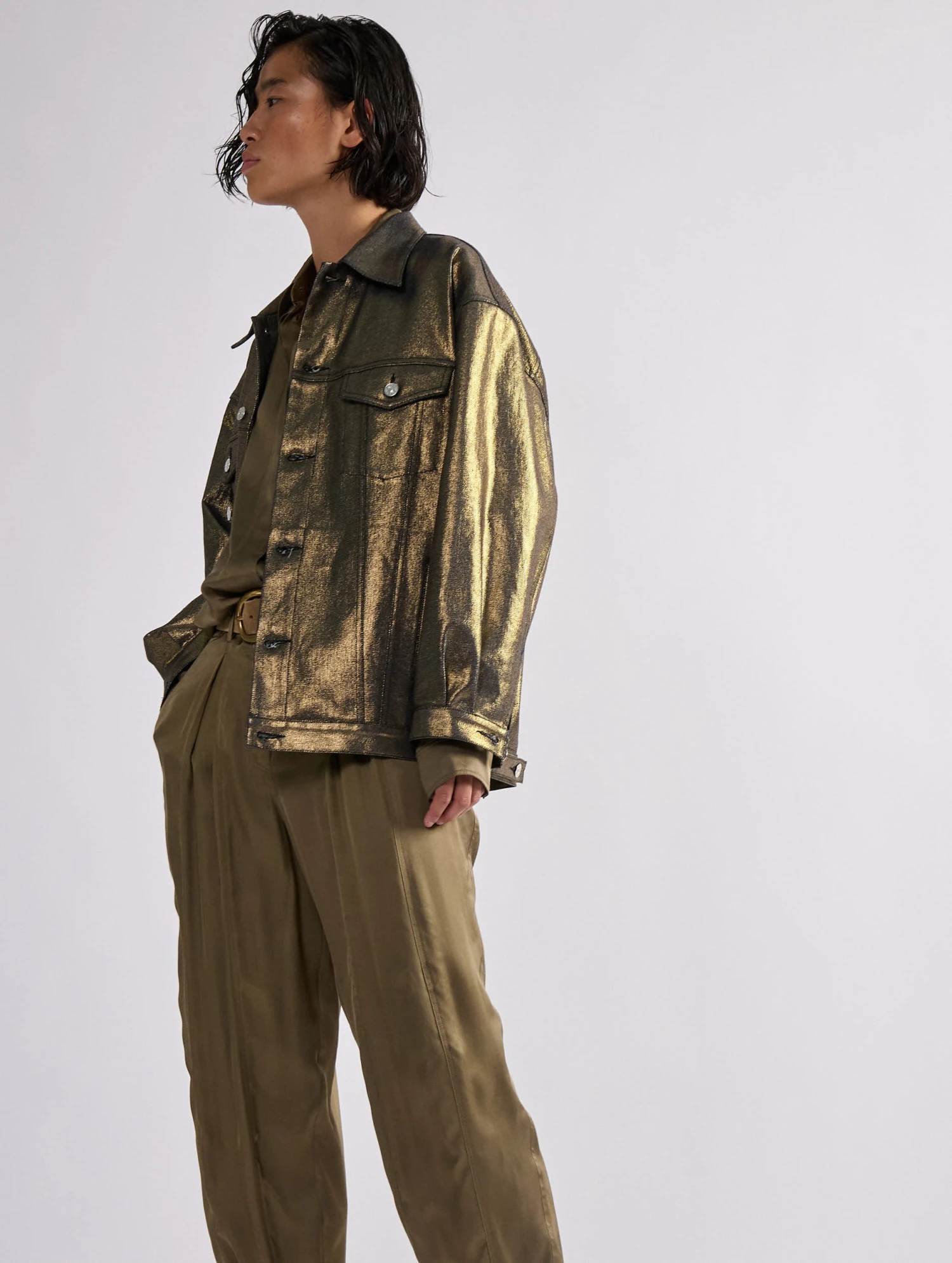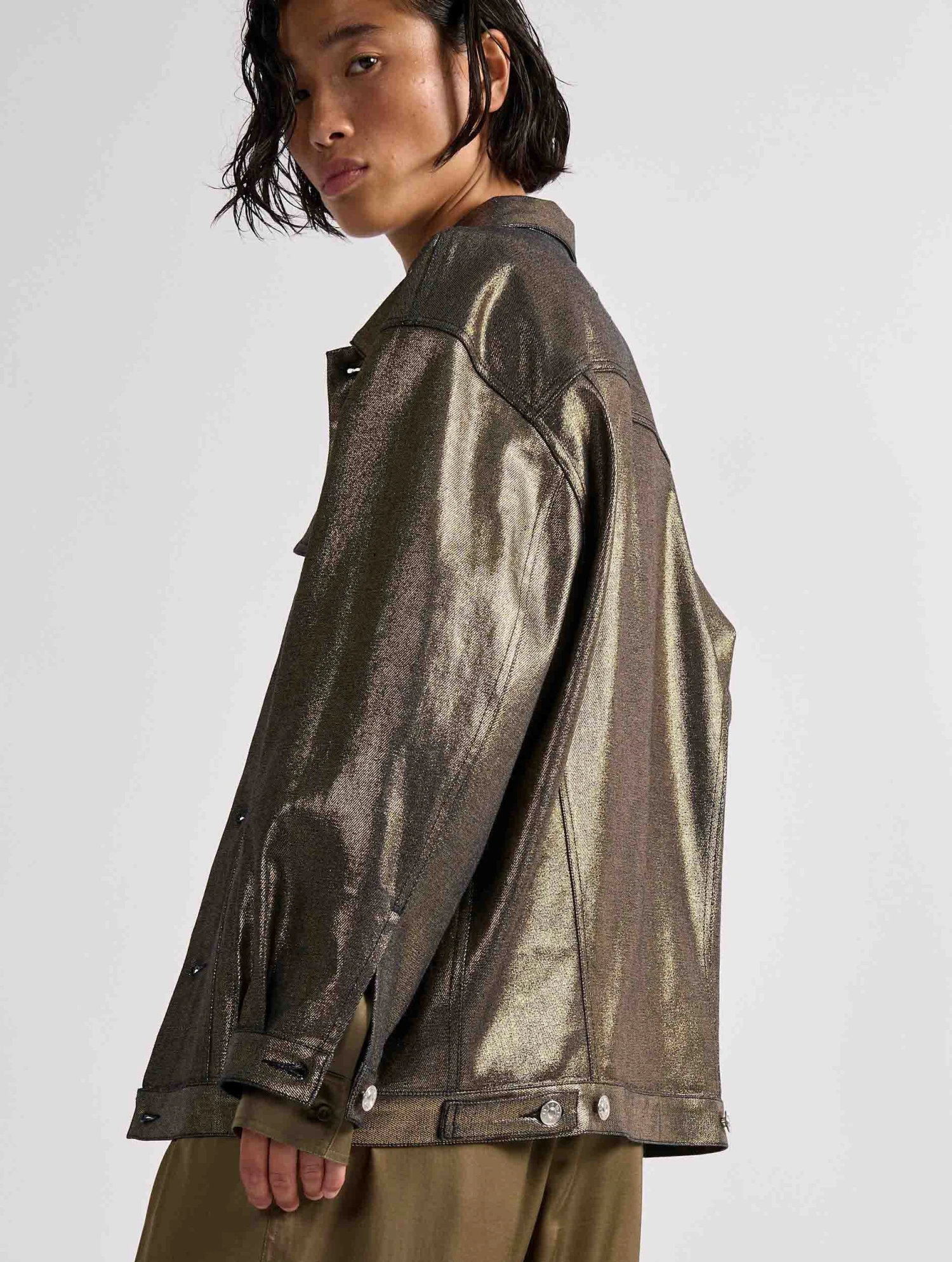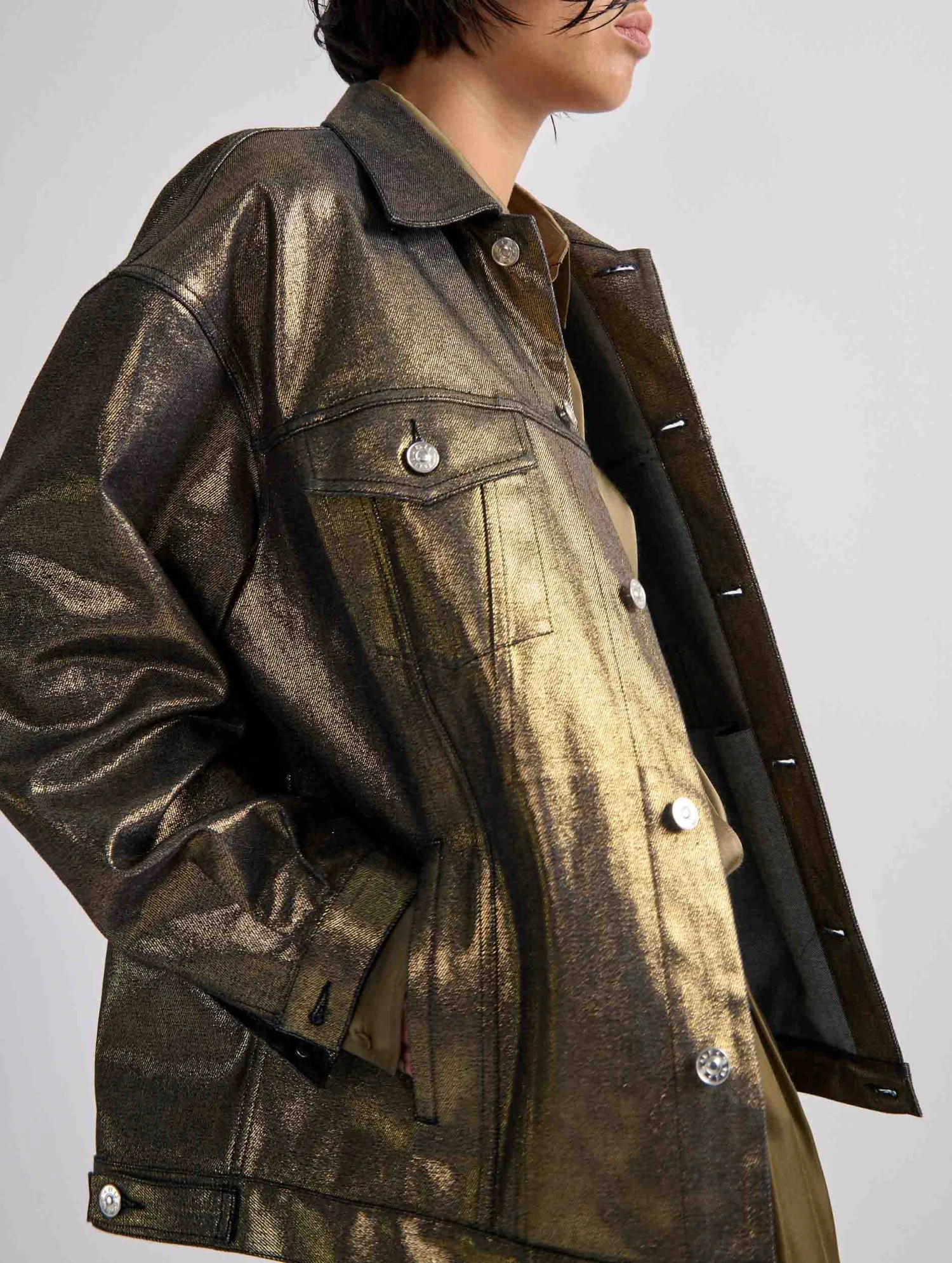 Cette saison, le blouson en denim est détourné dans une audacieuse version en denim résiné noir ou gold. Réalisé dans une coupe oversized, ce blouson comporte tous les codes du blouson en denim : 2 poches plaquées, des boutons en métal siglés sur la patte de boutonnage, en bordure de taille et aux poignets. Chic et décontracté, ce modèle s’invite sur un total look denim ou détourne une tenue plus sophistiquée le soir venu.