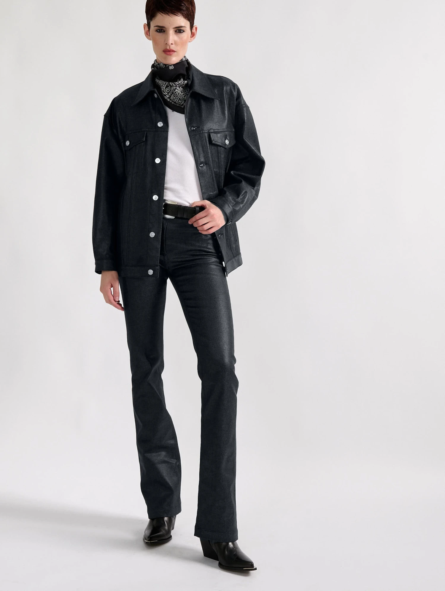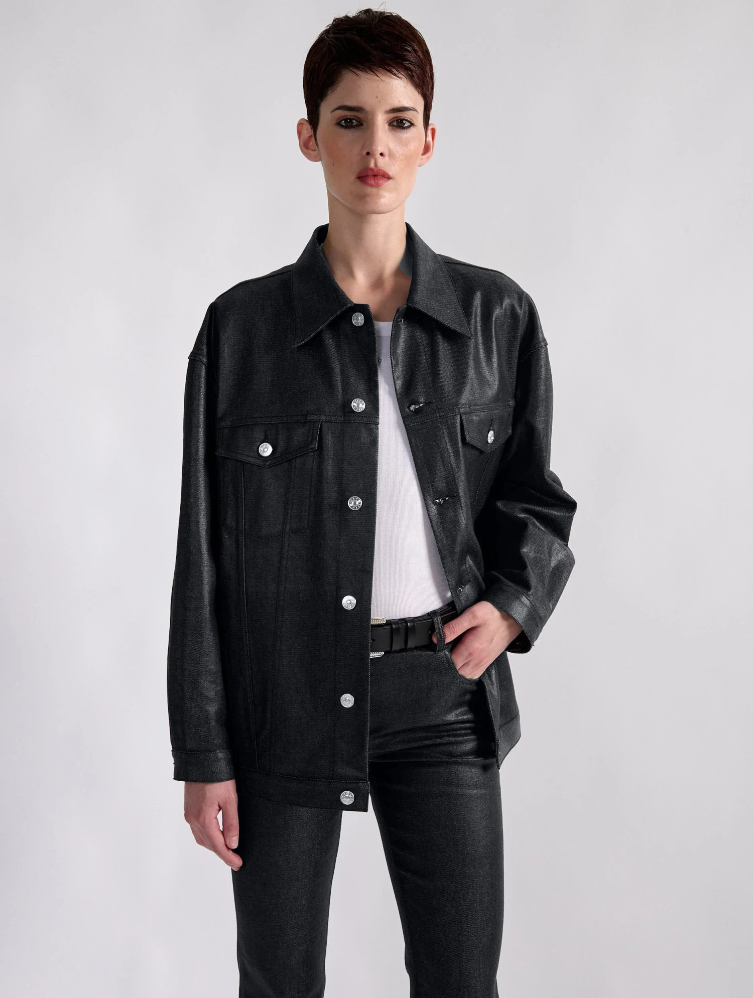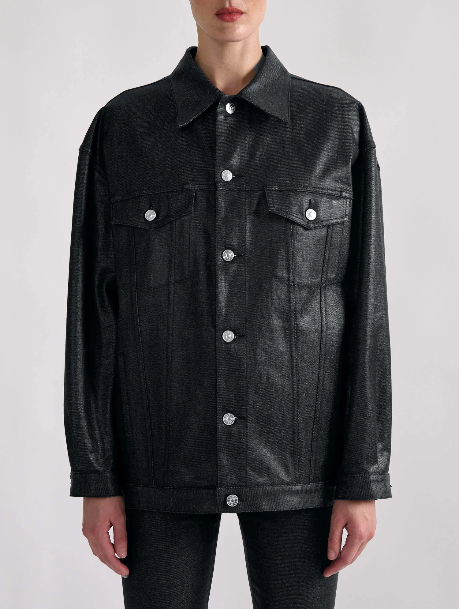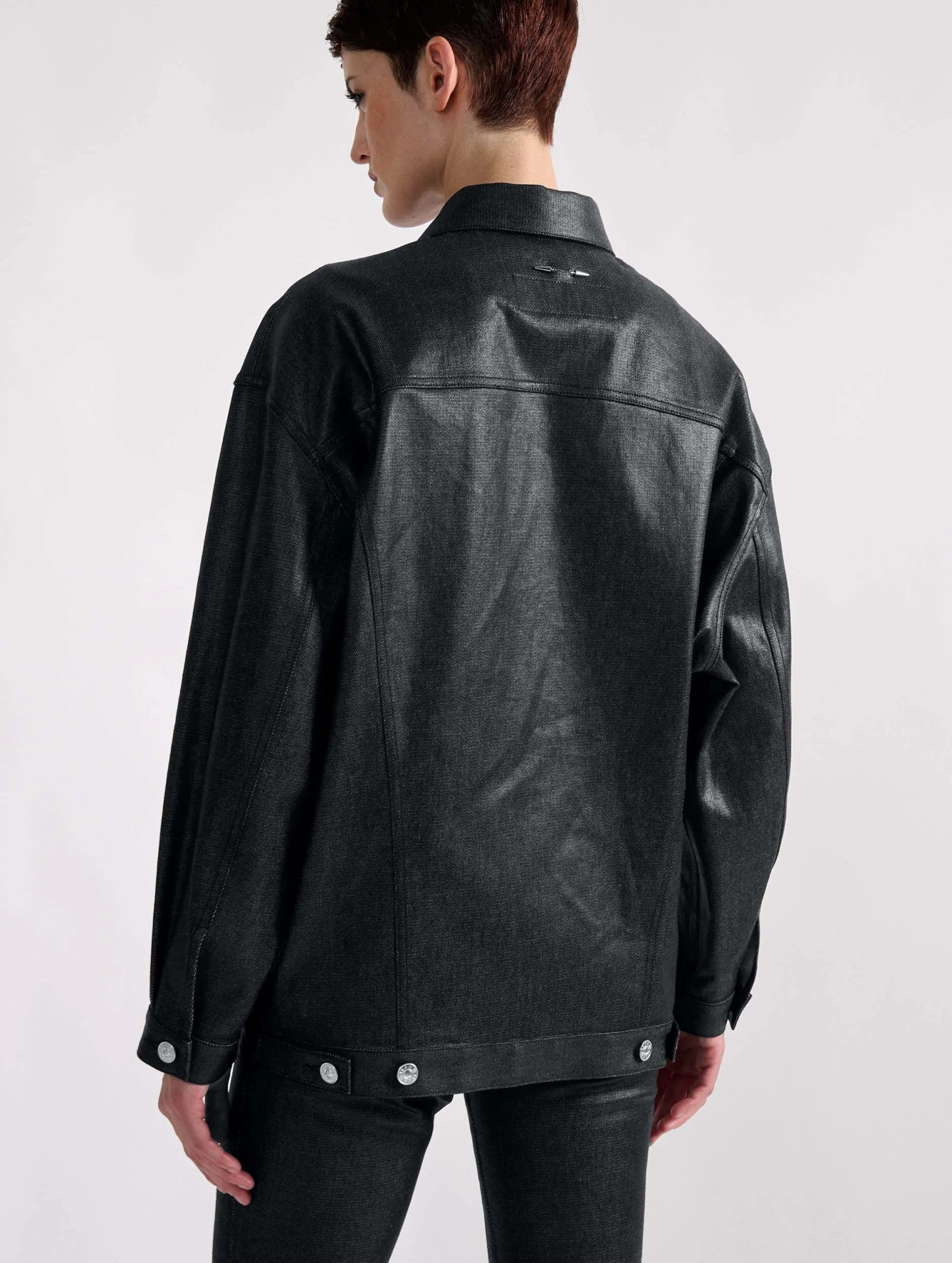 Cette saison, le blouson en denim est détourné dans une audacieuse version en denim résiné noir ou gold. Réalisé dans une coupe oversized, ce blouson comporte tous les codes du blouson en denim : 2 poches plaquées, des boutons en métal siglés sur la patte de boutonnage, en bordure de taille et aux poignets. Chic et décontracté, ce modèle s’invite sur un total look denim ou détourne une tenue plus sophistiquée le soir venu.