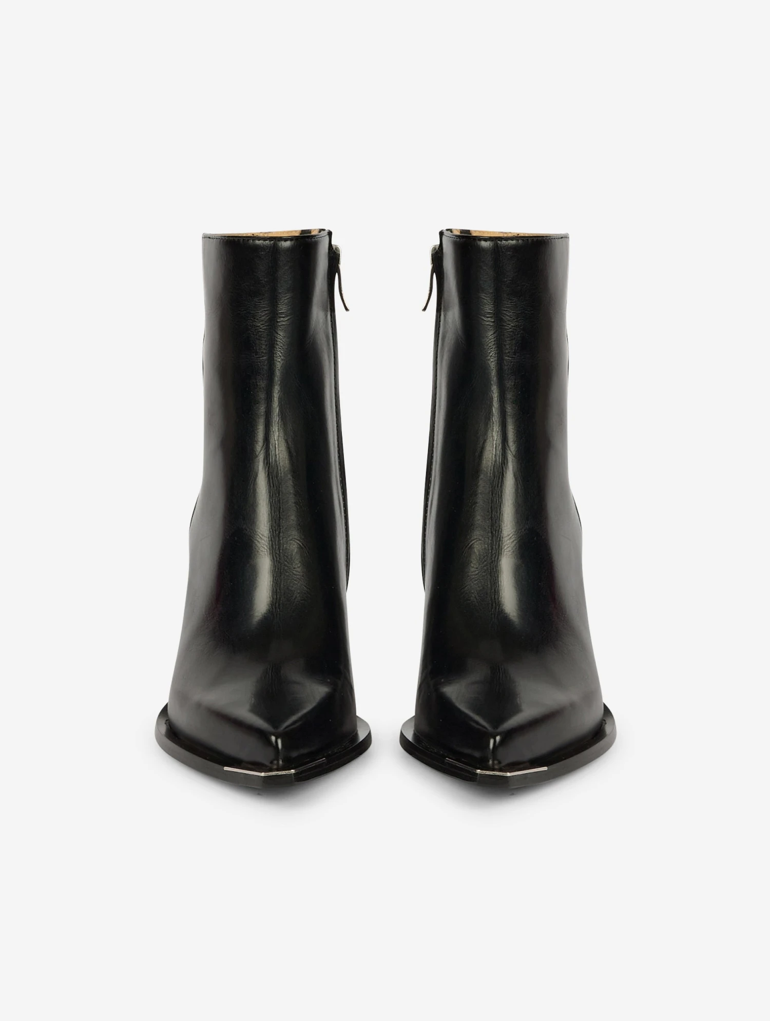 Boots zippés en cuir brillant noir. Forme « santiag » féminisée par un talon de 7,5 cm, large semelle graphique soulignée en pointe par une plaque de métal.