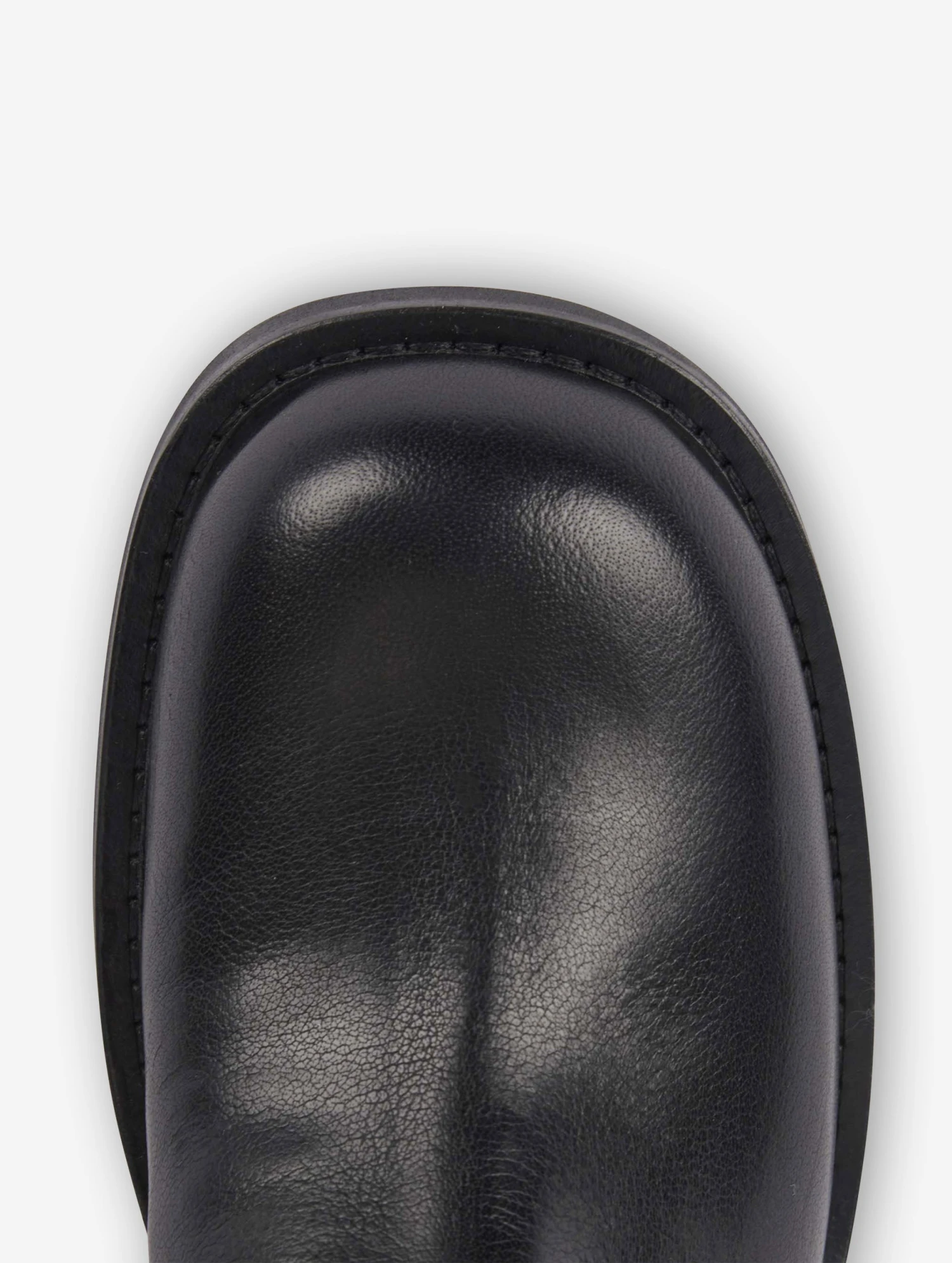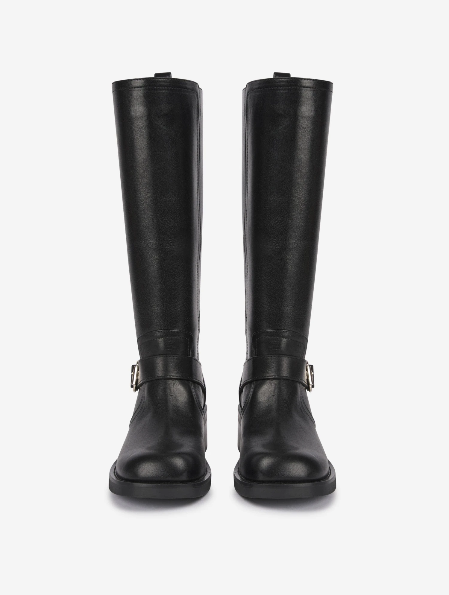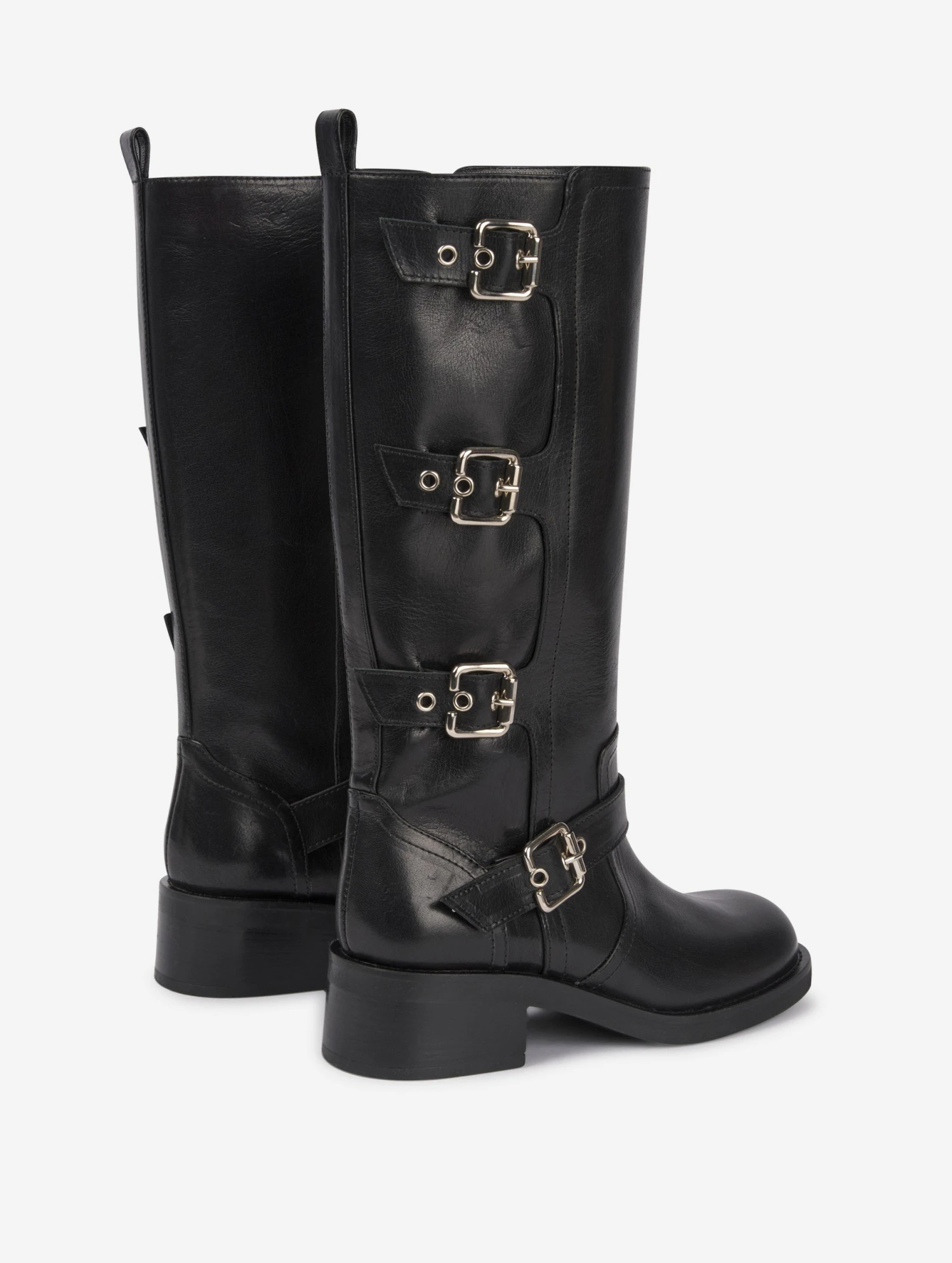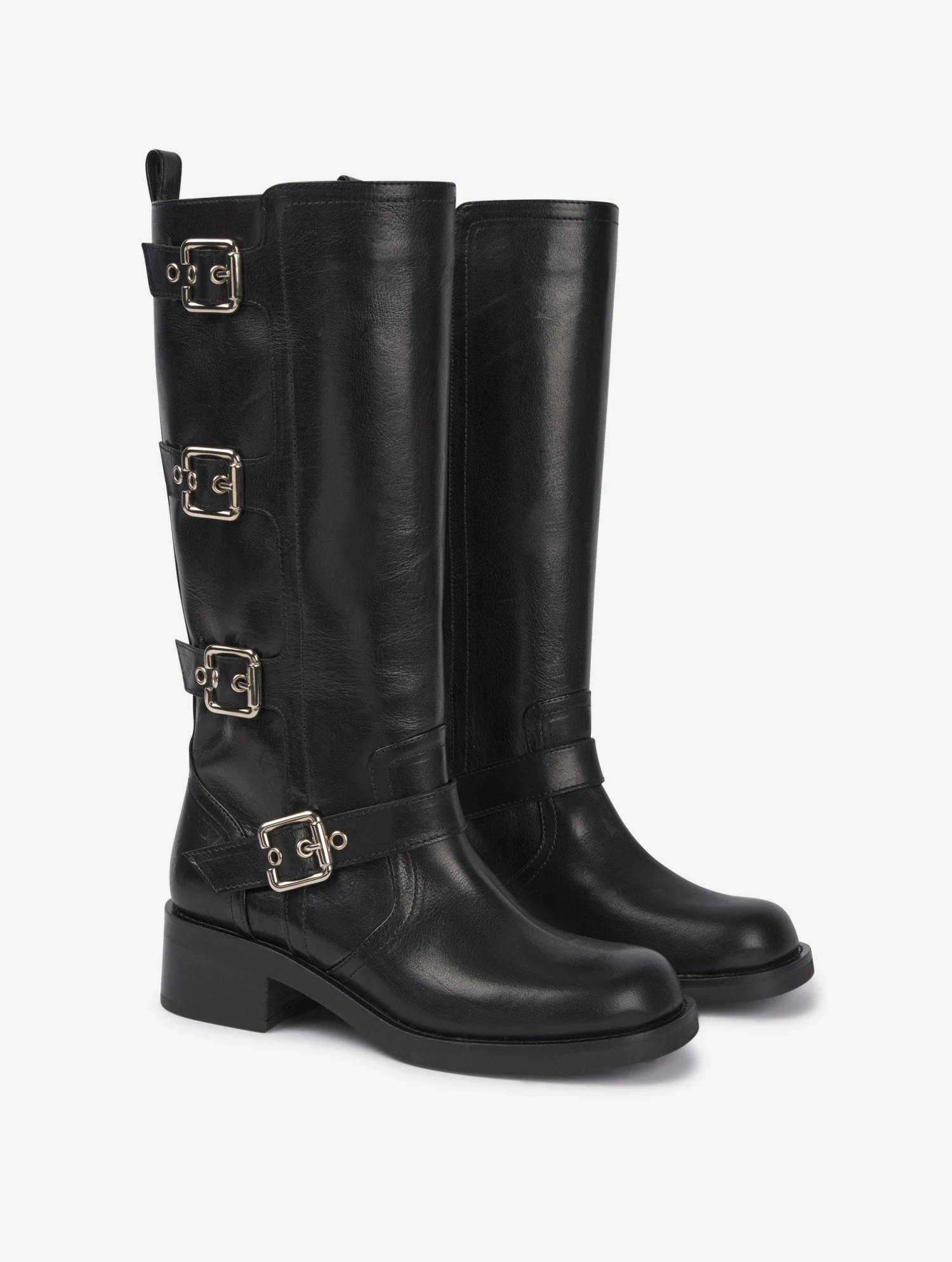 Bottes d’inspiration bikers en cuir de buffle noir finition glacée. Fausse ouverture latérale animée de ceintures et de boucles. Confortable semelle gomme d’inspiration masculine avec talon de 5 cm.