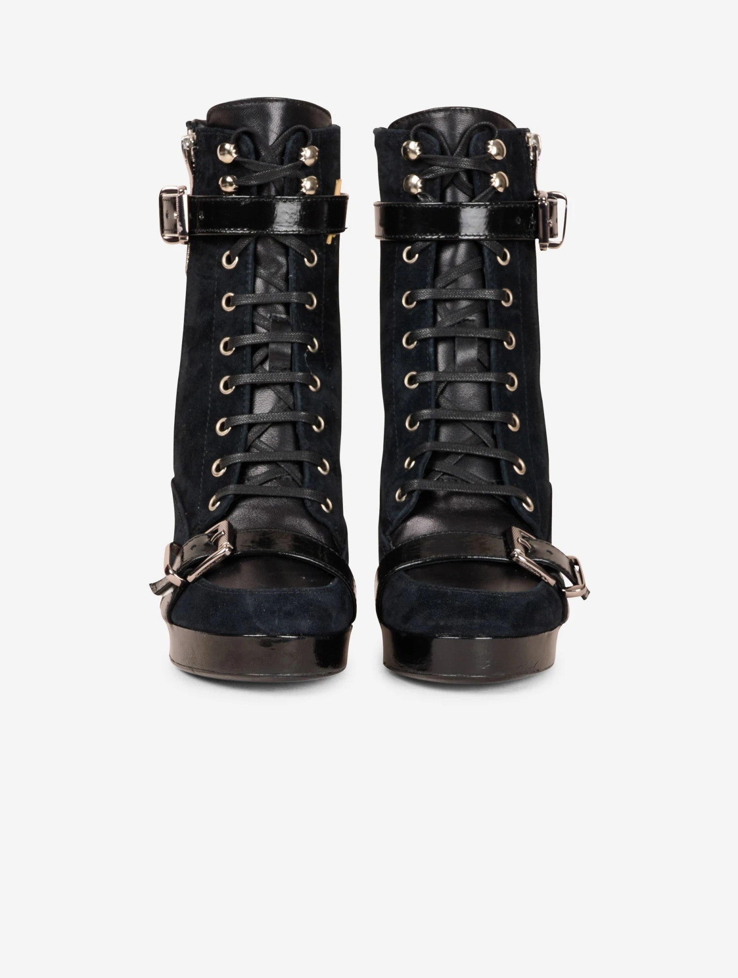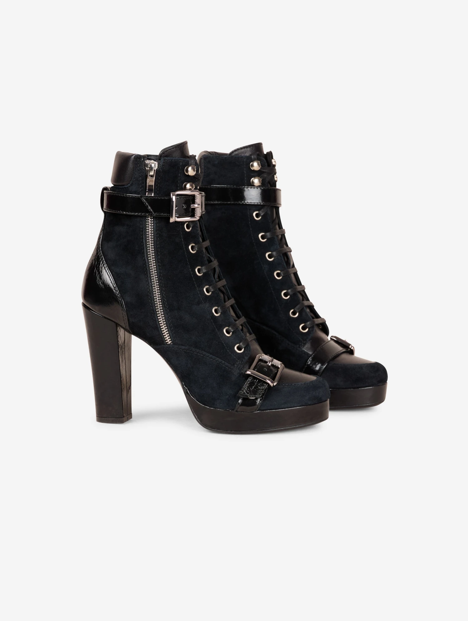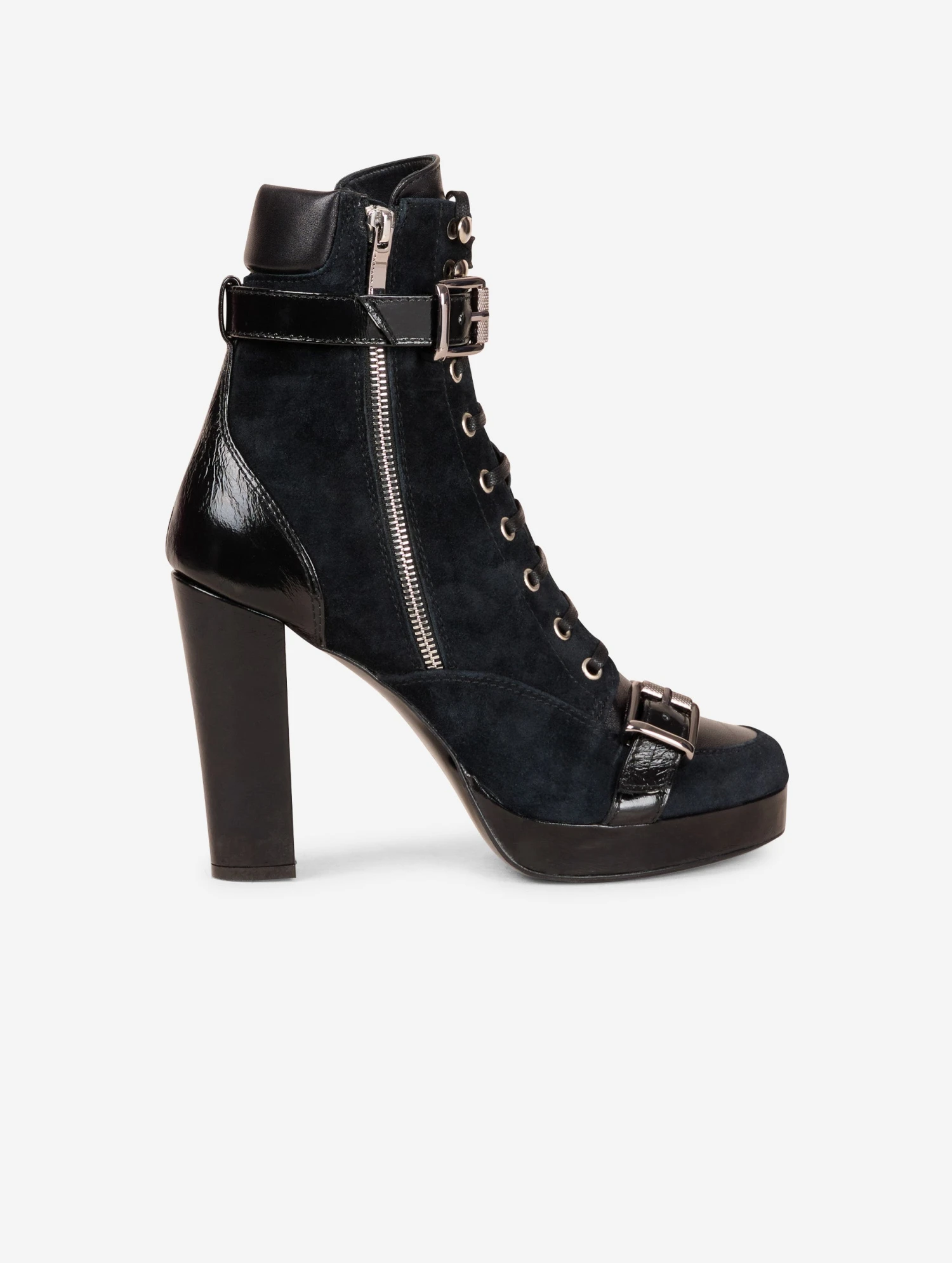 Bottines en veau velours noir, dessus et languette en cuir nappa ton sur ton. Renfort cheville et sangles à boucle métal en cuir verni naplak ton sur ton. Zip extérieur pour faciliter l’enfilage. Semelle à plateau de 2,5 cm et talon de 10,5 cm recouverts en cuir verni naplak ton sur ton.