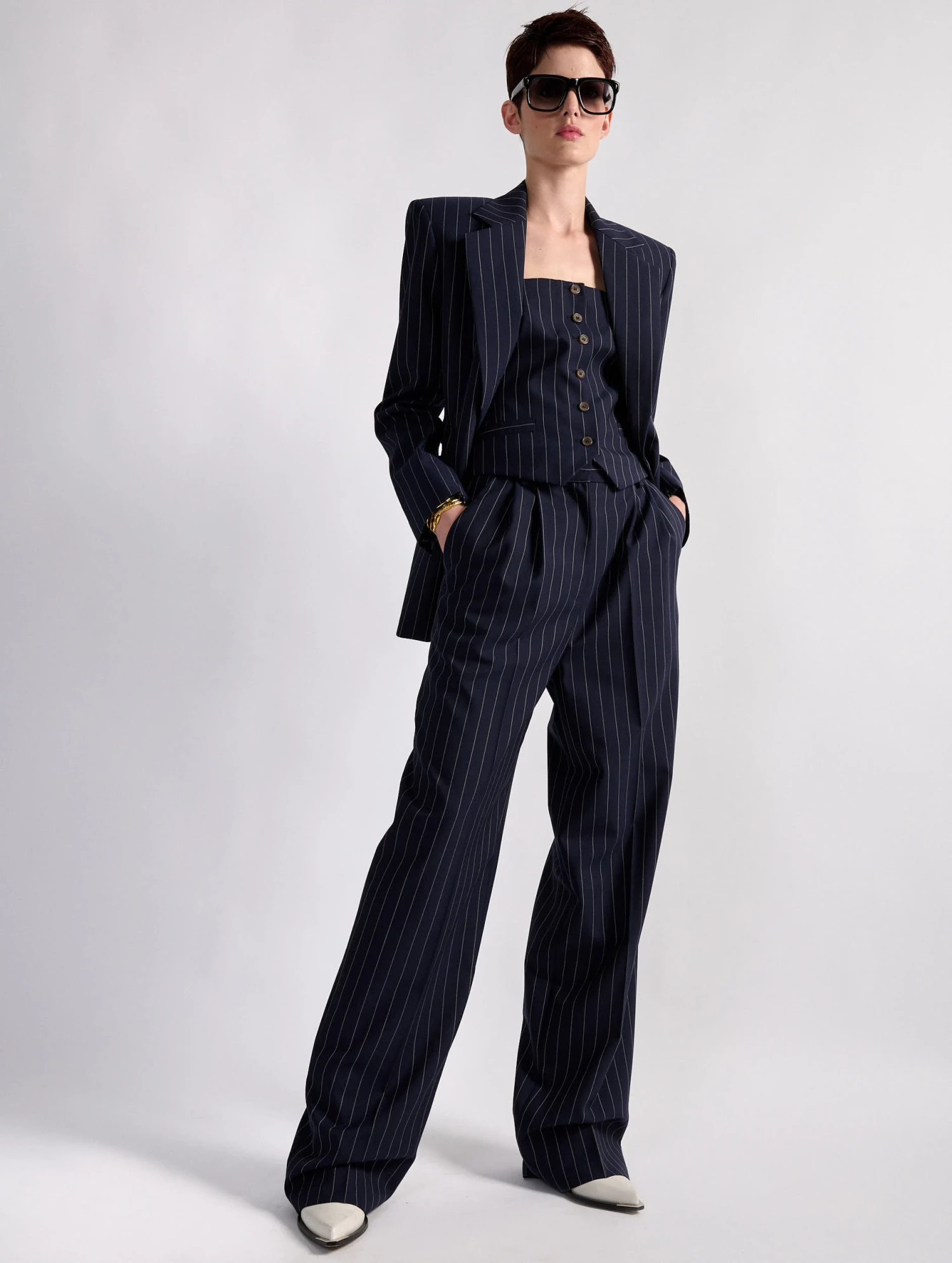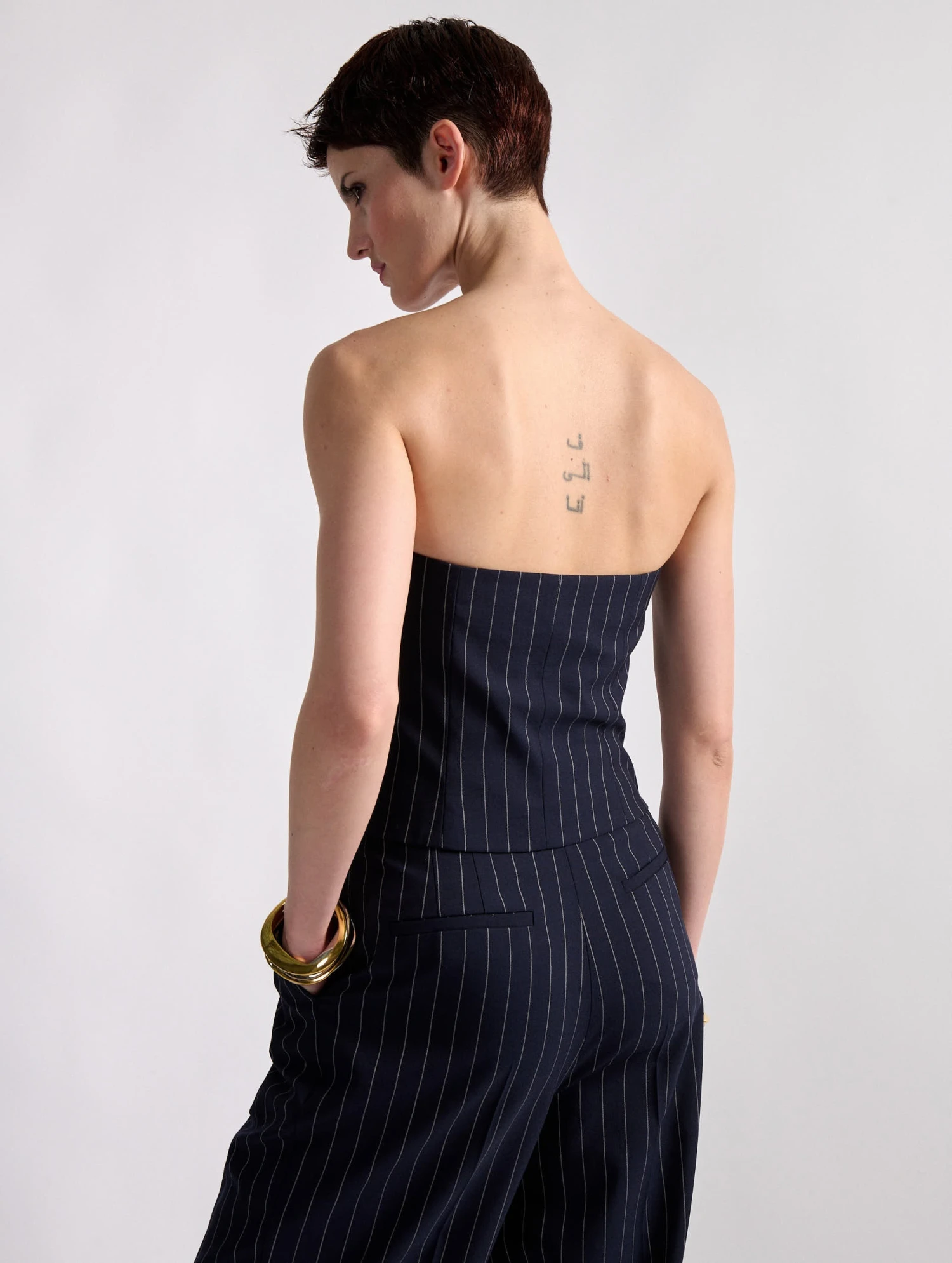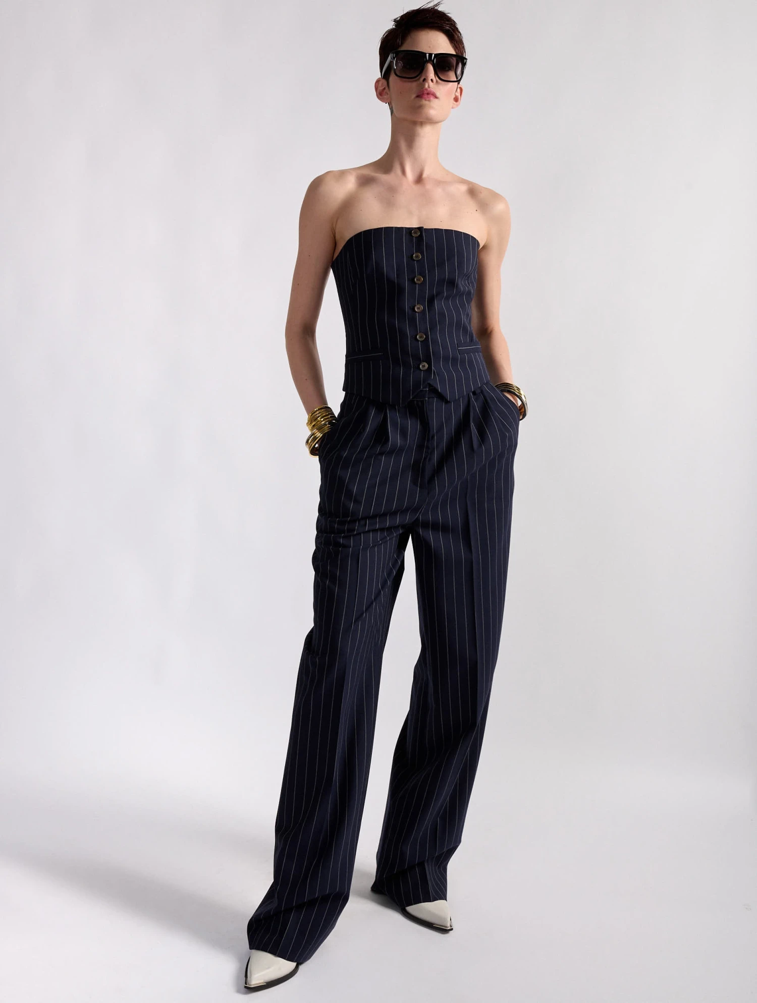 L’amour du tailoring porte chaque saison Barbara Bui vers la réinterprétation du costume-trois-pièces masculin. Détourné, féminisé, le gilet de costume devient un bustier seyant à l’élégante rayure tennis. Porté avec le pantalon à plis taille haute et la veste de costume assortis, ou superposé à une chemise en popeline de coton blanche, ce bustier rayé fait avec succès la synthèse des codes féminins-masculins.