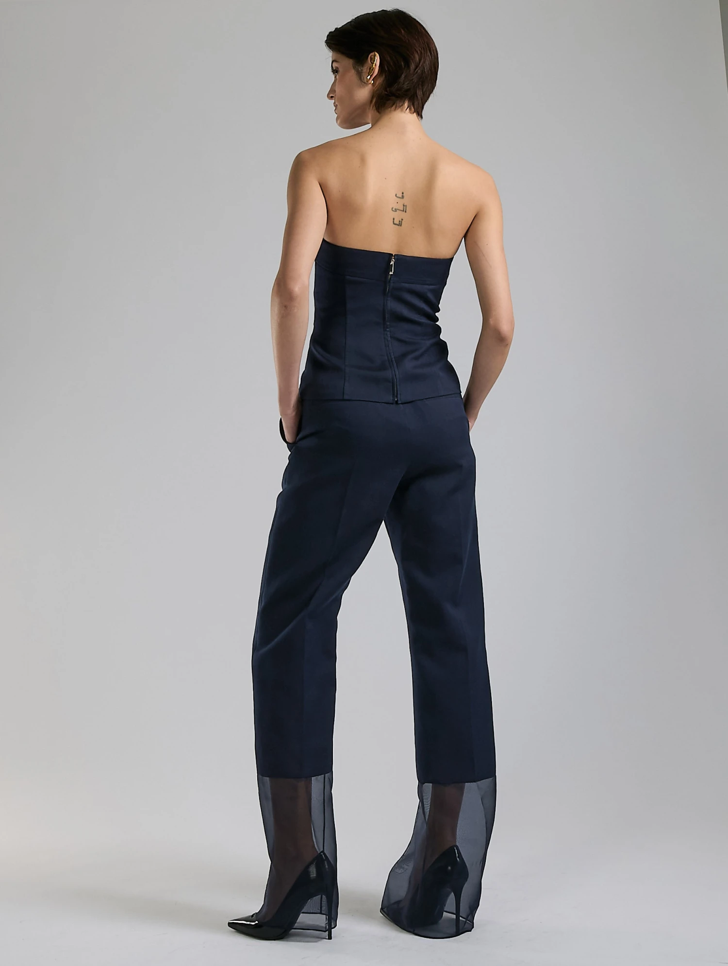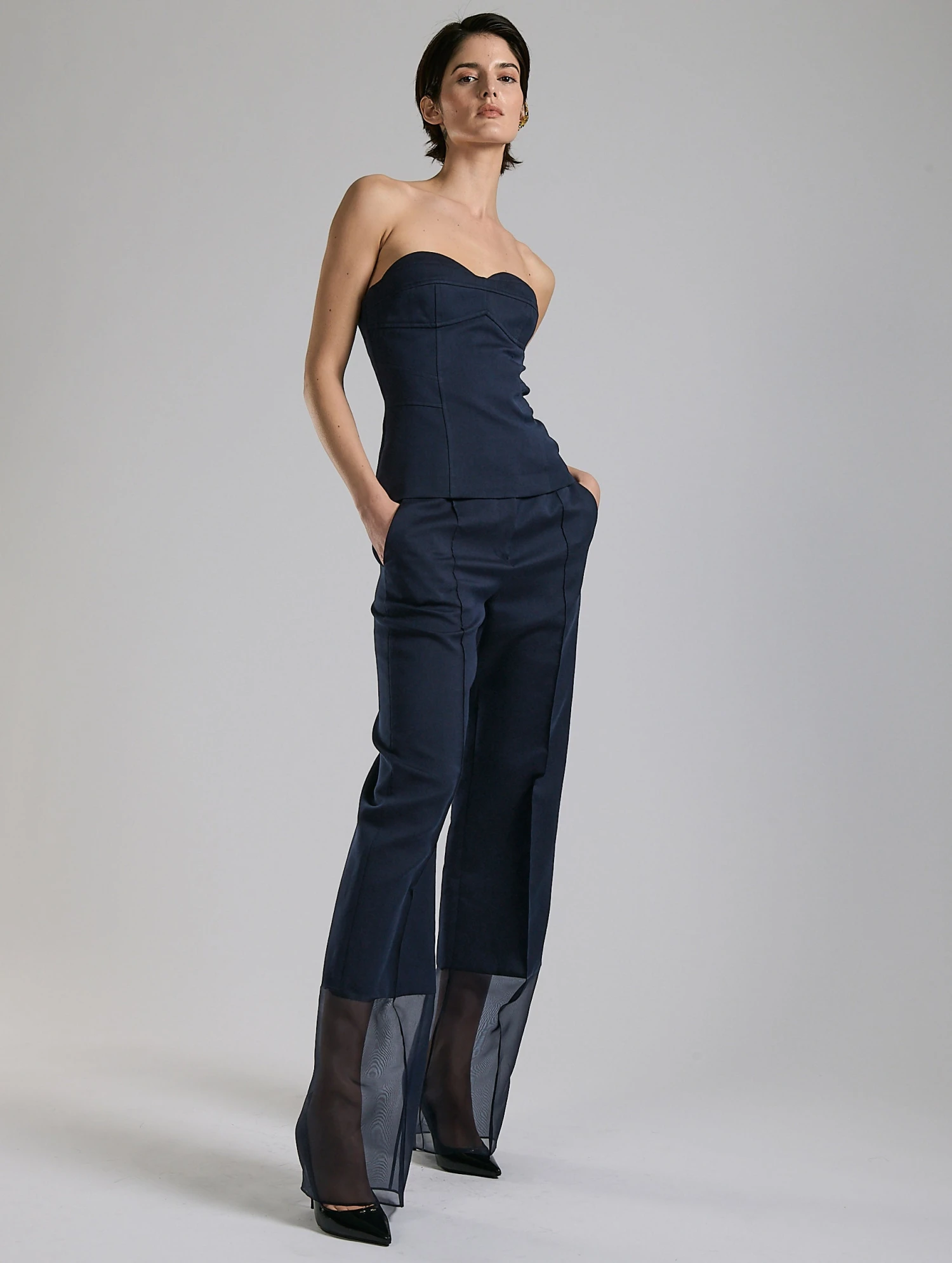 Proposé dans une teinte nude ou en marine intemporel, ce bustier à la structure soignée s’accorde au pantalon assorti contrastant élégamment avec la légèreté de l’organza transparent en bas de jambe pour un look façon combinaison pantalon. La construction de cette pièce aux inspirations couture est mise en valeur par ses jeux de découpes soulignés de surpiqûres ton sur ton. Doté d’une fermeture zippée dans le dos pour un porté facilité, ce bustier sublime le corps féminin tout en assurant un maintien parfait.