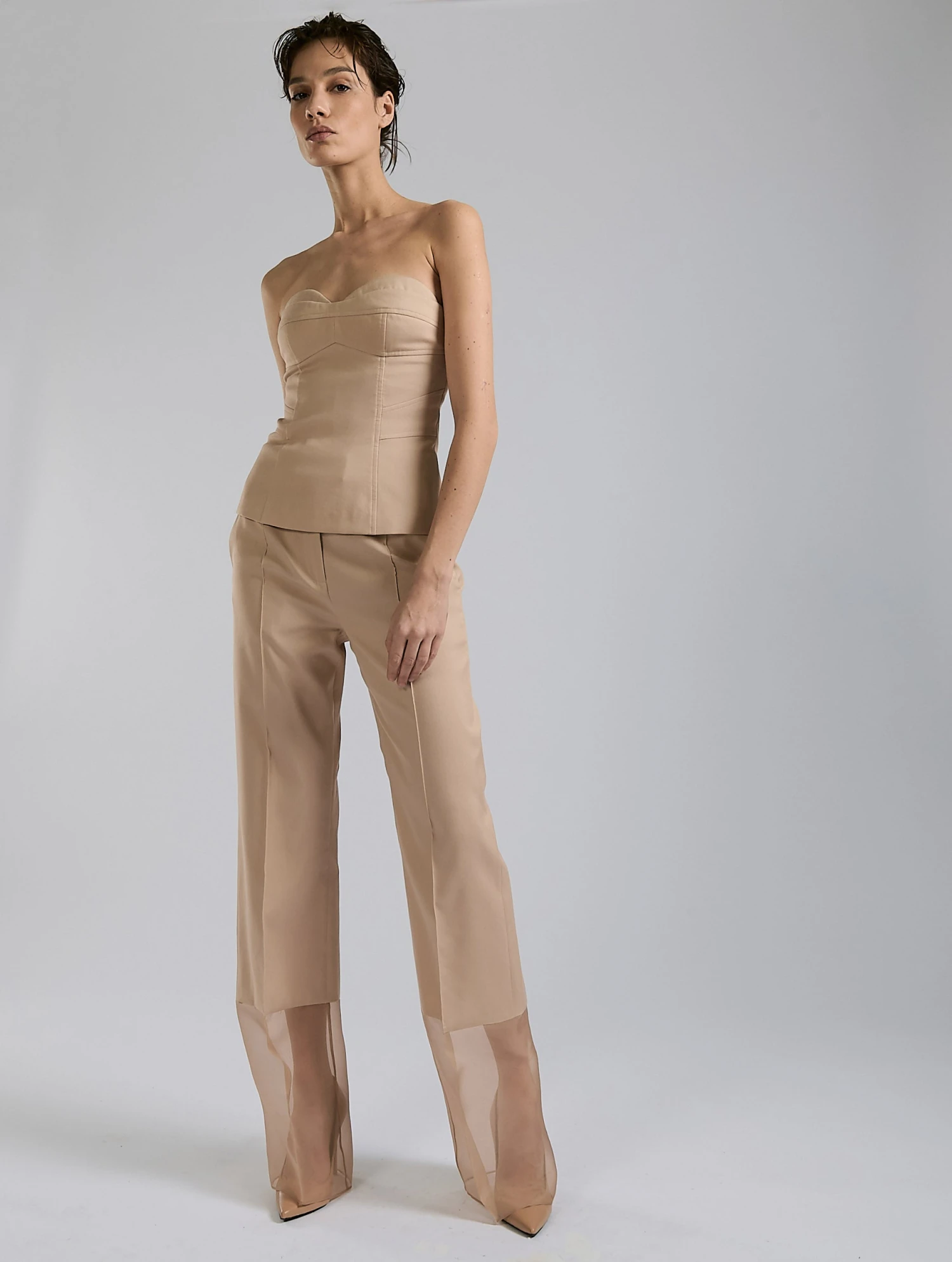 Proposé dans une teinte nude ou en marine intemporel, ce bustier à la structure soignée s’accorde au pantalon assorti contrastant élégamment avec la légèreté de l’organza transparent en bas de jambe pour un look façon combinaison pantalon. La construction de cette pièce aux inspirations couture est mise en valeur par ses jeux de découpes soulignés de surpiqûres ton sur ton. Doté d’une fermeture zippée dans le dos pour un porté facilité, ce bustier sublime le corps féminin tout en assurant un maintien parfait.