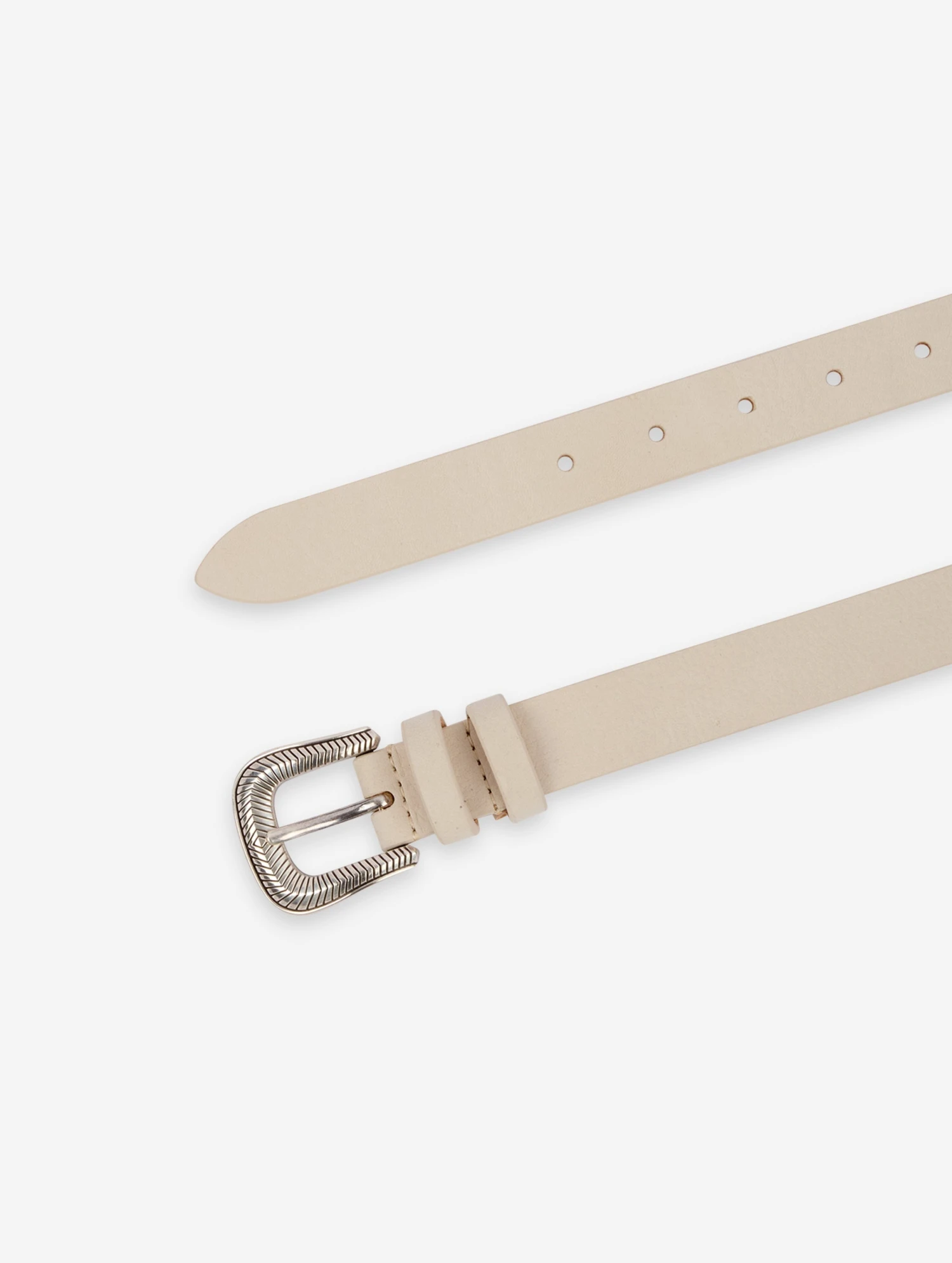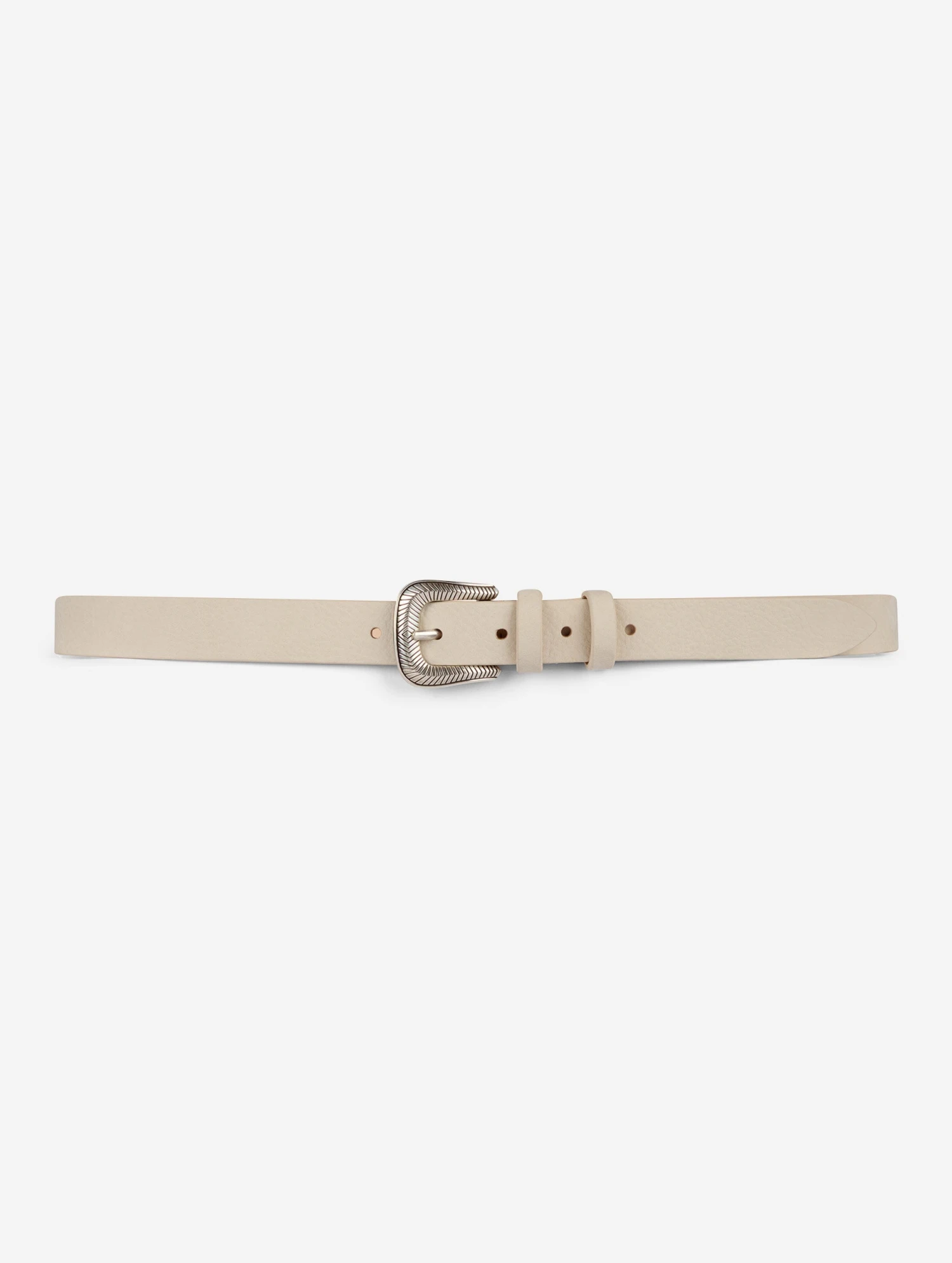 Ceinture fine en veau nubucké ivoire. Boucle western en métal finition argent vieilli. Réglage 5 trous, hauteur 25 mm.
