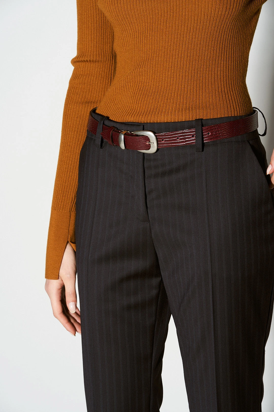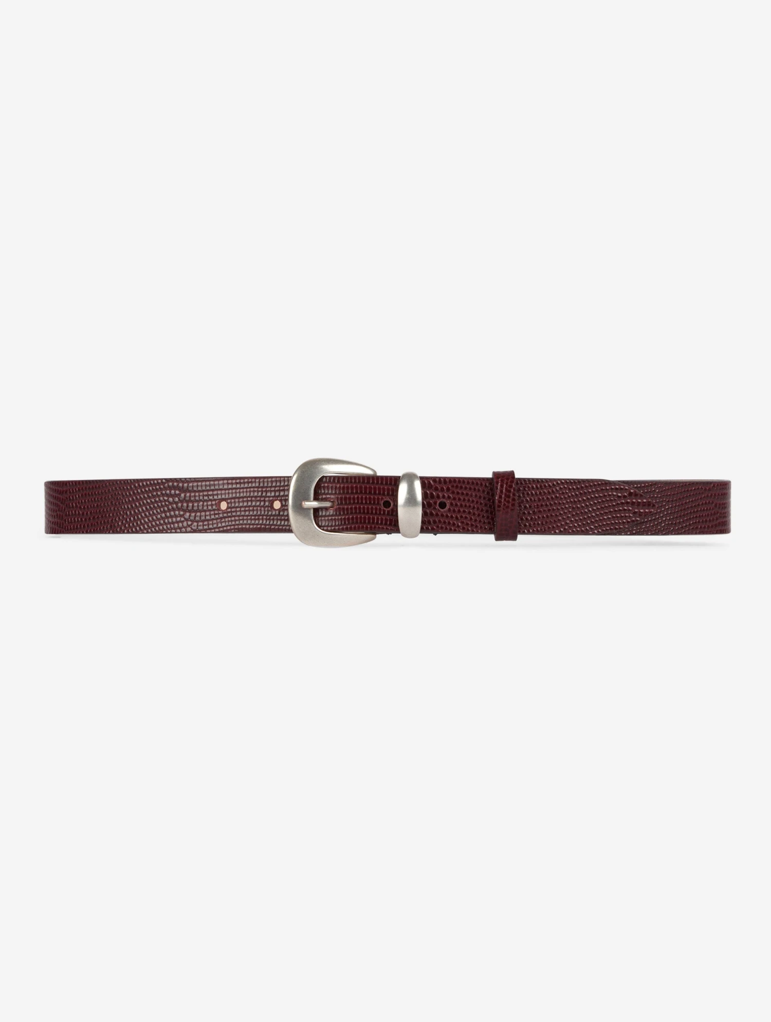 Ceinture fine en cuir gaufré lézard bordeaux. Boucle et un passant en métal d’esprit western finition vieil argent. Passant supplémentaire en cuir, réglage 5 trous. Hauteur 2,5 cm.