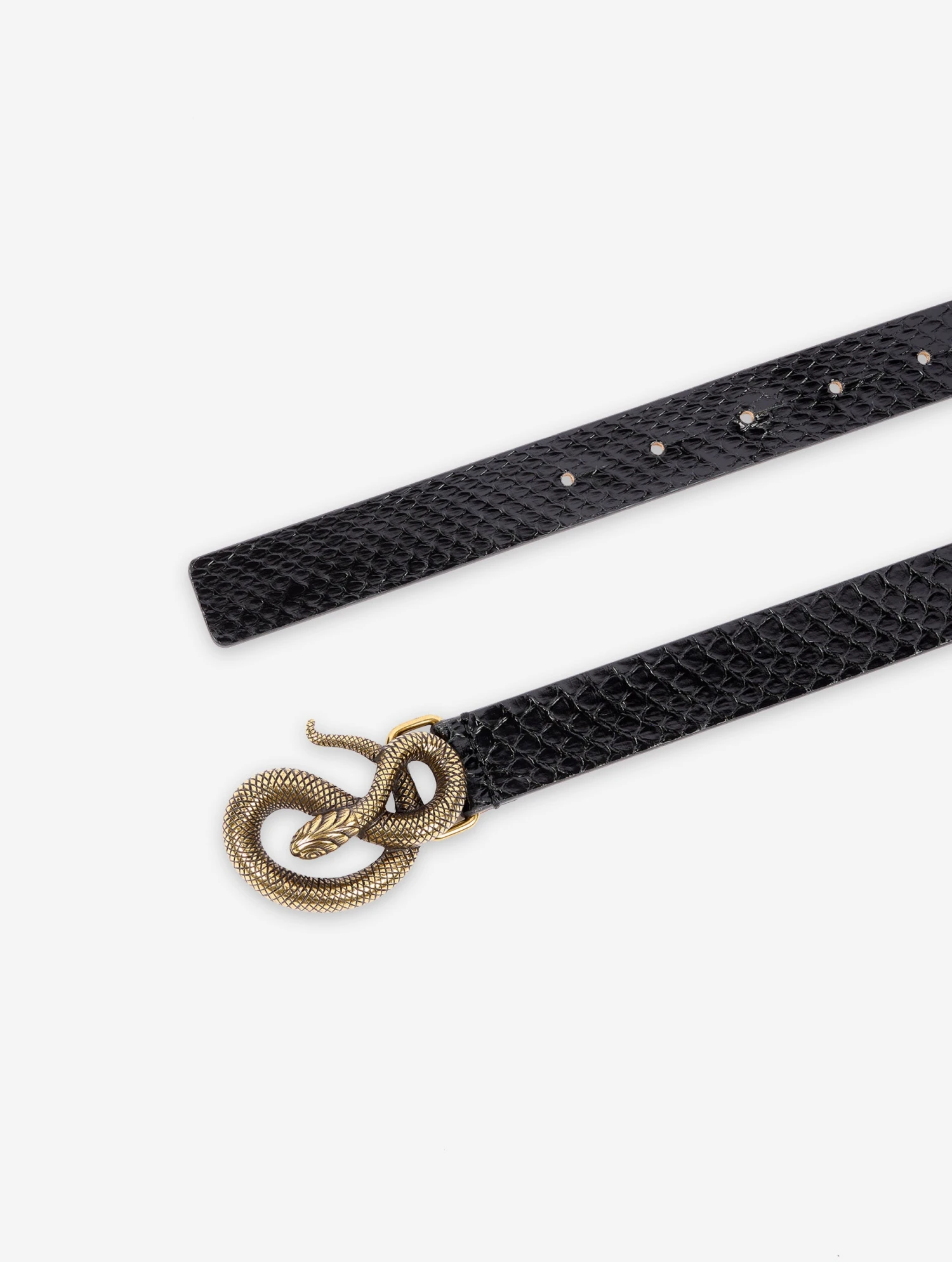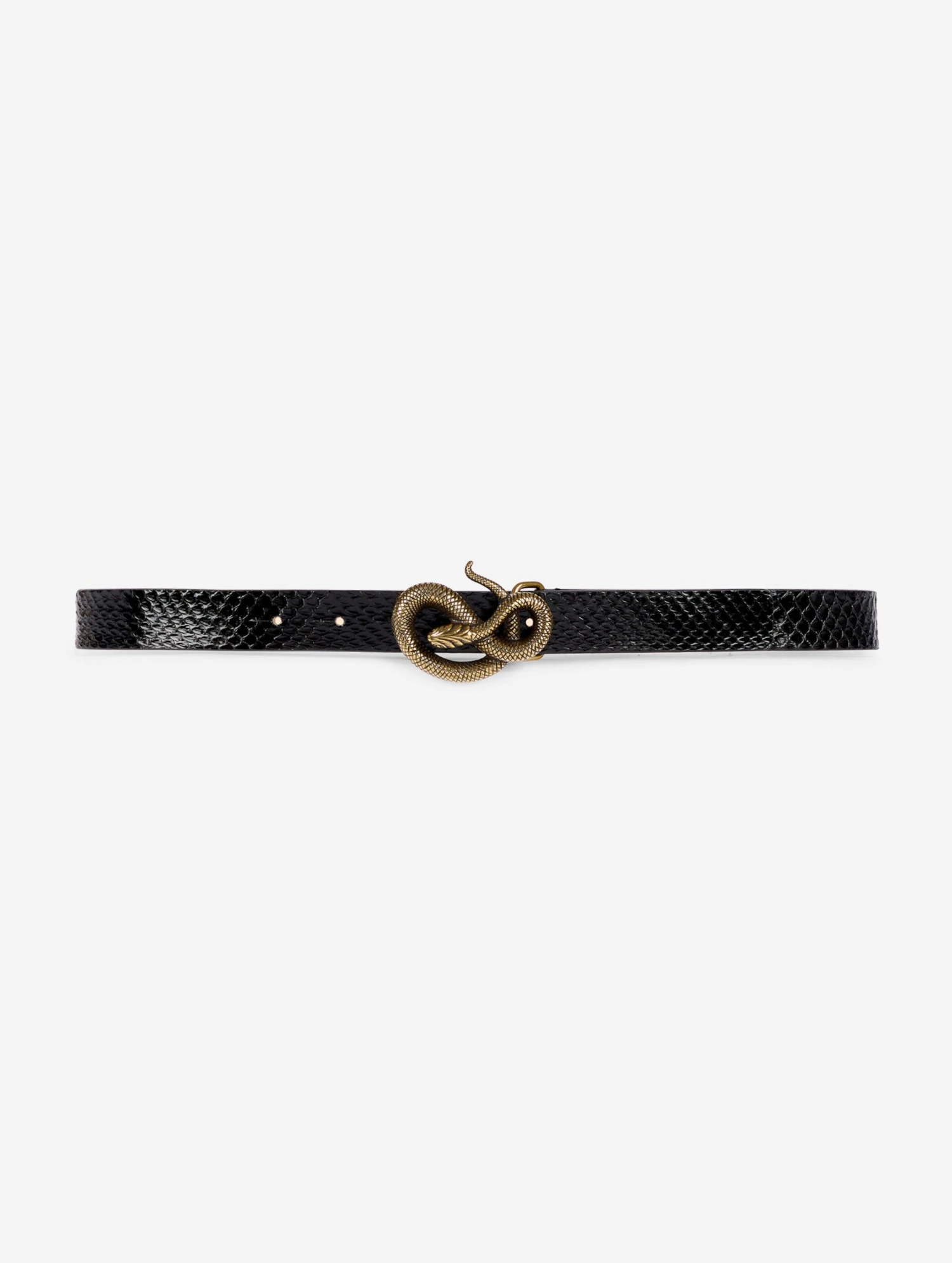 Ceinture fine en serpent d’eau noir. Boucle figurative en forme de serpent finition laiton vieilli, clin d’œil à la prochaine année astrologique chinoise. Réglage 5 trous, hauteur 25 mm.