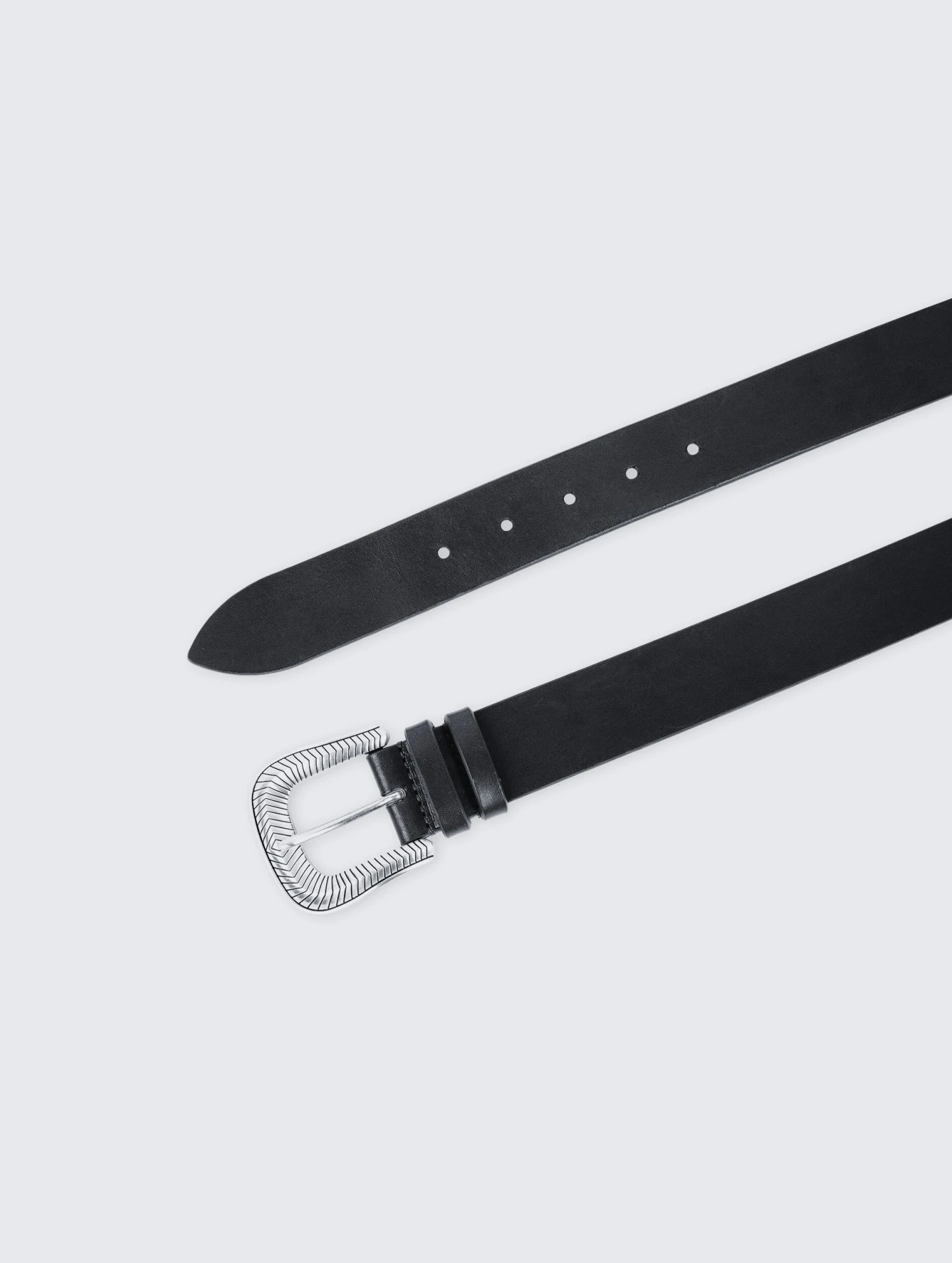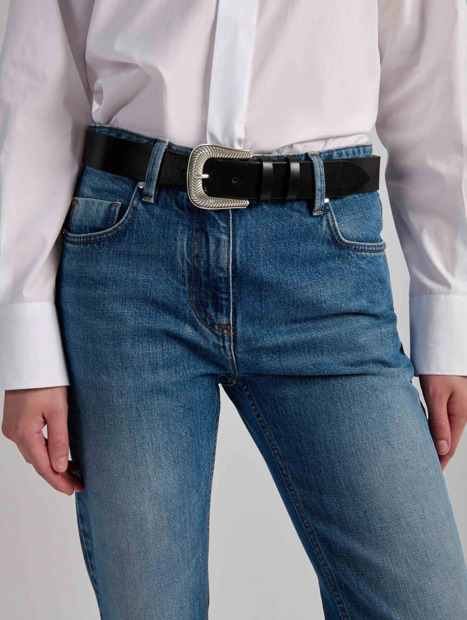 Ceinture moyenne en cuir tannage végétal noir brillant. Boucle western en métal finition argent vieilli. Réglage 5 trous, hauteur 35 mm.