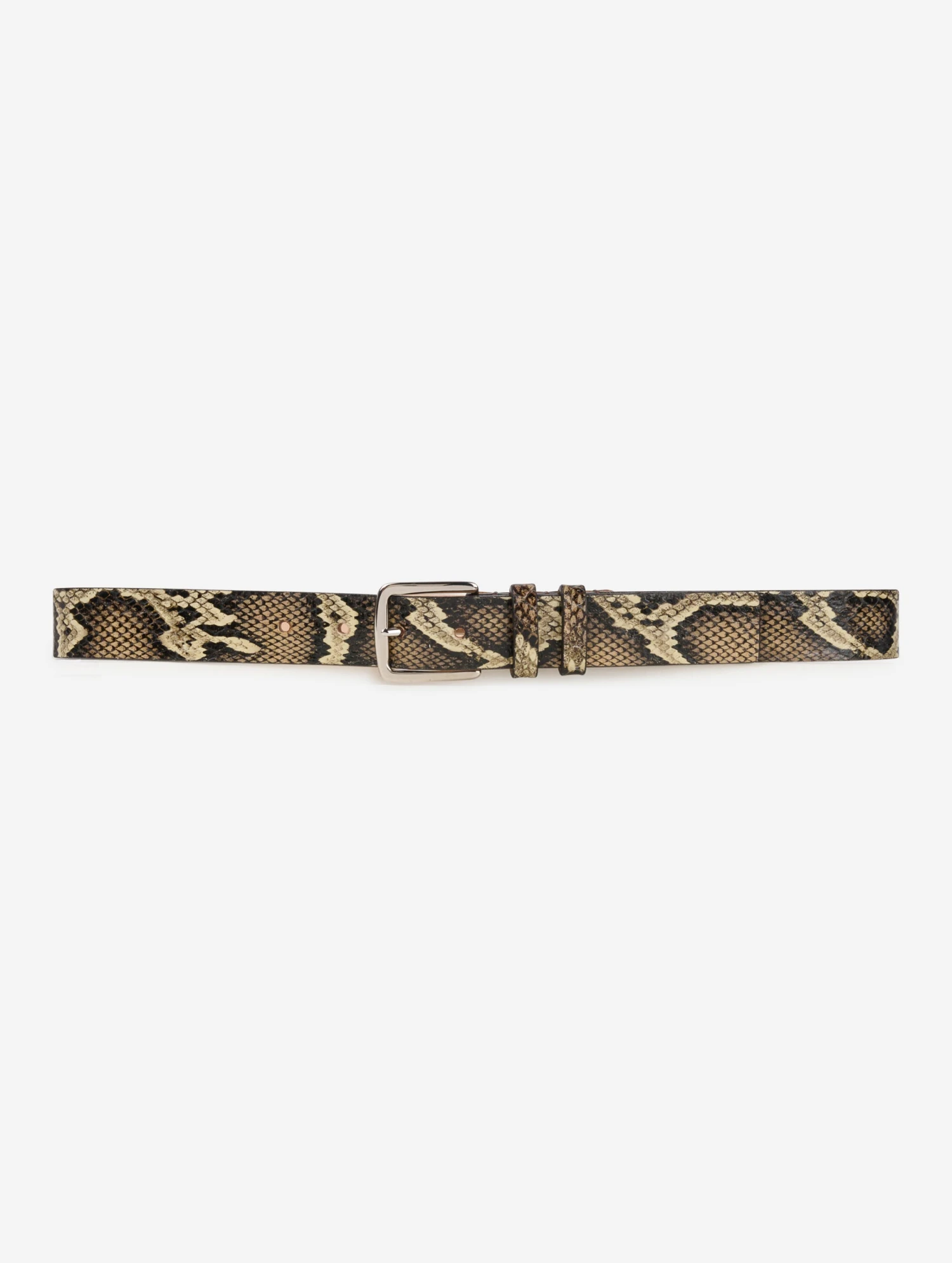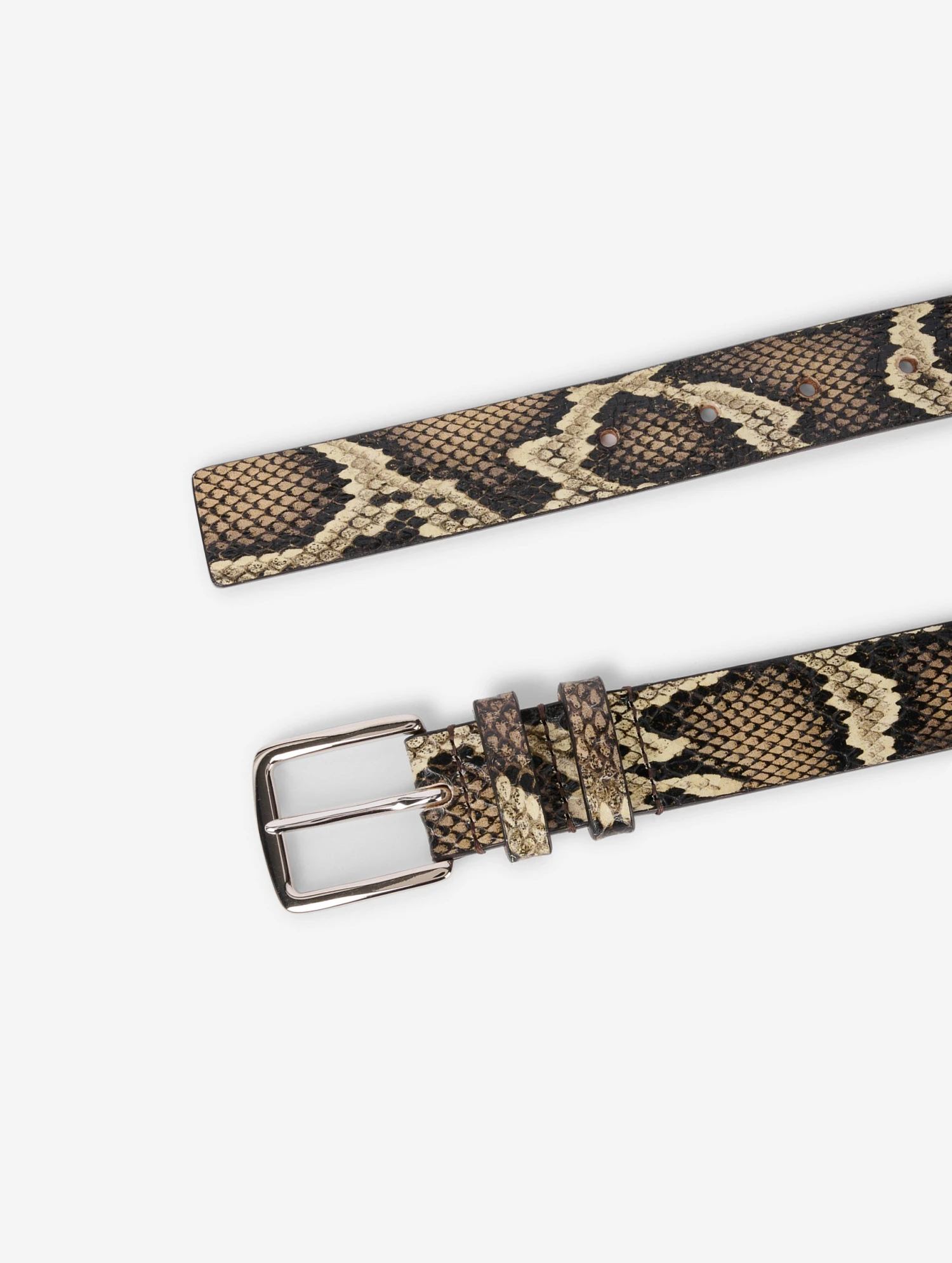 Ceinture moyenne en serpent d’eau imprimé digital « python » taupé. Boucle masculine finition nickel. Réglage 5 trous. Hauteur 30 mm.