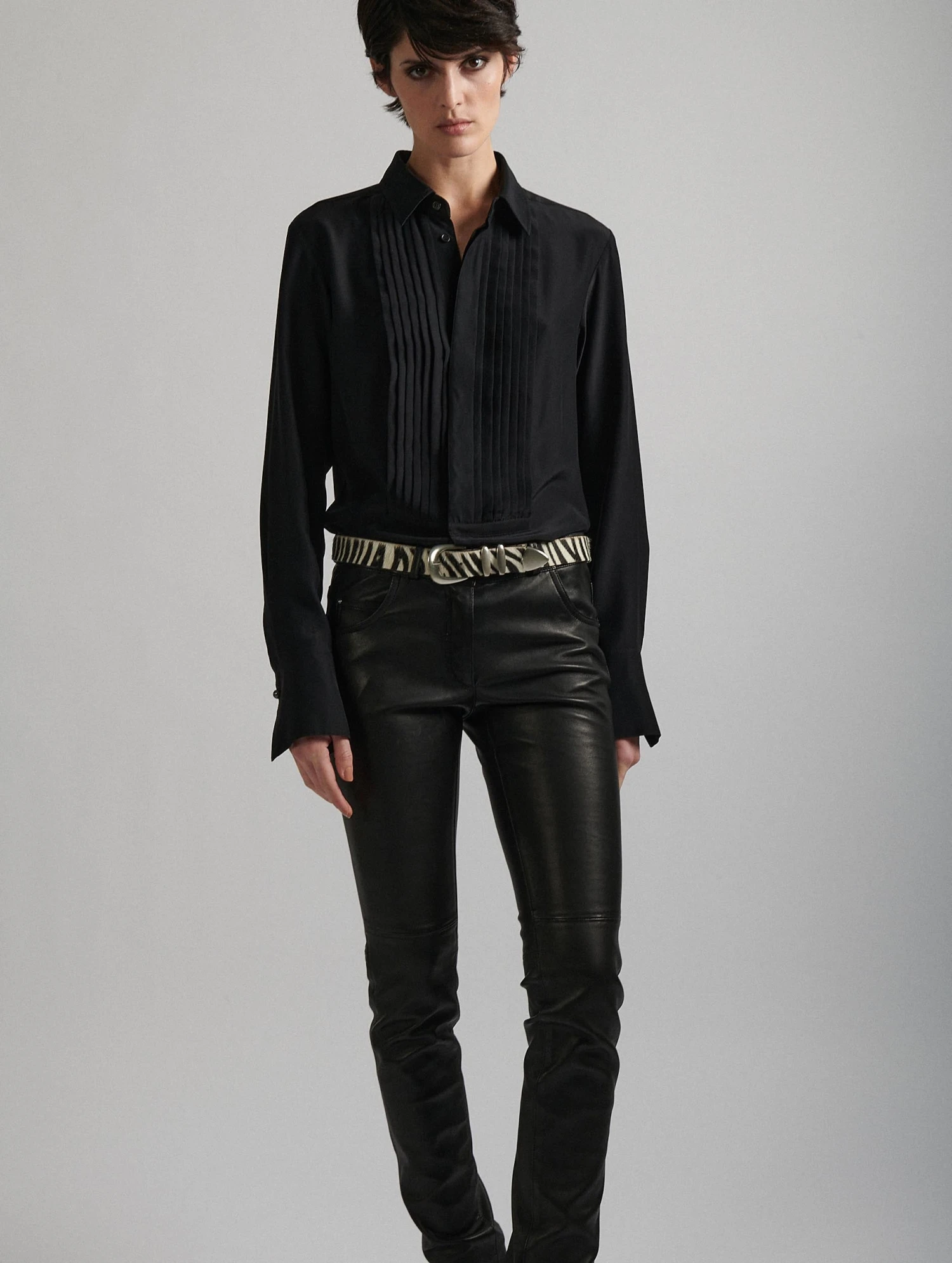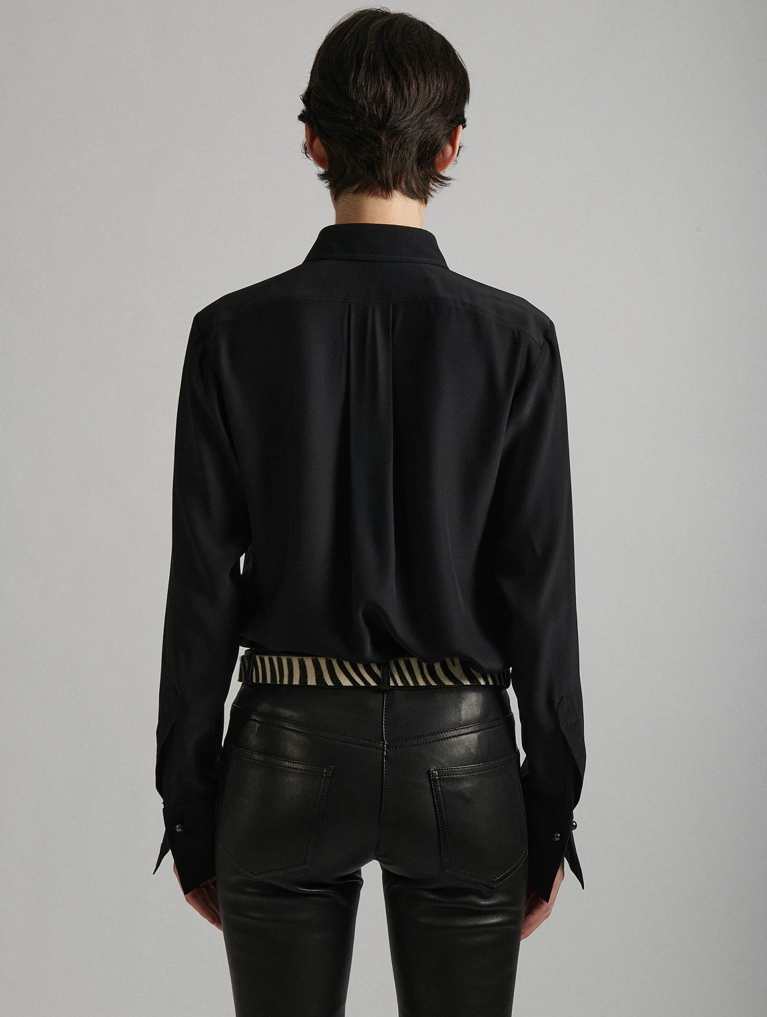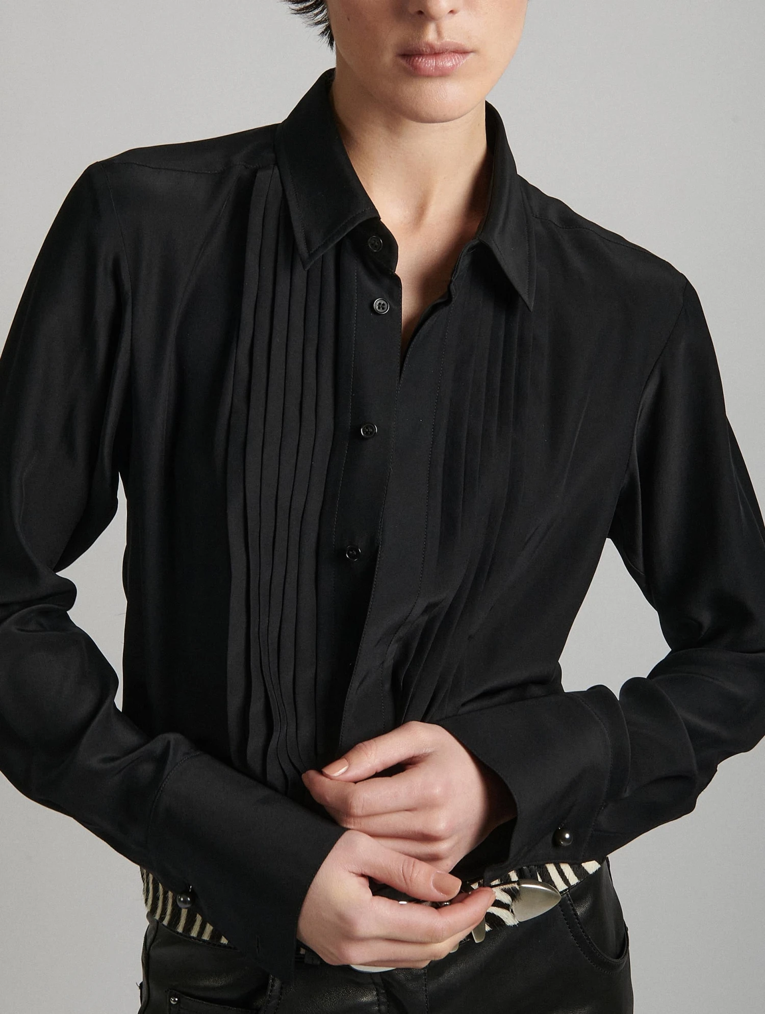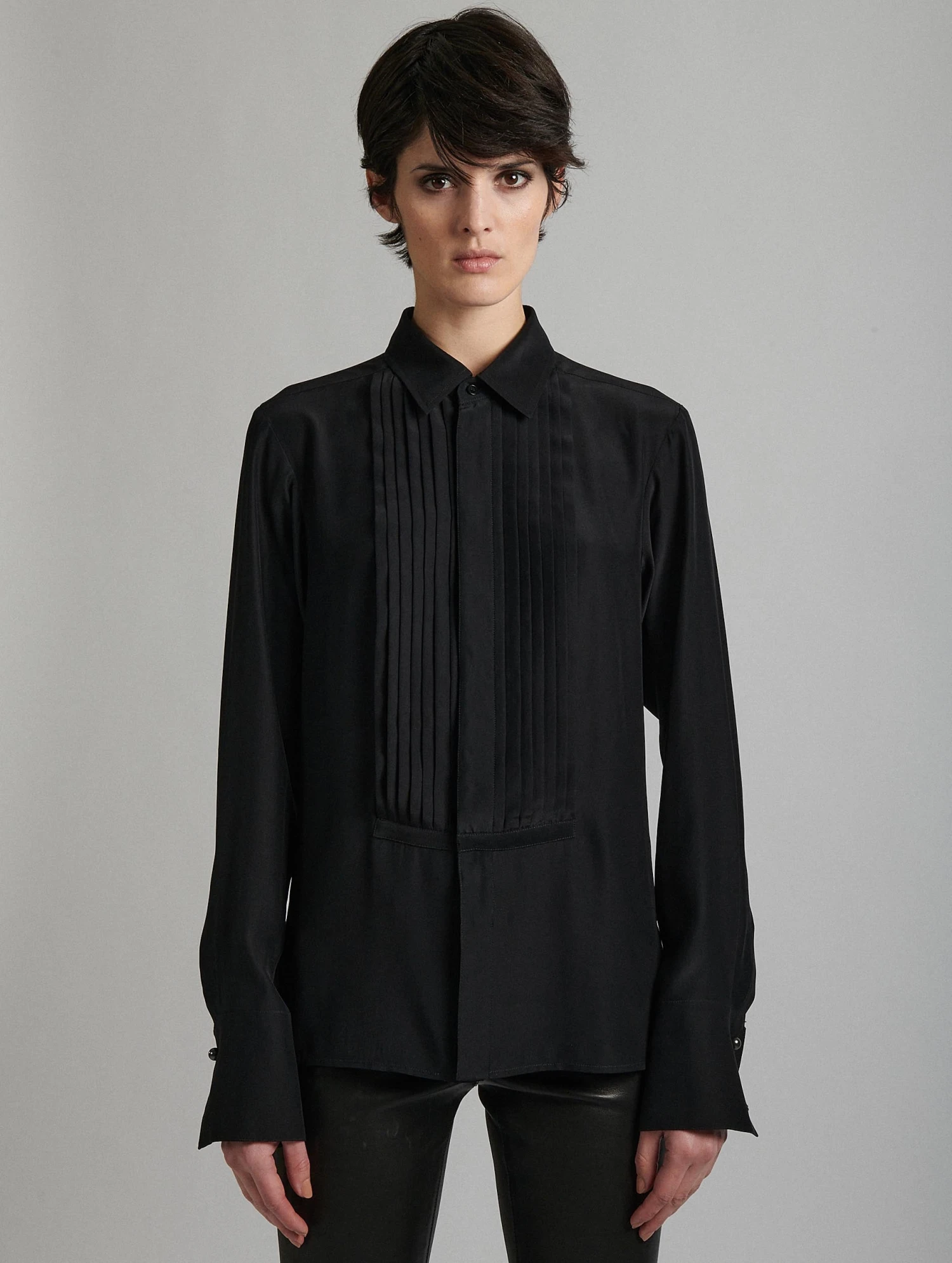 Réalisée dans un crêpe de soie à envers satin noir cette chemise s’inspire de sa version masculine avec ses poignets mousquetaires, ornés d’élégants boutons de manchettes tels des perles noires. Au dos, un jeu de pinces offre un tombé seyant tandis que sur l’avant, cette chemise en soie à la patte de boutonnage cachée révèle les plissés travaillés de son impeccable plastron. Portée avec un pantalon de costume ou glissée dans un pantalon en cuir, elle restera un intemporel de votre vestiaire.