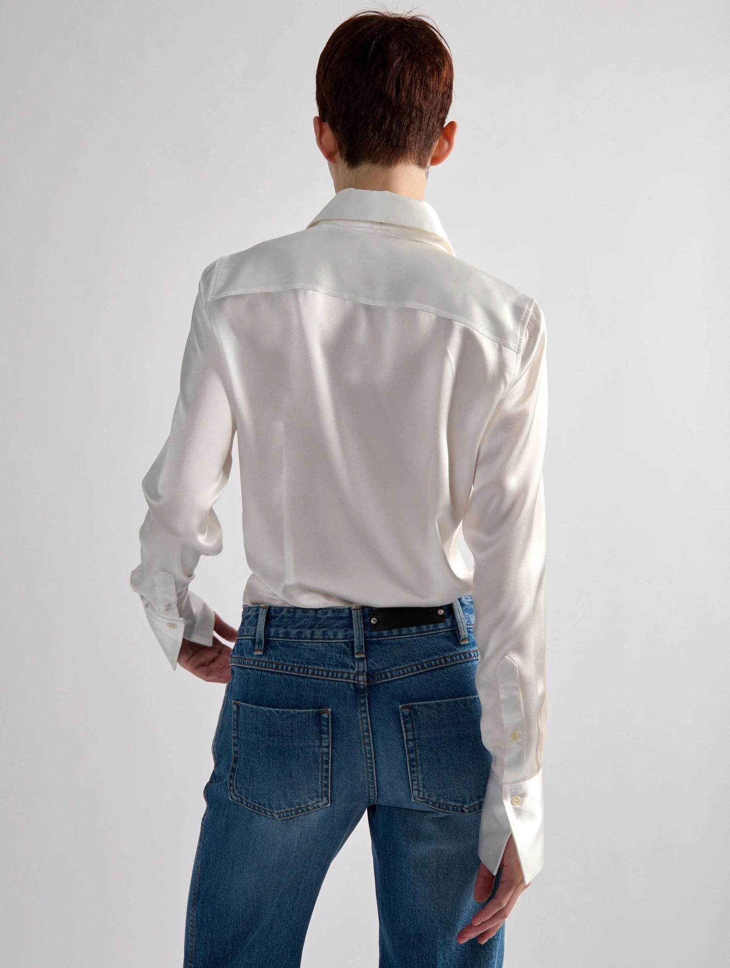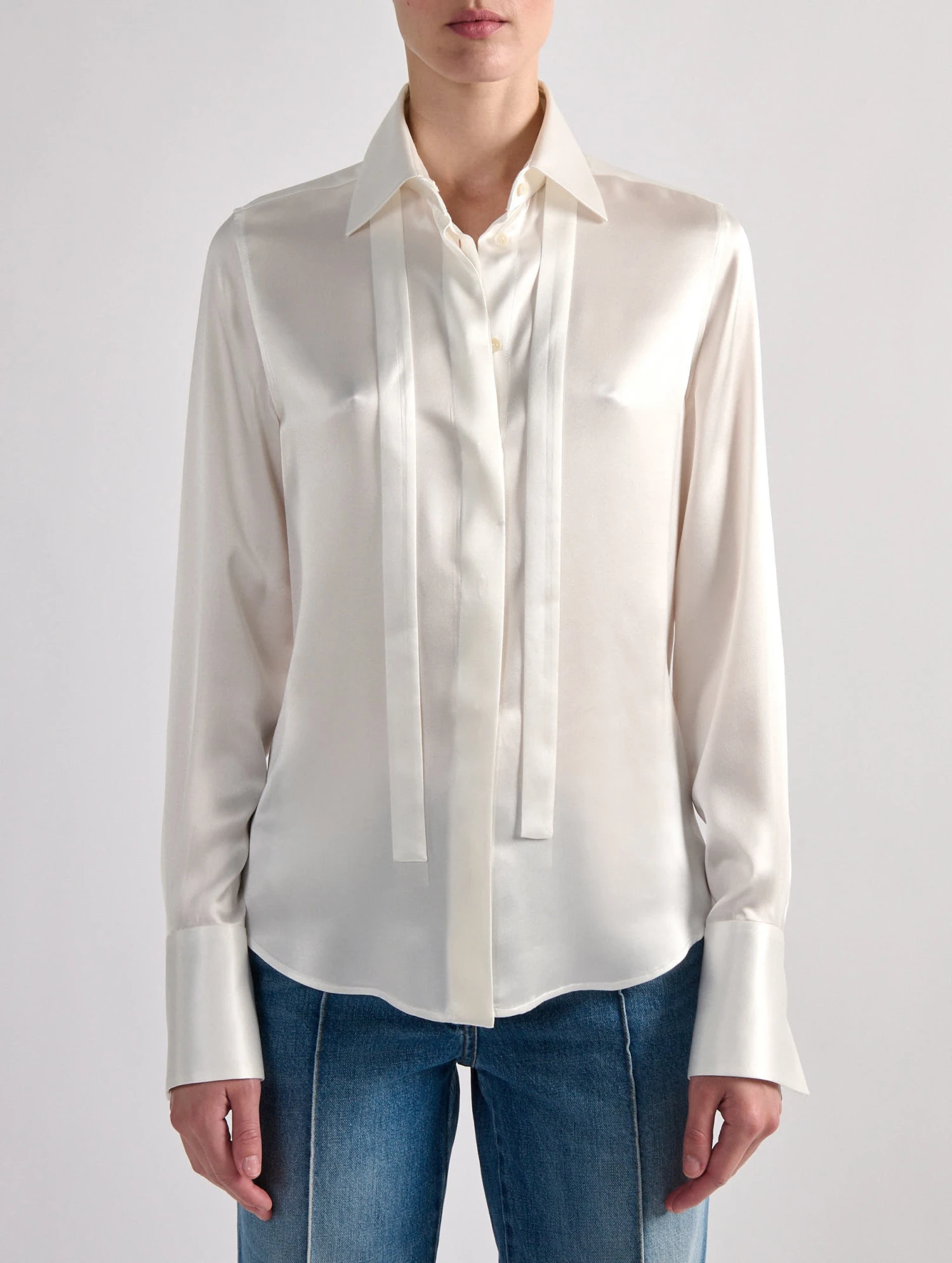 Modèle récurrent du vestiaire Barbara Bui, la chemise en satin de soie est proposée cette saison dans un blanc ivoire intemporel ou un bleu intense s’accordant aux propositions de la saison. La fine lavallière amovible de cette chemise femme peut se nouer comme vous le souhaitez pour un porté sophistiqué ou une allure plus décontractée. Ses poignets rallongés, une signature de la Maison, sont pensées pour dépasser des manches de nos vestes de costumes.