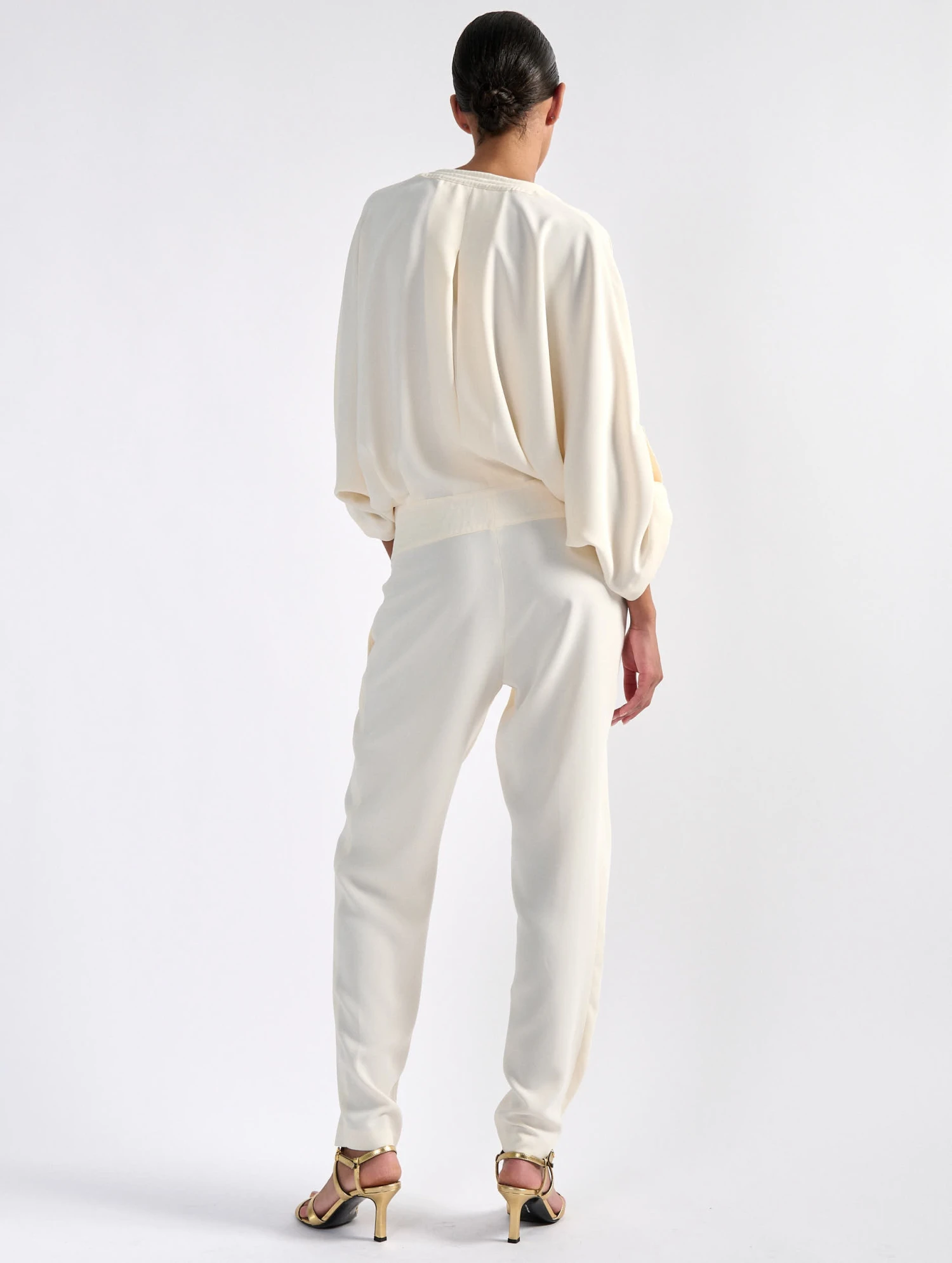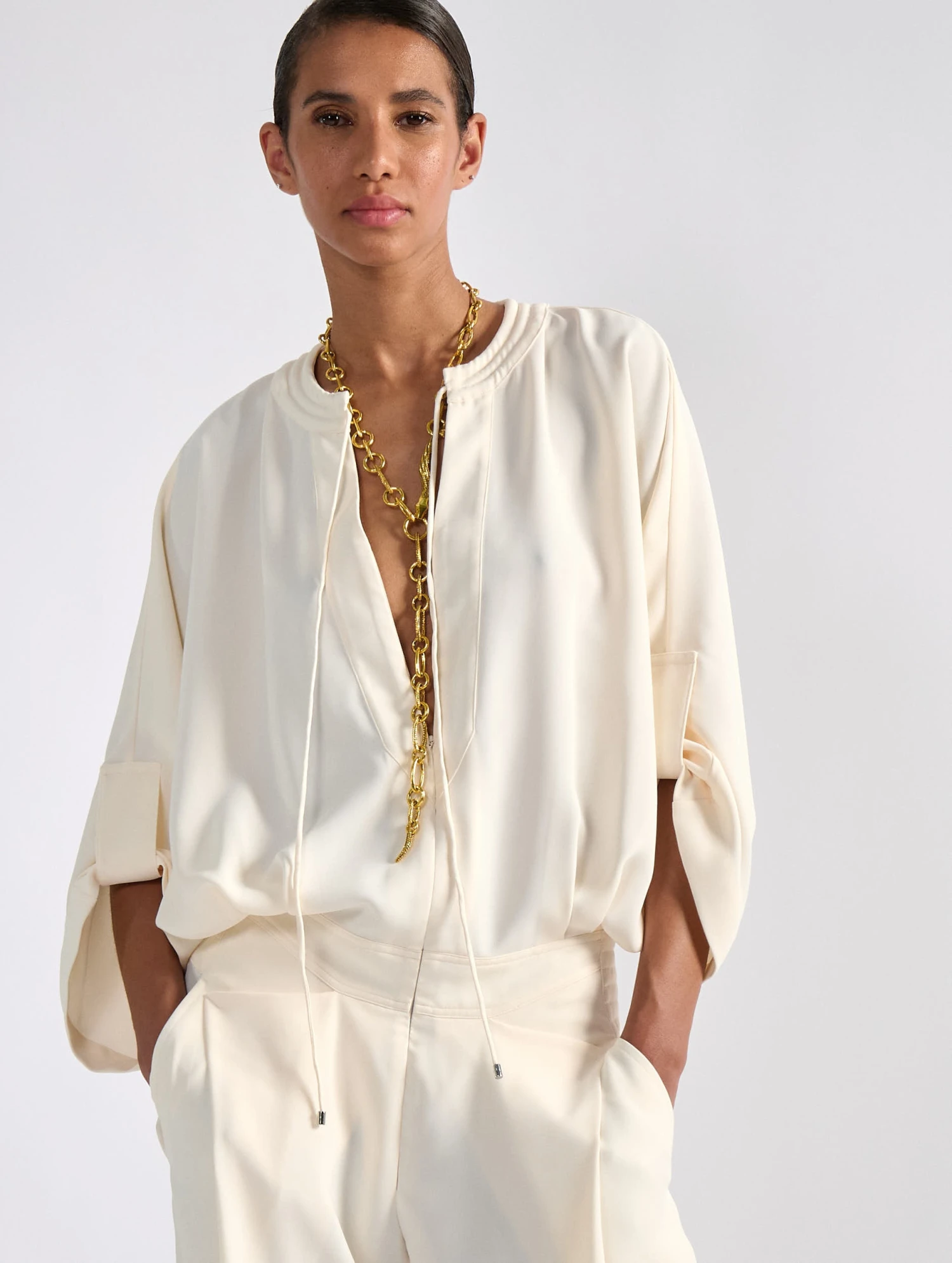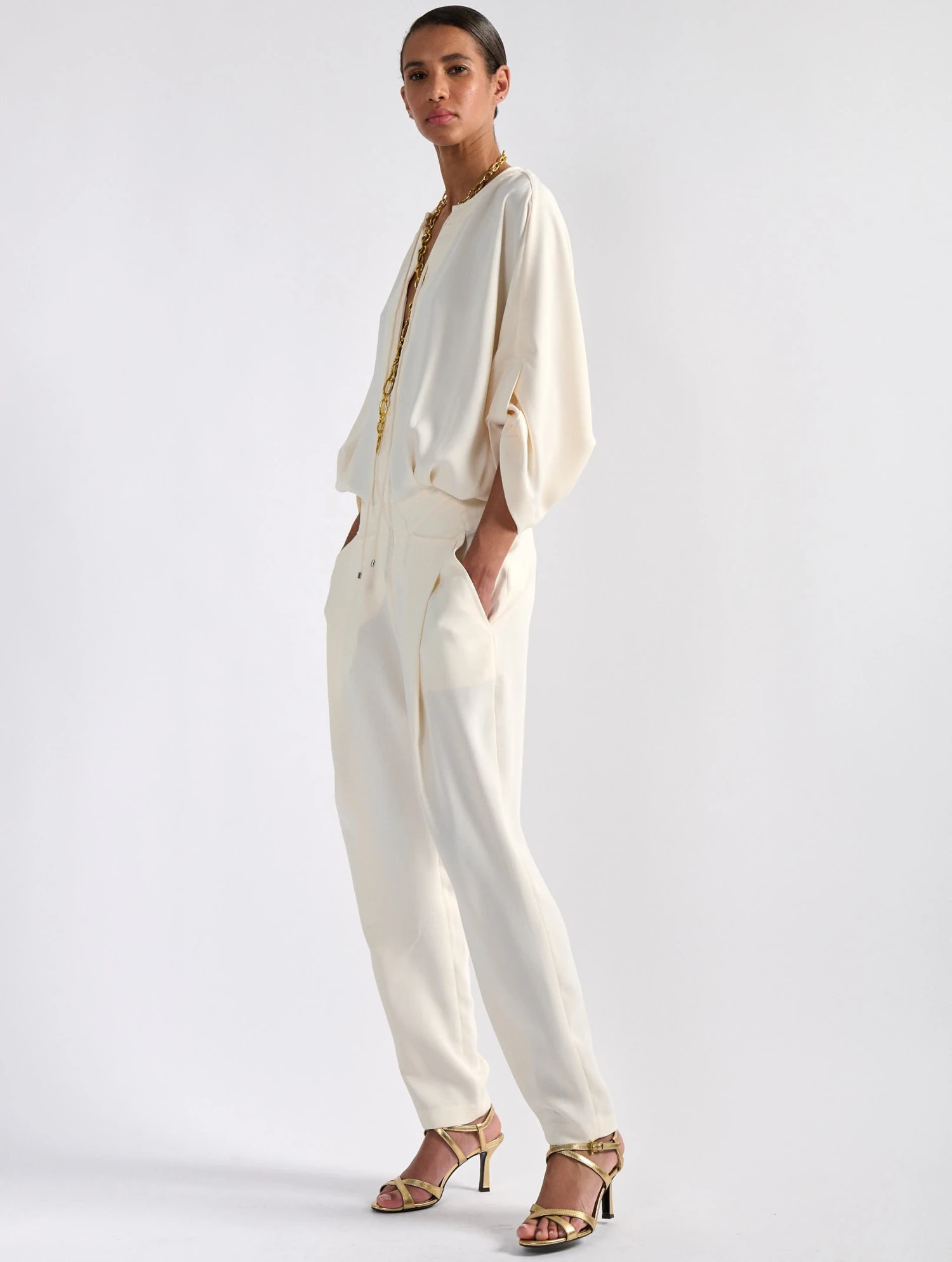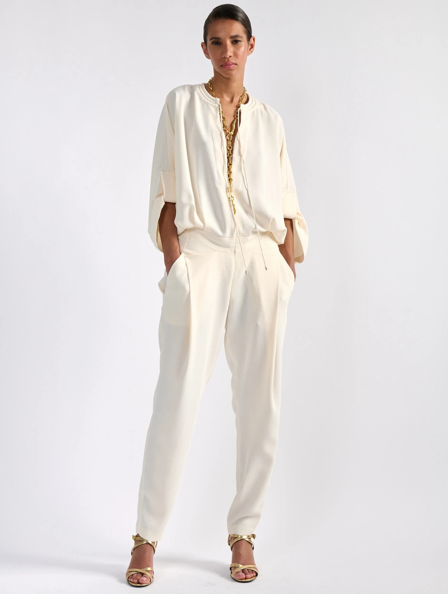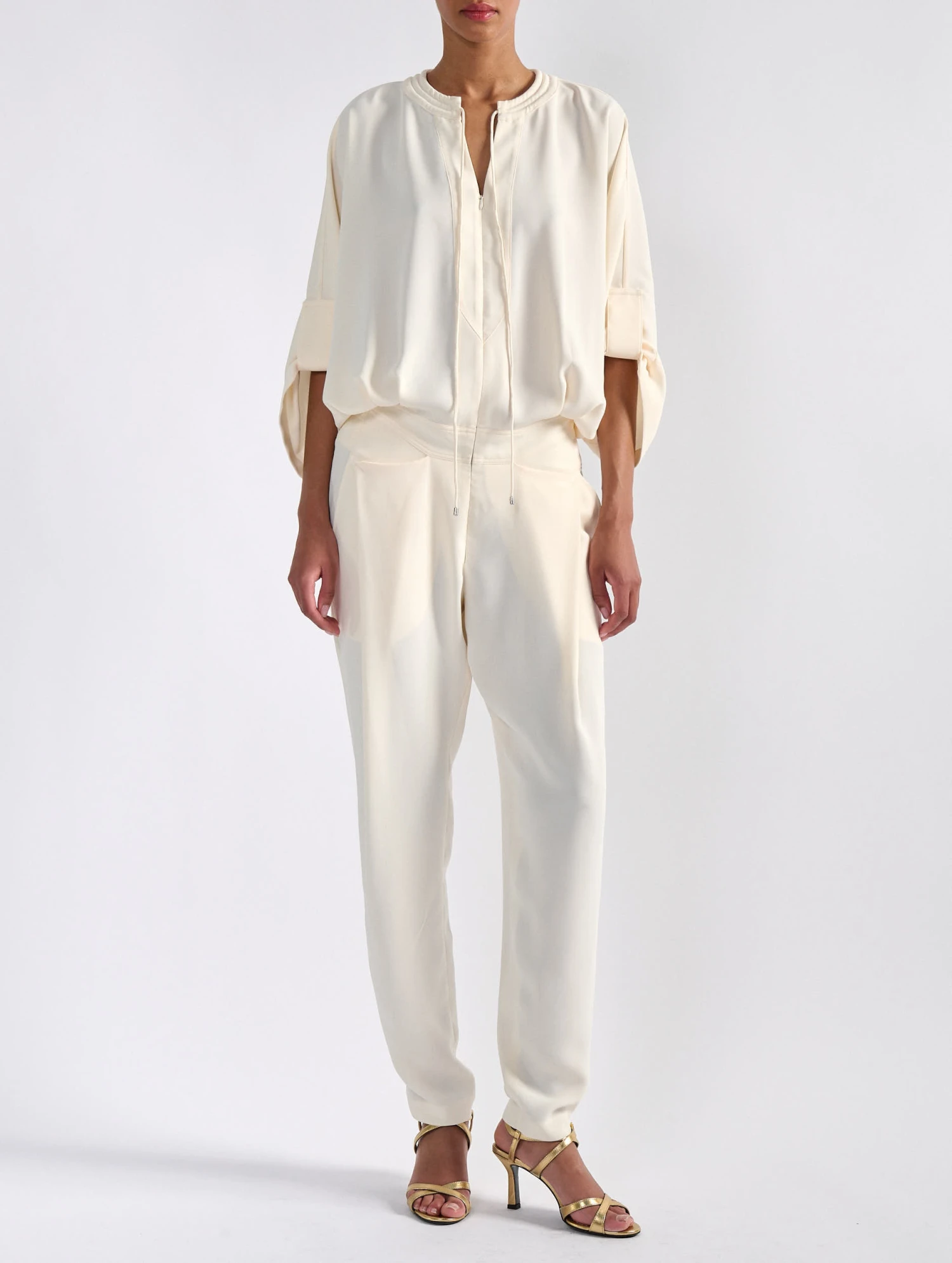 Inspirée de notre pantalon à plis et de notre blouson zippé assorti, cette combinaison réunit ces deux pièces tendance en une seule proposition. Réalisé en crêpe fluide dans un coloris ivoire, bleu marine ou noir, cette combinaison seyante est dotée de manches savamment relevées à l’aide de pattes d’attache, d’un col rond à matelassage biker s’approfondissant en encolure tunisienne zippée et de cordons de serrage. Sa taille cintrée met en valeur la silhouette tandis que son pantalon fluide favorise confort et mouvement sans sacrifier à l’élégance.