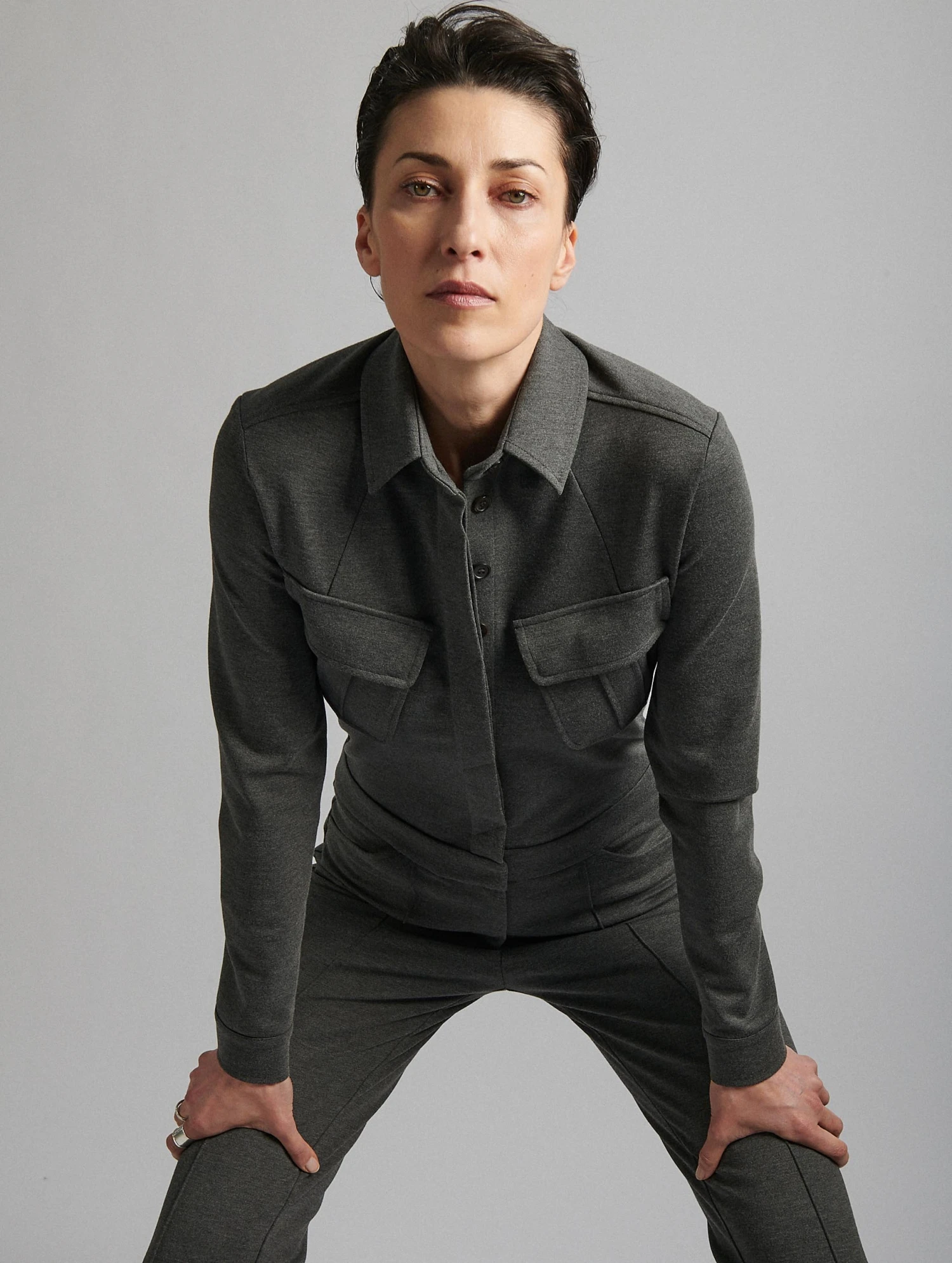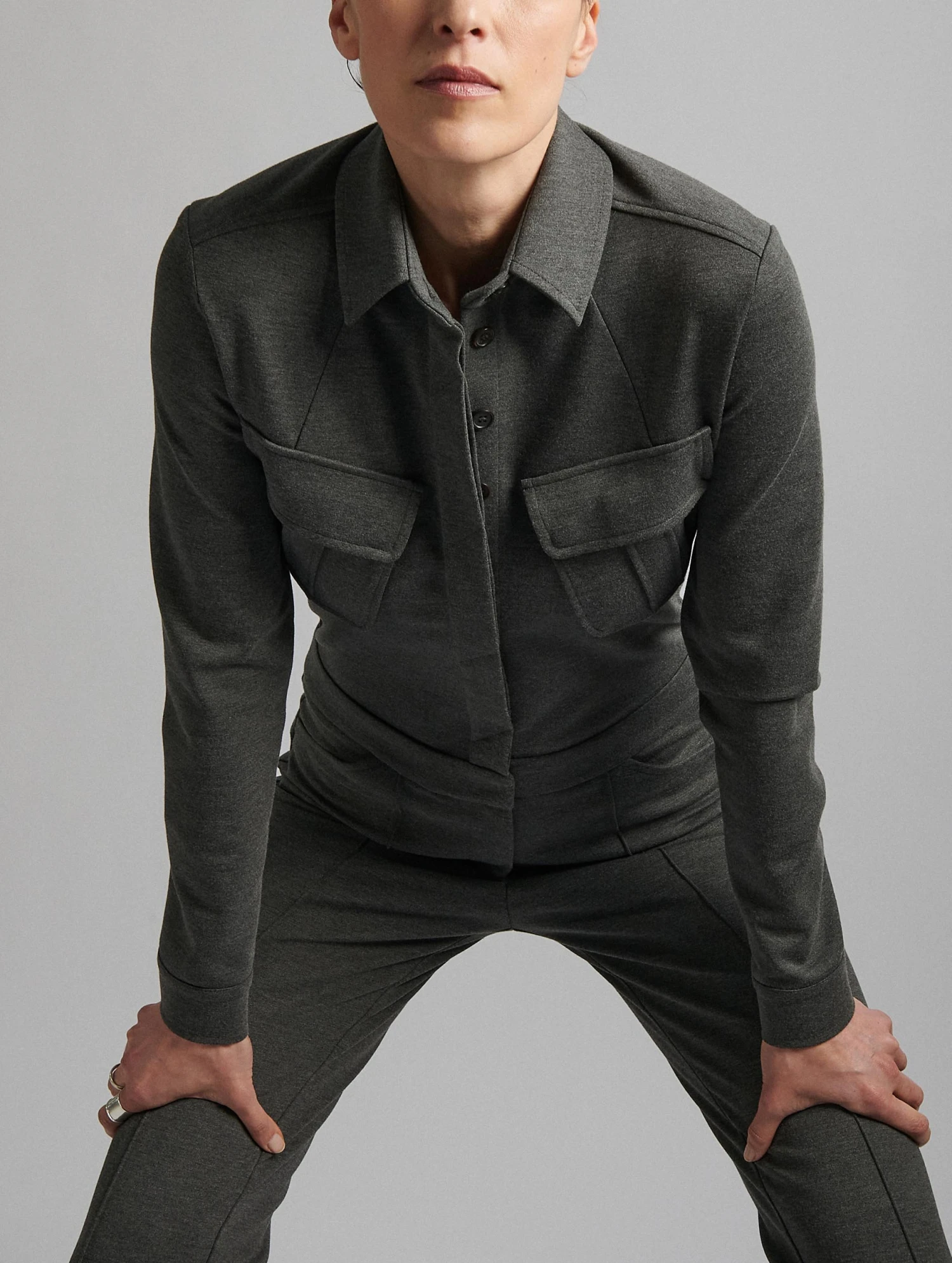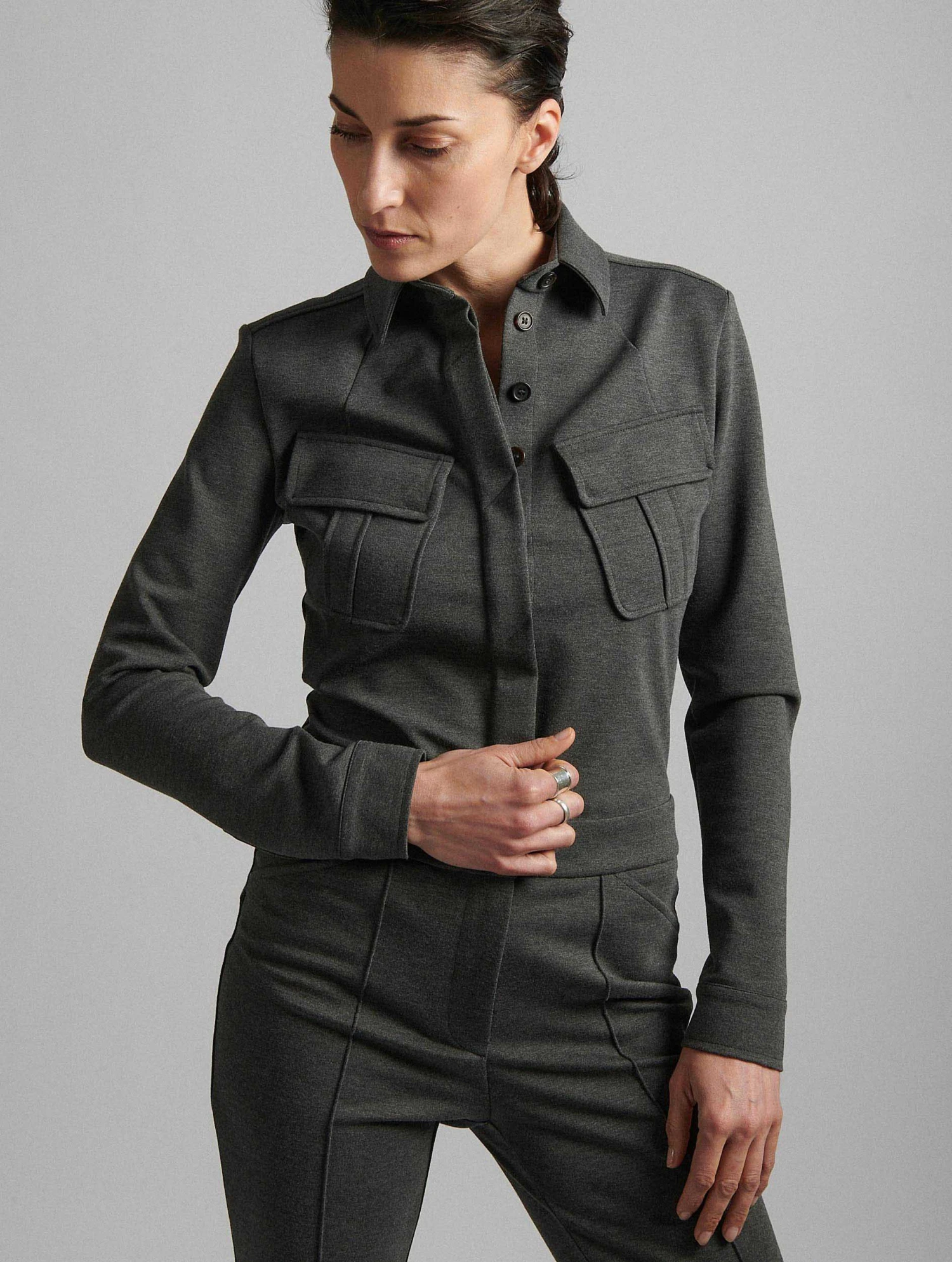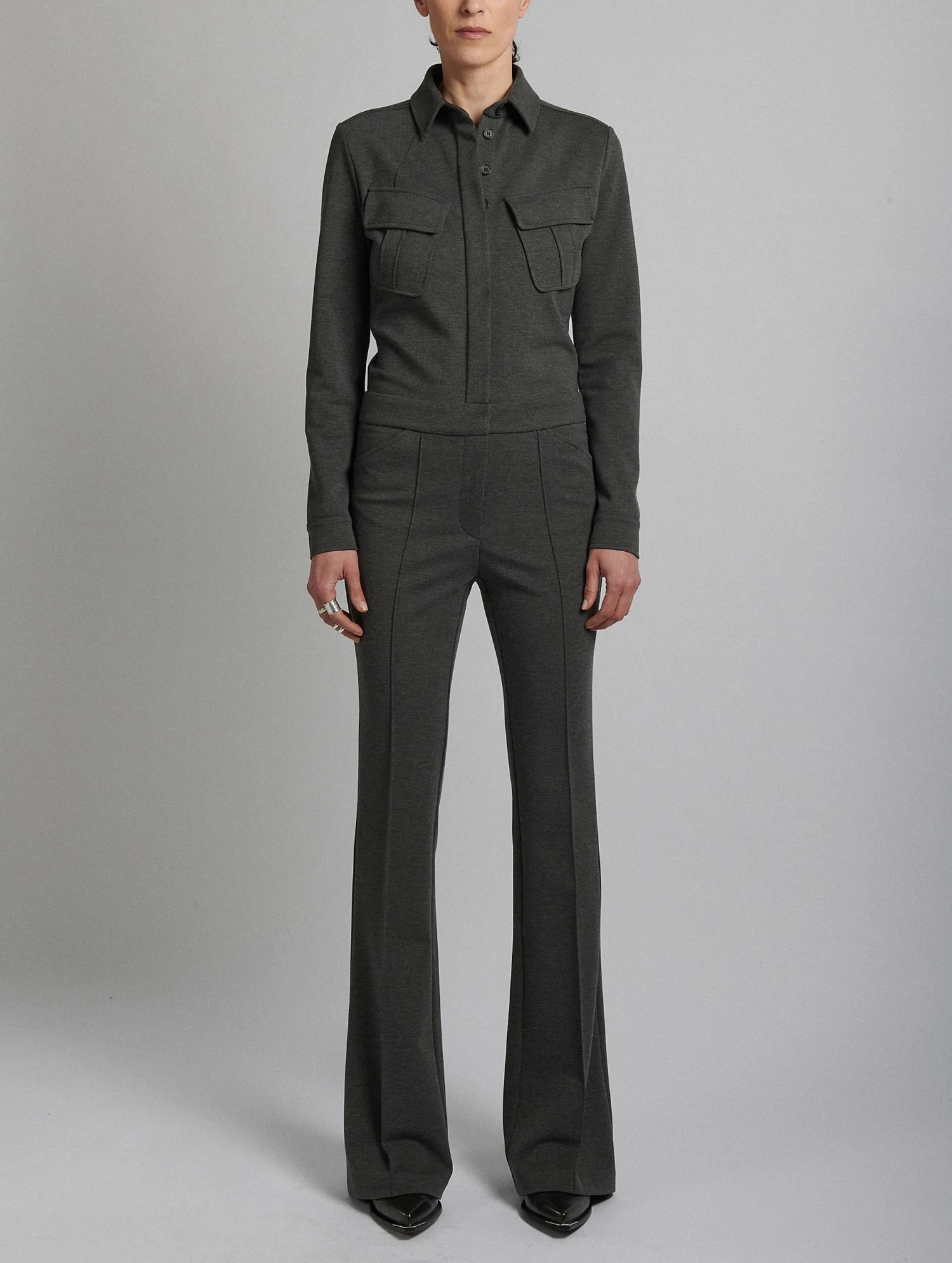 Pièce incontournable du vestiaire Barbara Bui, la combinaison pantalon se décline cette saison dans un jersey milano seyant et confortable, en version noire ou grise. Dotée de poignets boutonnés, de poches poitrine plaquées et de poches asymétriques à boutons cachés, cette pièce intemporelle est parfaitement structurée. Coupe ajustée, bas de jambe évasé et pli cousu le long de la jambe mettent en valeur la silhouette. Son col classique et sa patte de boutonnage caché contribuent à la sophistication épurée de cette combinaison bootleg ornée au dos de notre piercing signature amovible en métal argenté.