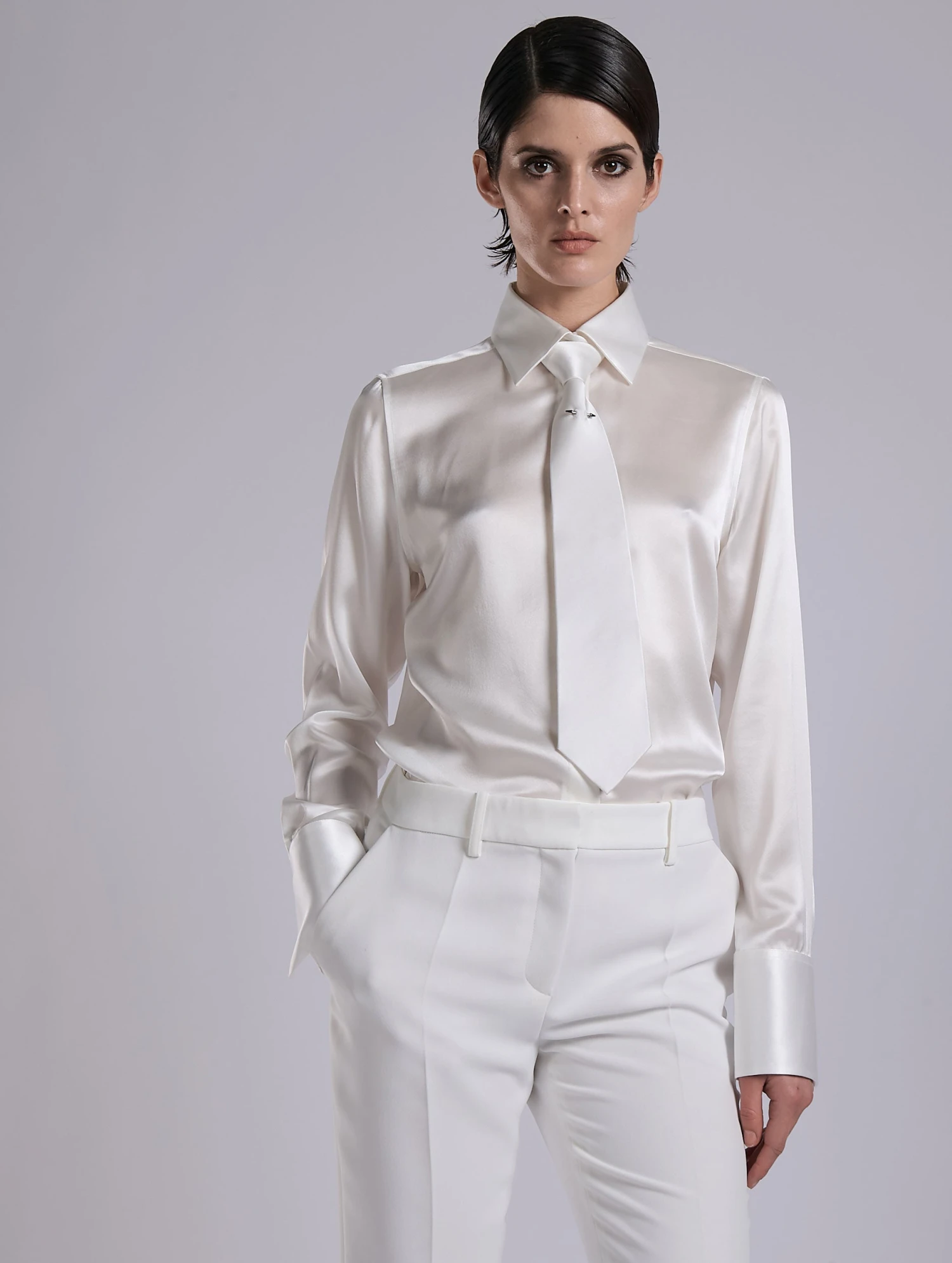 Avec ce modèle rĂ©alisĂ© dans un satin de soie prenant Ă©lĂ©gamment la lumière, Barbara Bui prouve que la cravate mĂ©rite toute sa place dans le vestiaire fĂ©minin. Adoptant la dĂ©gaine boyish chère Ă la maison, cette cravate est proposĂ©e dans plusieurs coloris dont ceux de nos costumes en velours, idĂ©al pour jouer la carte du total look monochrome Ă l’occasion d’un Ă©vènement. Pour rehausser cet accessoire d’une touche rock et prĂ©cieuse, elle est ornĂ©e d’un piercing amovible en mĂ©tal argentĂ©. DĂ©jĂ nouĂ©e, elle se superpose en un clin d’oeil Ă la chemise en satin de soie assortie grâce Ă son collier disposant d’une attache astucieuse.
