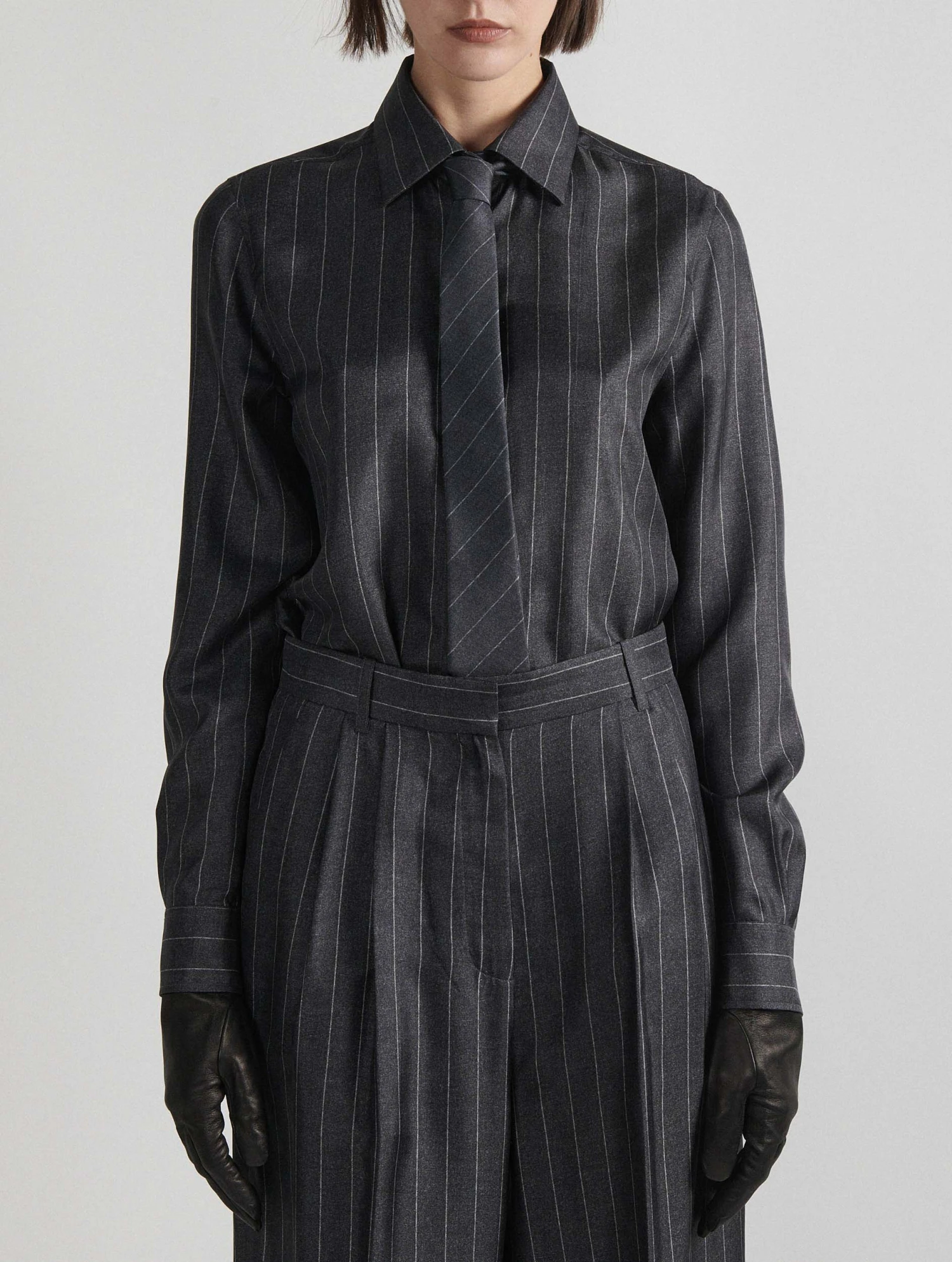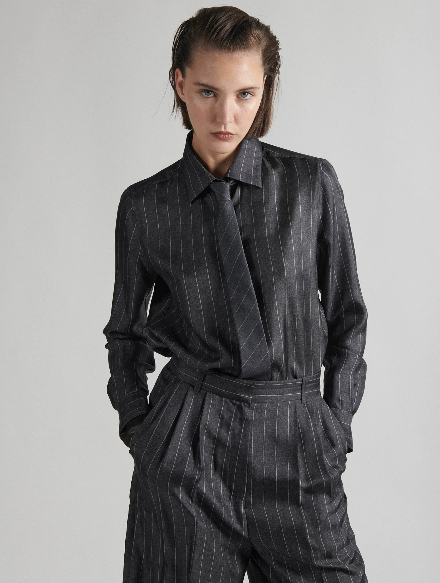 Chasse gardée du vestiaire masculin, la cravate devient plus séduisante et féminine que jamais détournée par Barbara Bui dans une luxueuse version trompe-l’oeil. Cet accessoire en twill de soie fluide se pare de fines rayures dans un imprimé façon flanelle rayée, un effet rappelant les costumes masculins dont s’est inspiré notre créatrice cette saison. Portée avec la chemise en twill assortie et notre pantalon en flanelle rayée, cette cravate femme grise ose l’ambivalence des genres.