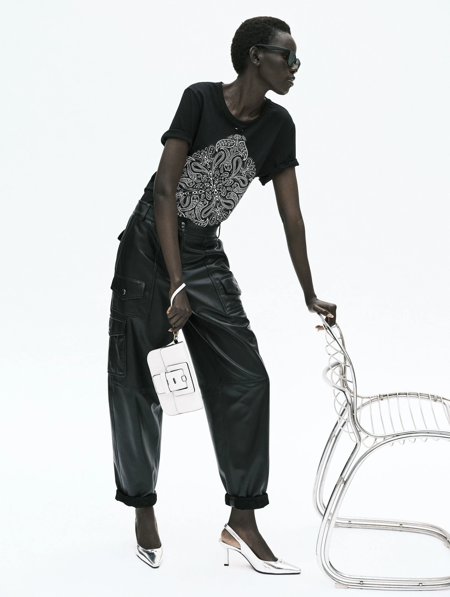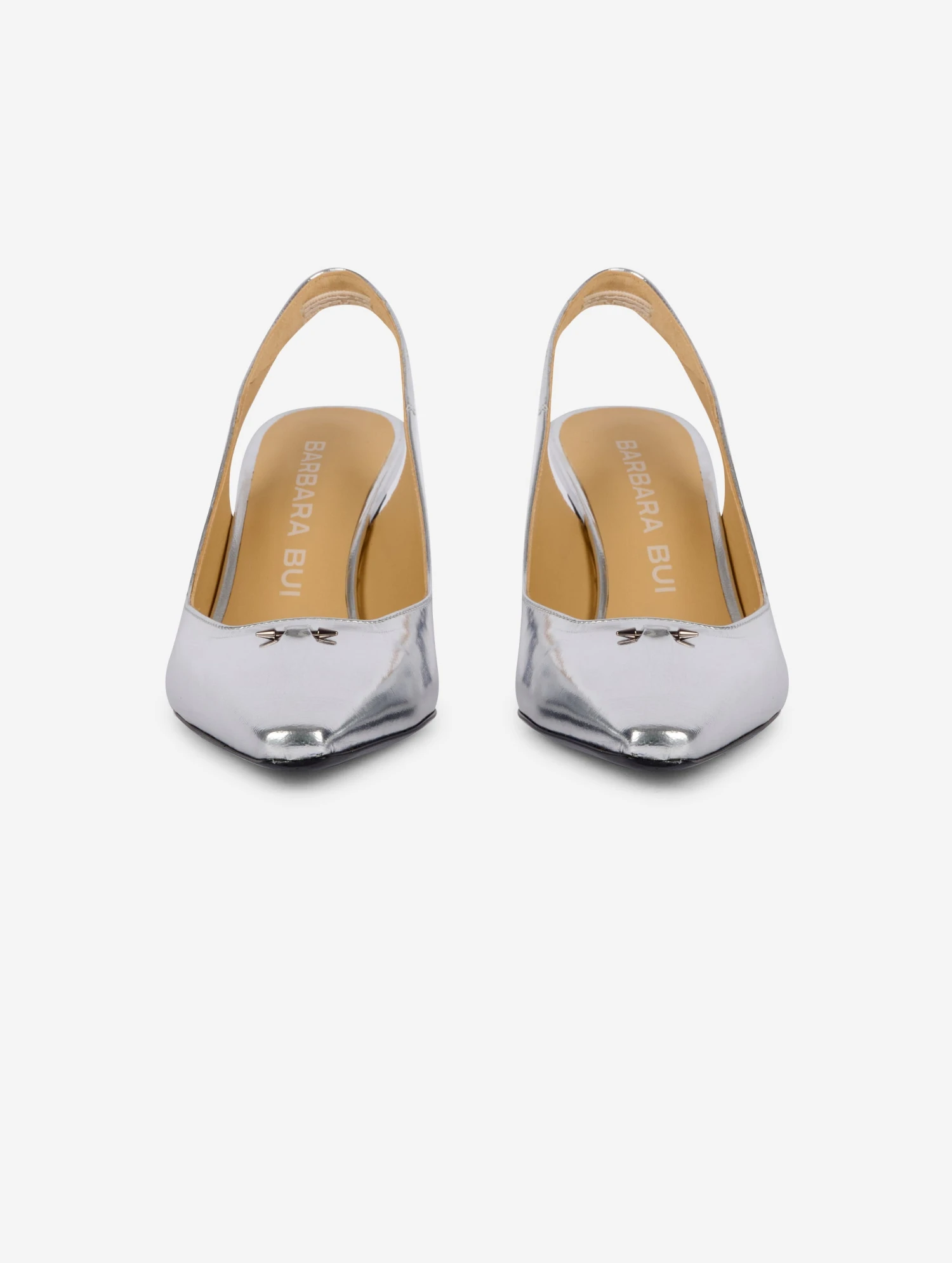 Décolletés aux lignes graphiques en cuir miroir argenté. Dos ouvert et petit bijoux piercing en métal argent. Talon sexy de 7,5 cm recouvert de cuir miroir ton sur ton et fine semelle en cuir laqué noir.