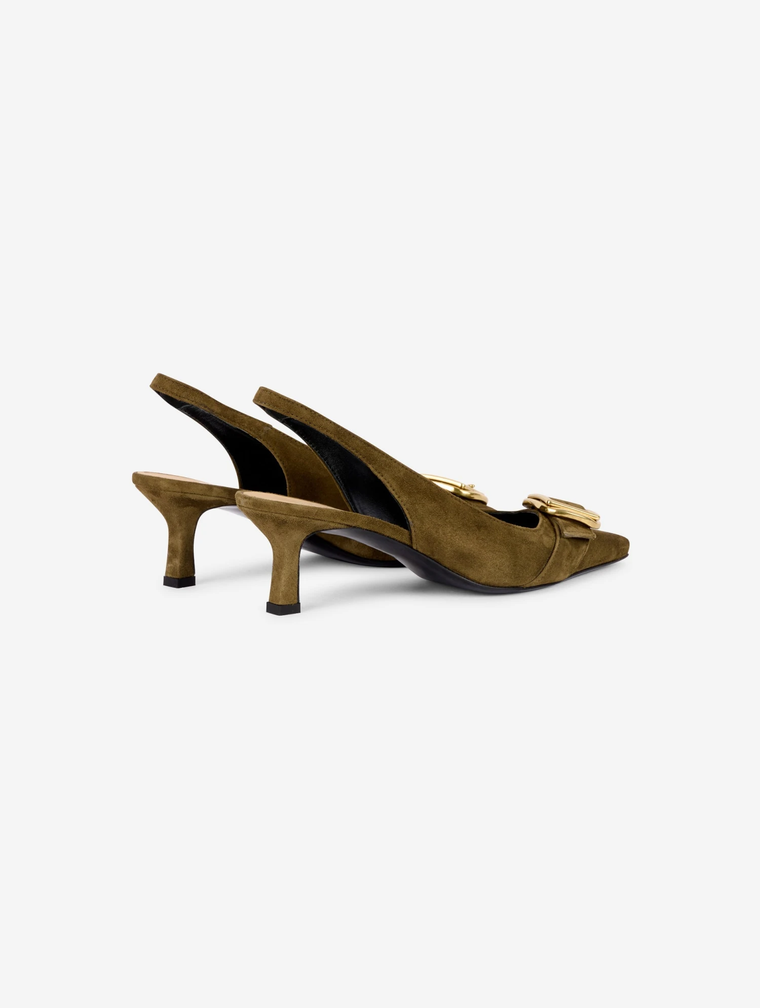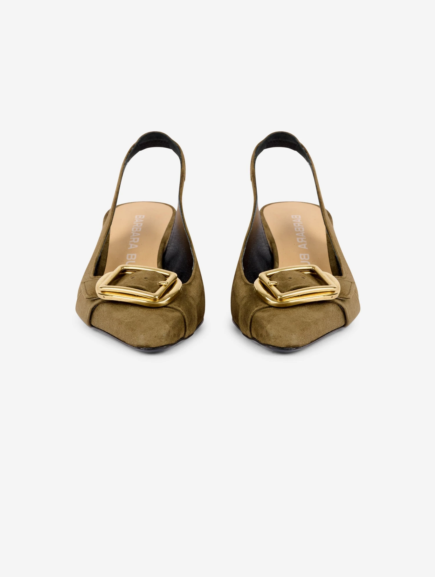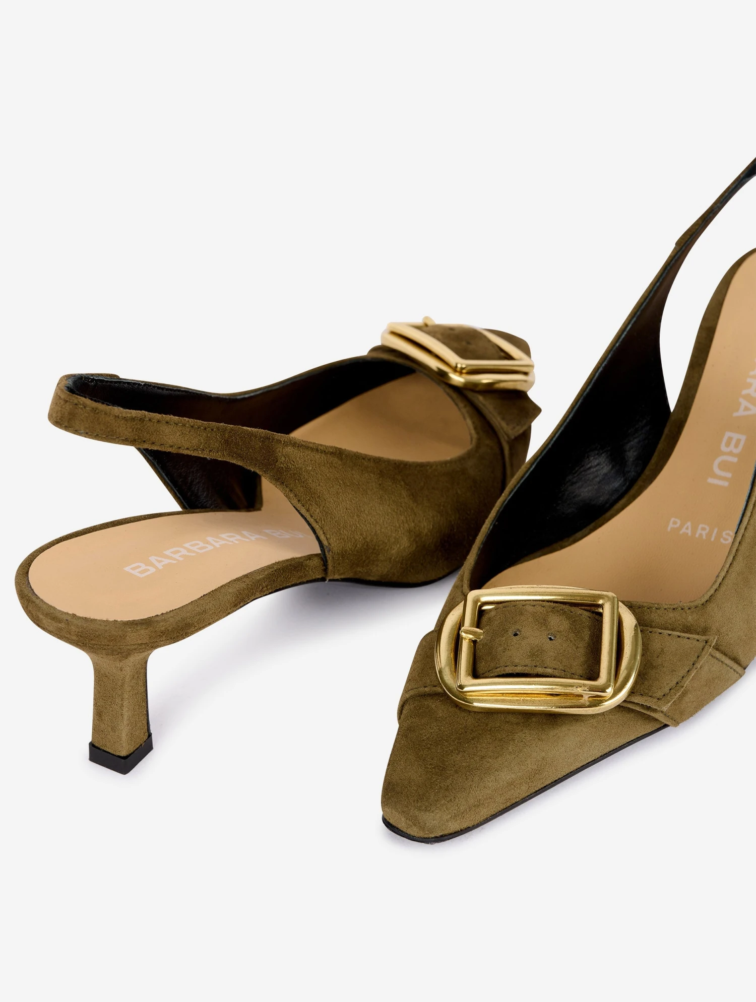Décolletés dos ouvert en daim olive. Large ceinture asymétrique retenue par une double boucle finition laiton vieilli. Petit talon sexy de 5,5 cm recouvert de daim ton sur ton et fine semelle en cuir laqué noir.