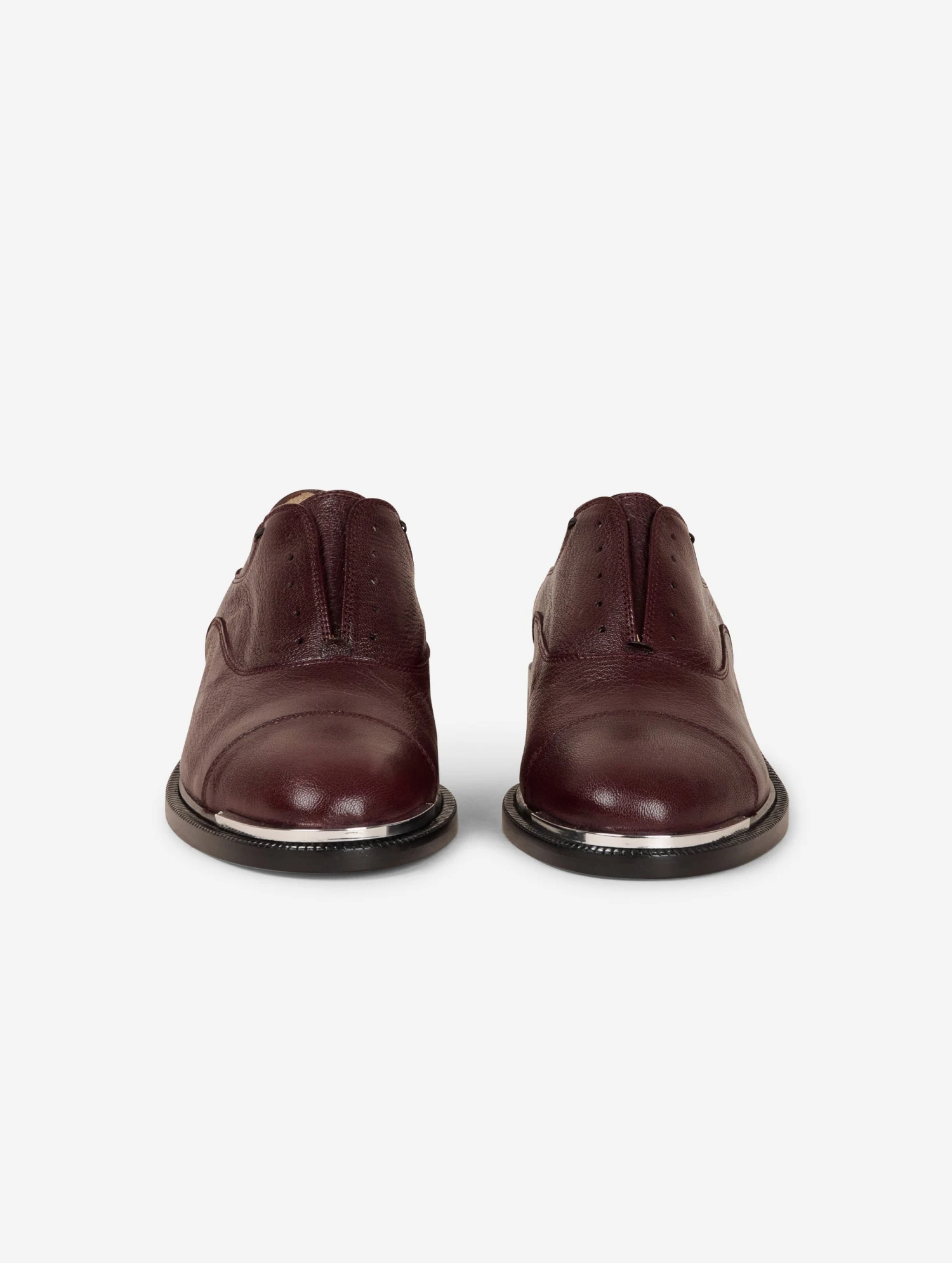 Richelieus élastiquées en cuir madras bordeaux. Large semelle masculine et pointe métallisée.