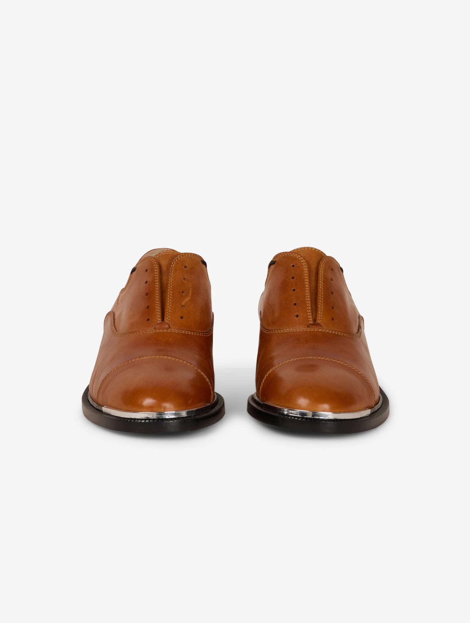 Richelieus élastiquées en cuir tannage végétal caramel. Large semelle masculine et pointe métallisée.