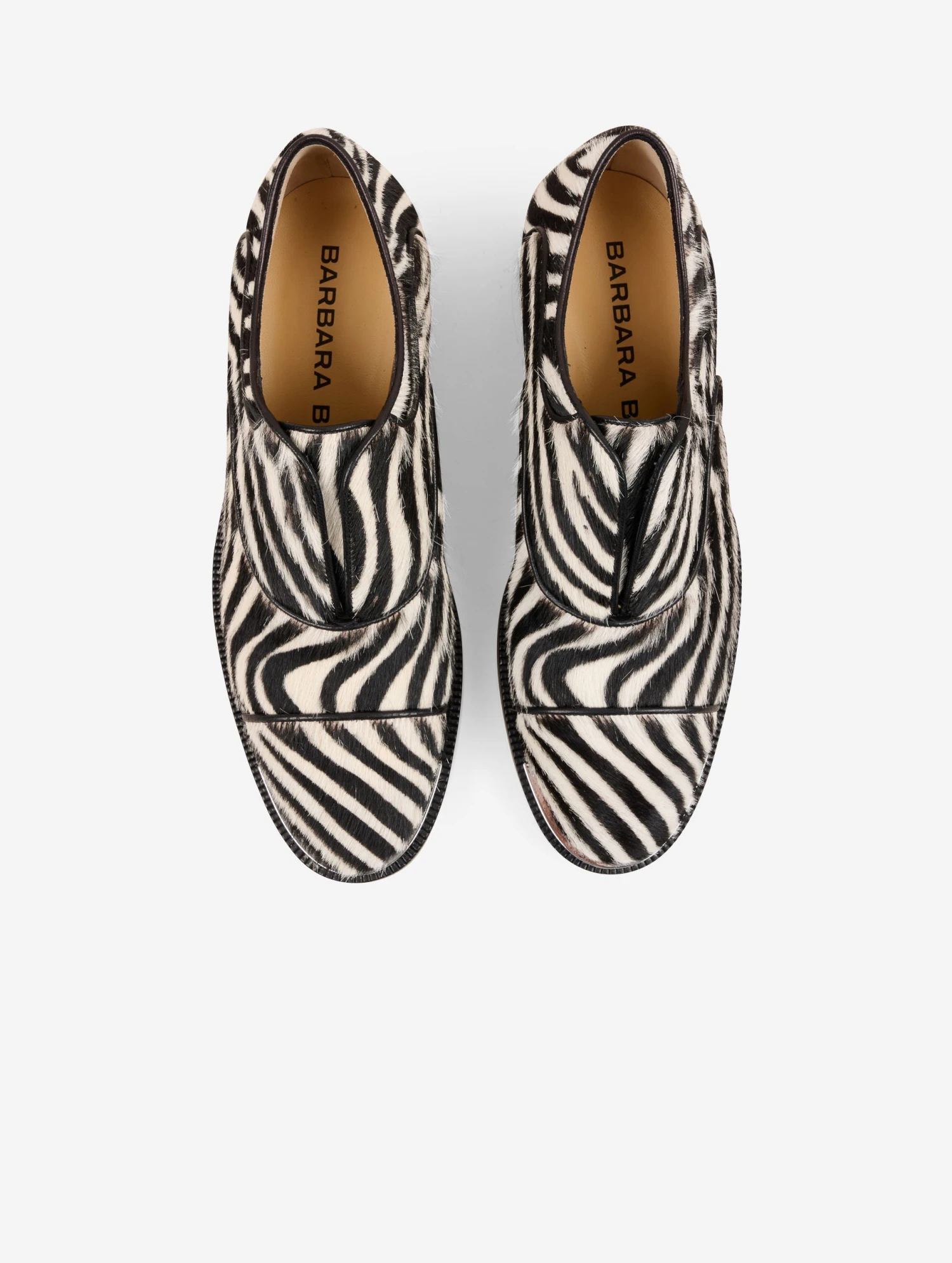 Richelieus élastiquées en cuir en cuir façon poulain imprimé zèbre noir et blanc. Large semelle masculine et pointe métallisée.