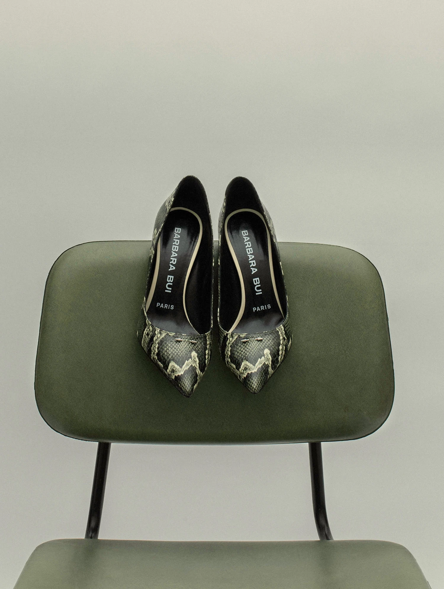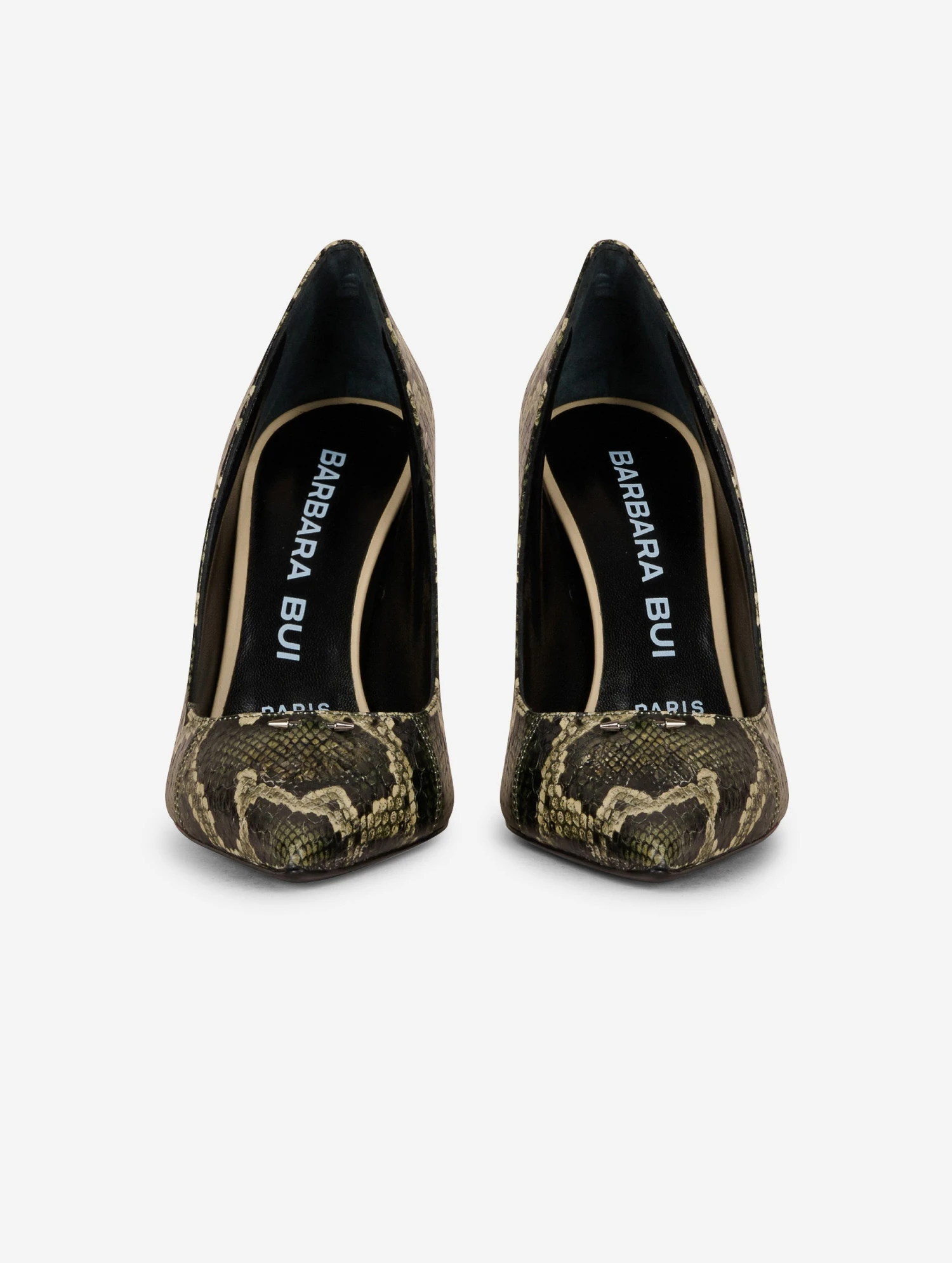 Escarpins en serpent d’eau imprimé digital « python » kaki ponctué du piercing en métal, signature de notre maison. Talon sexy de 10,5 cm.