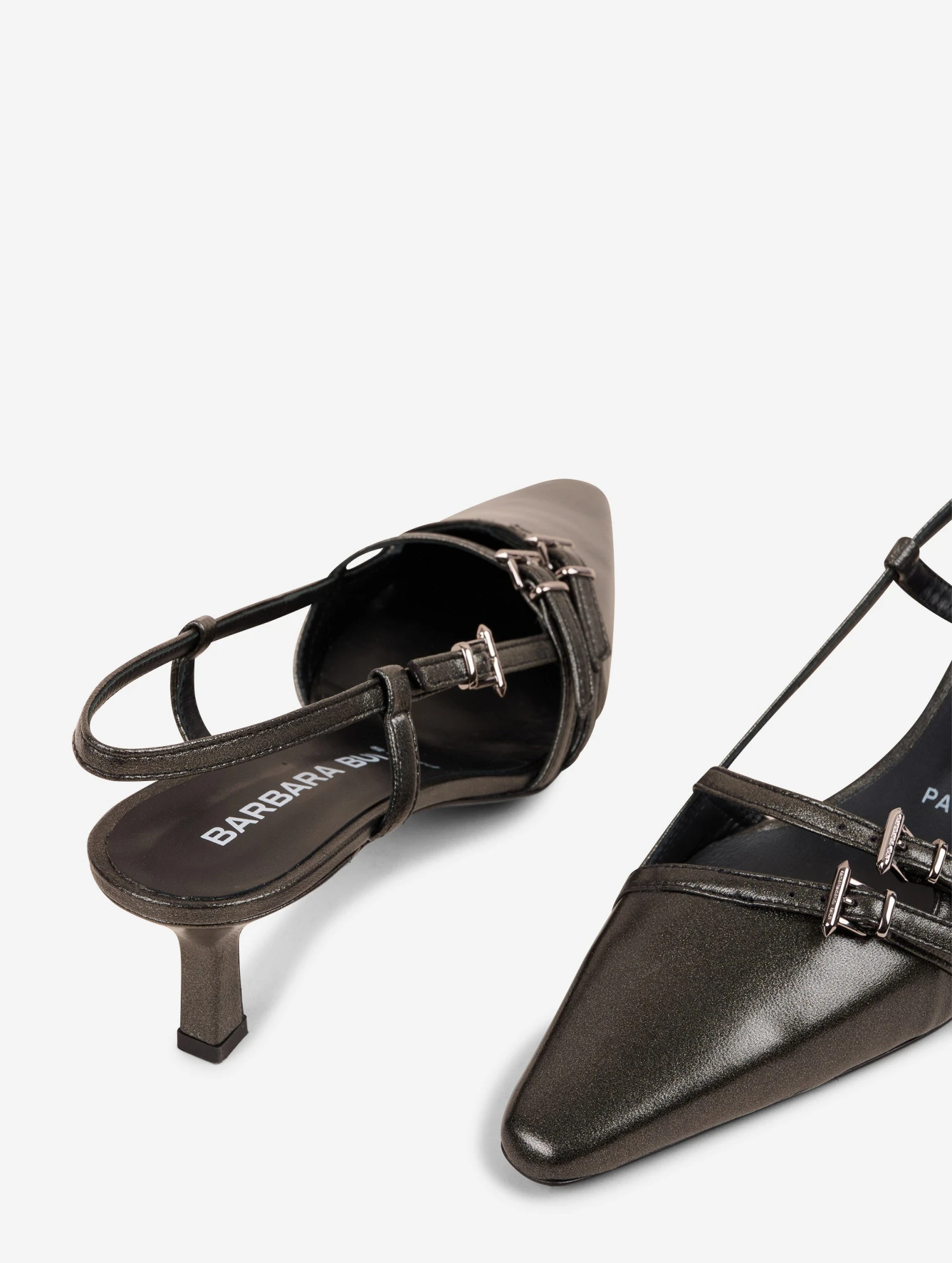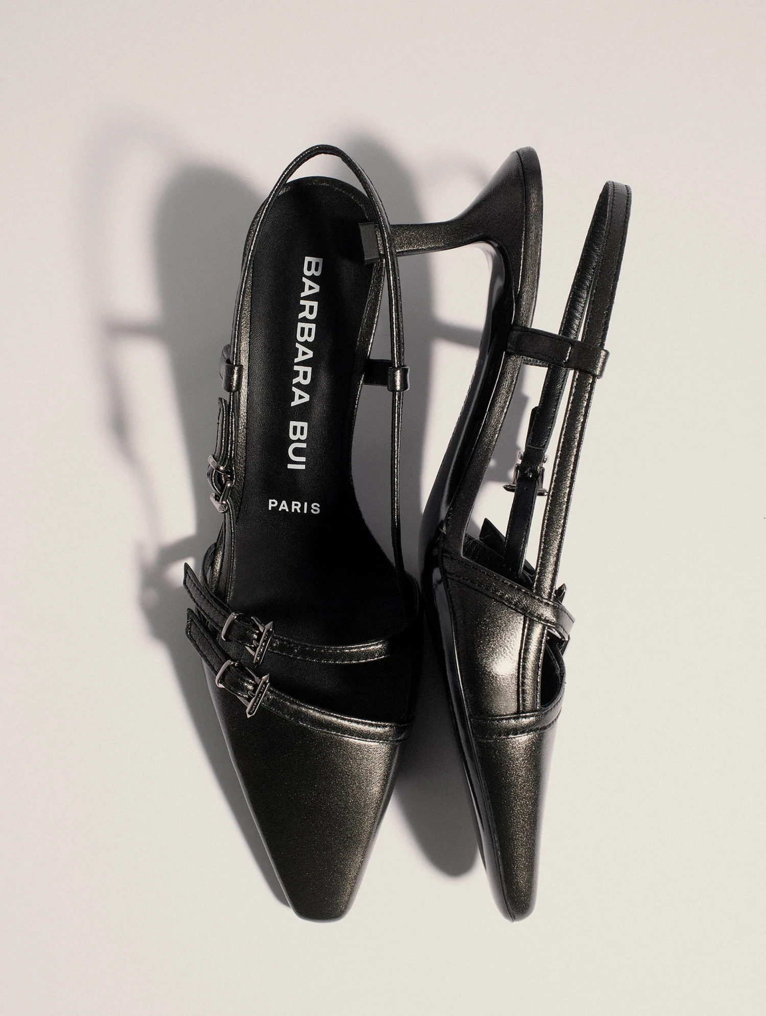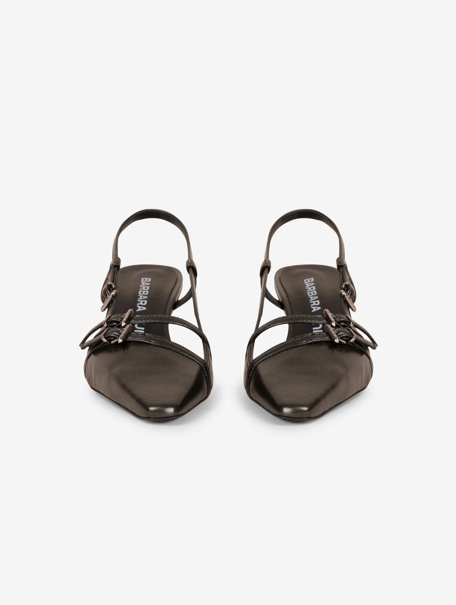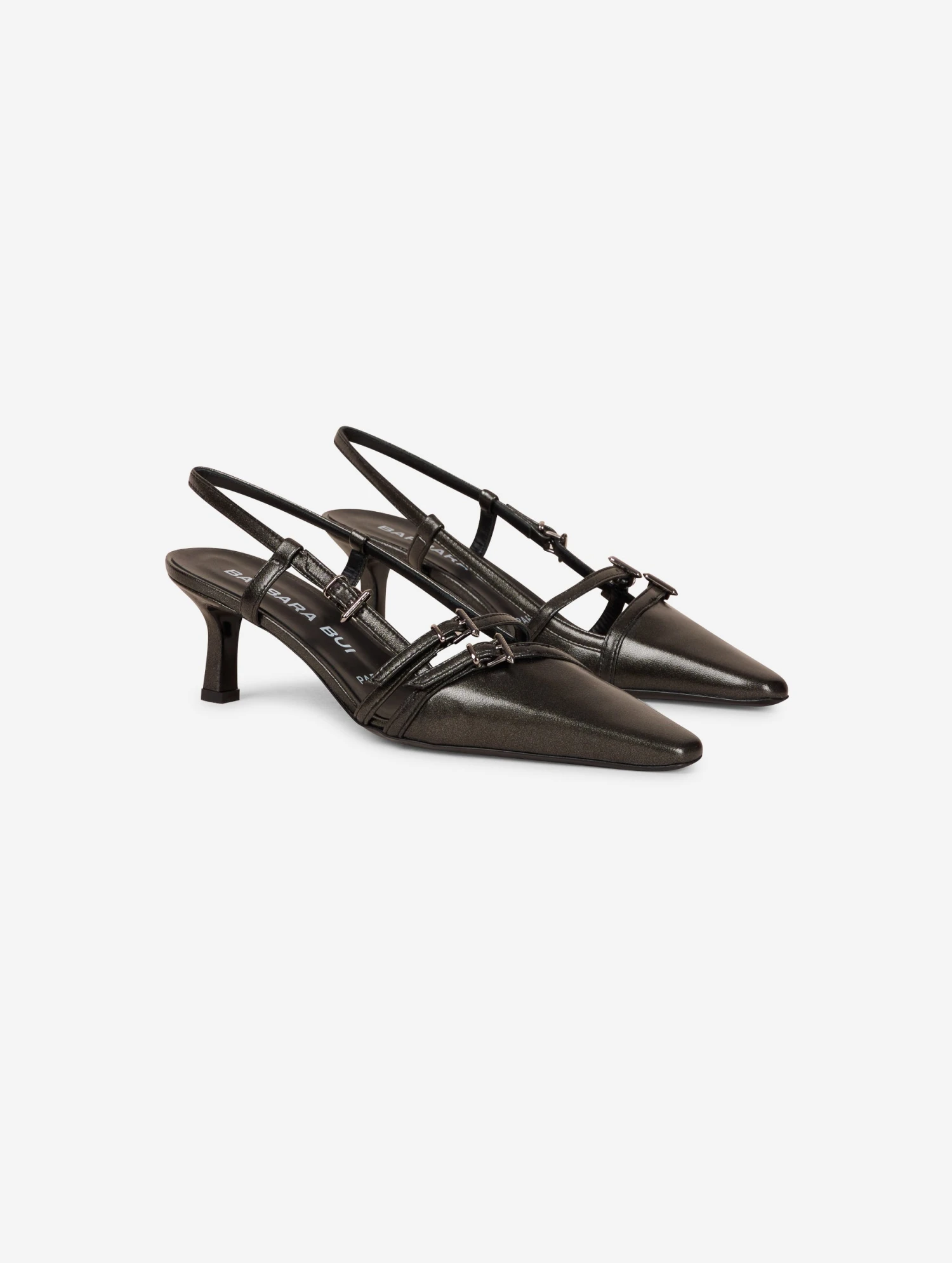 Escarpins dos ouverts en nappa gunmetal. Jeu de fines brides asymétriques animées de boucles finition nickel . Petit talon sexy de 5,5 cm recouvert de cuir ton sur ton.