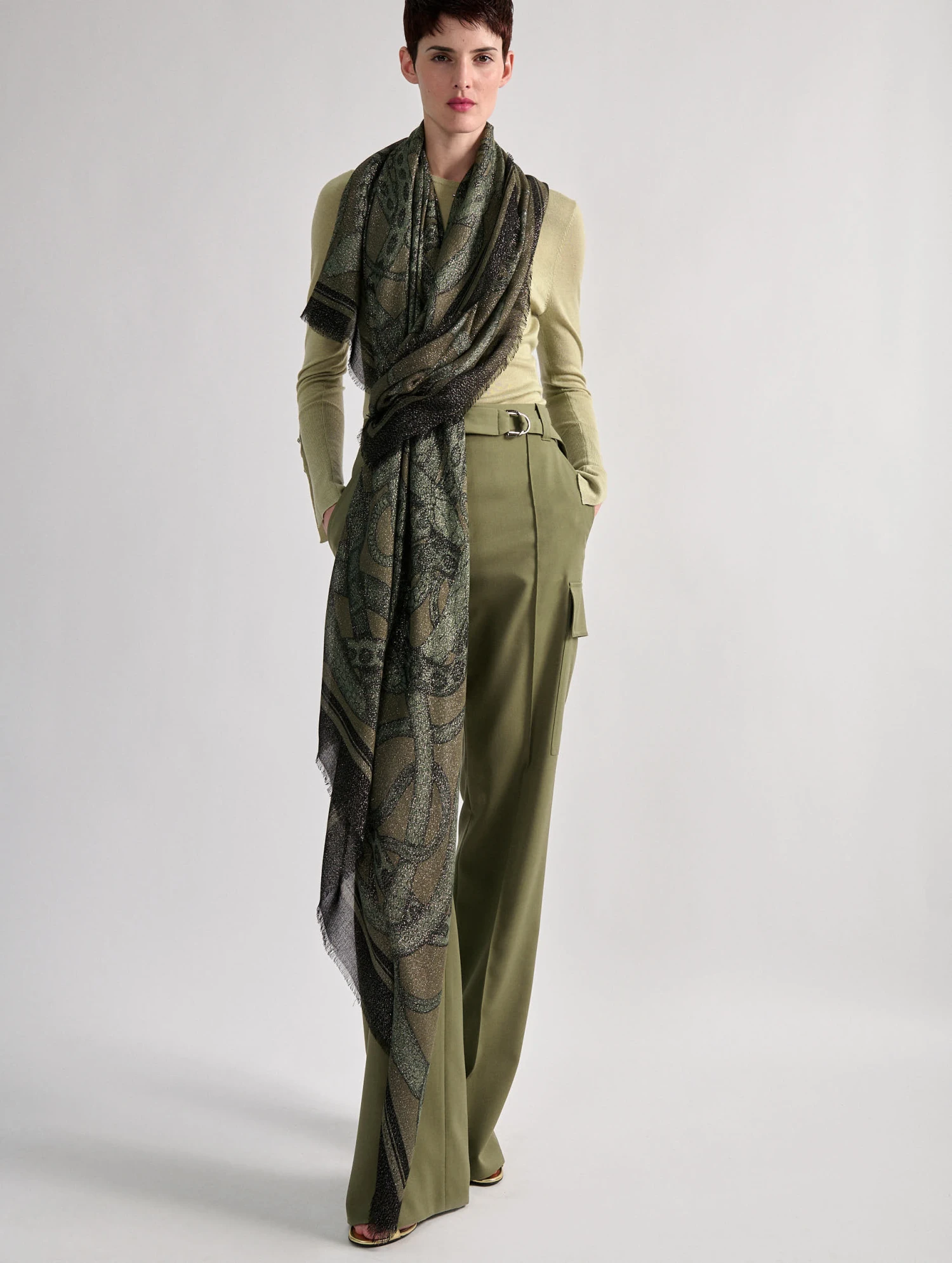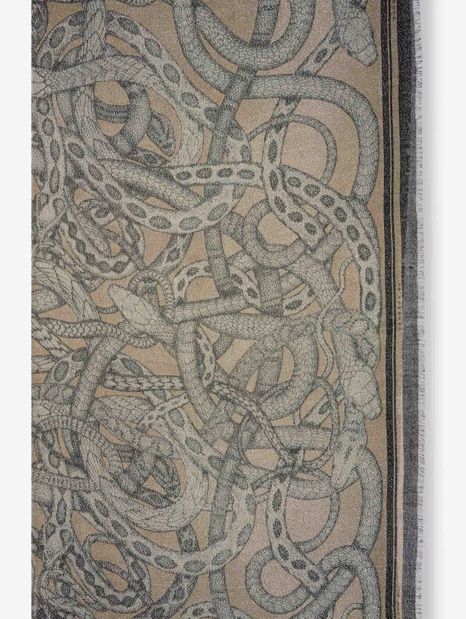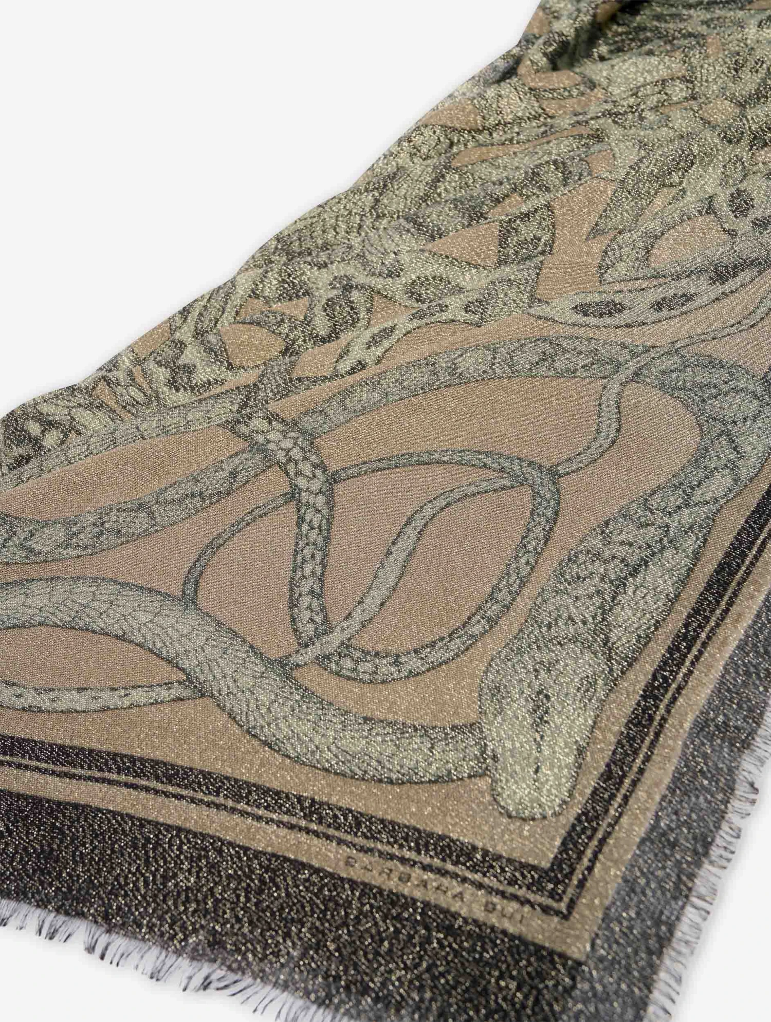 Énigmatique et envoûtant, le serpent, un symbole cher à Barbara Bui, s’invite dans les collections. Sur la thématique « attractive & venenous », cet imprimé exclusif est une des signature de la maison et est décliné cette saison dans une etoffe métallisée, doré et kaki.