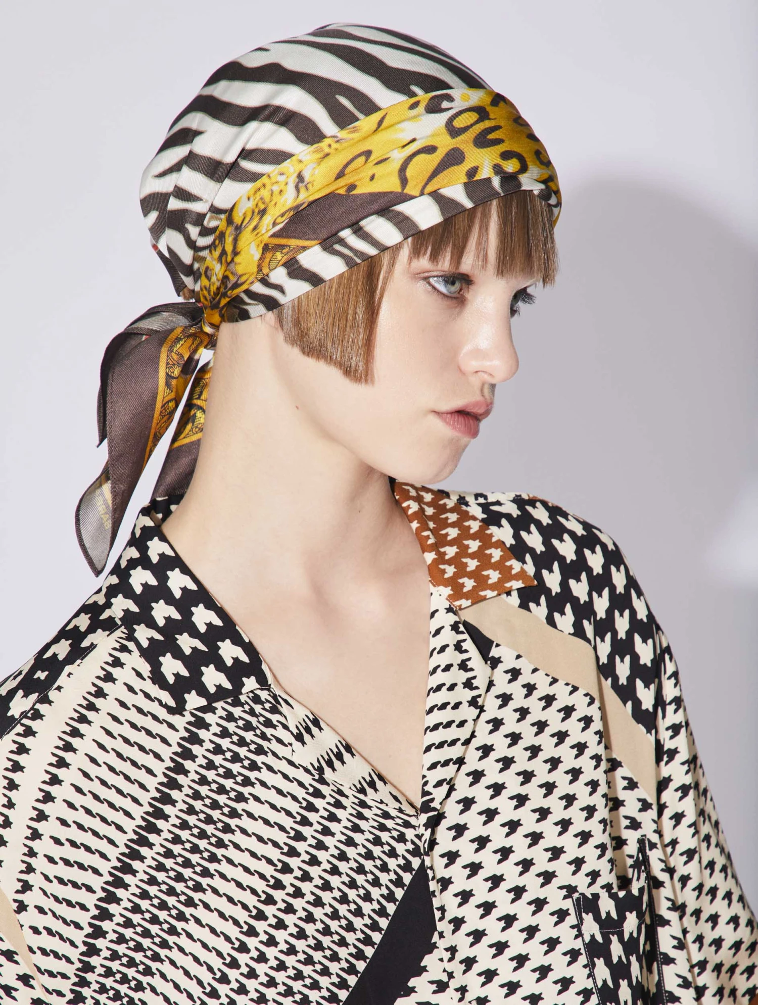 Envie d’apporter de l’originalité à vos looks de tous les jours ou à une tenue de vacances estivale ? Optez pour ce foulard de soie et son imprimé d’inspiration tropicale. Mélange de motifs animaliers, son imprimé exclusif à notre maison vous assure d’insuffler de la fantaisie et de la couleur aux tenues les plus classiques. La signature de notre marque parisienne s’y appose dans un coloris orangé s’accordant parfaitement à ses nuances chaudes. Porté en bracelet autour du poignet, en bandana sur des cheveux lâchés ou autour du cou, ce grand foulard en soie apporte à votre silhouette une élégante touche finale.