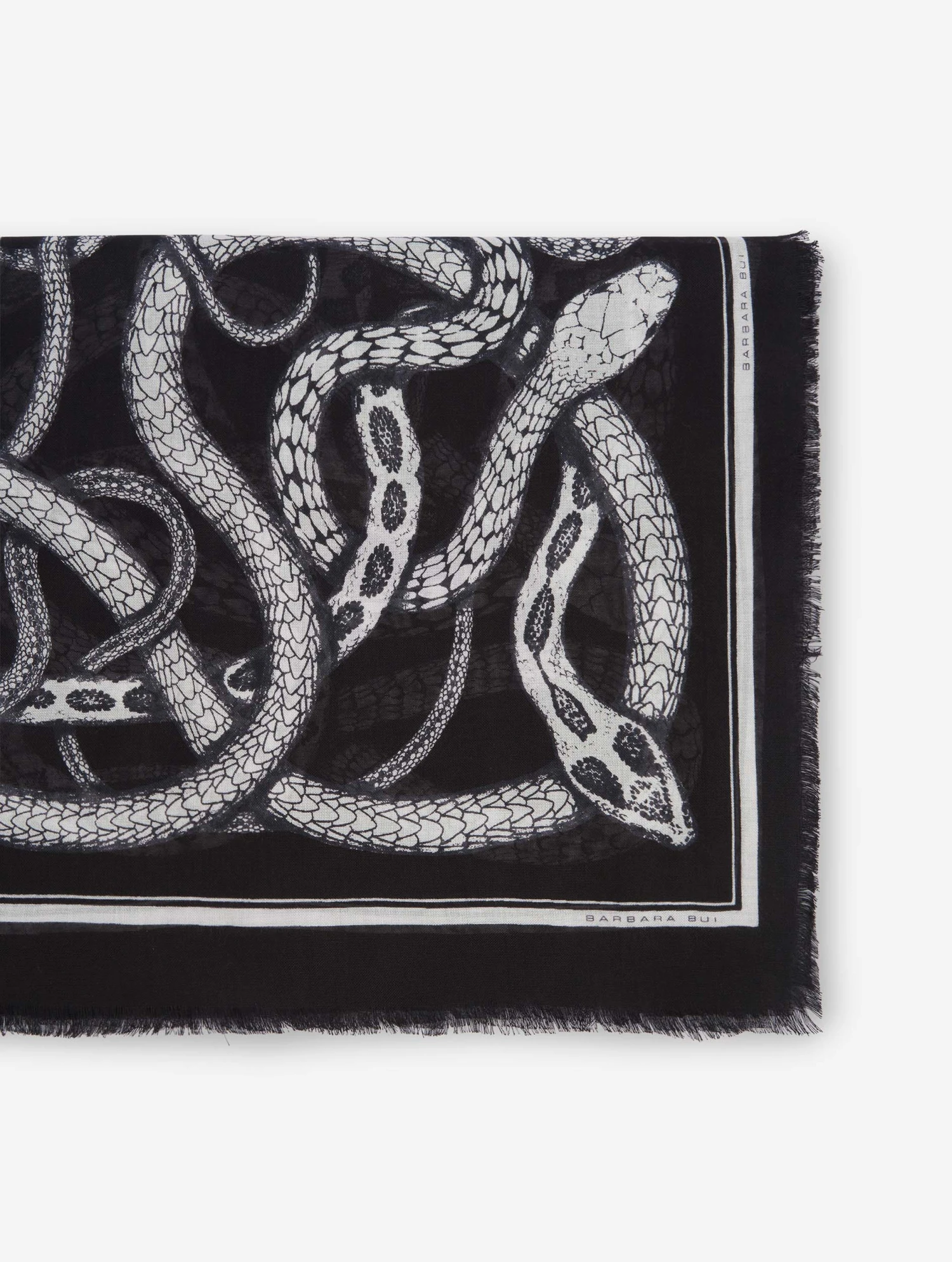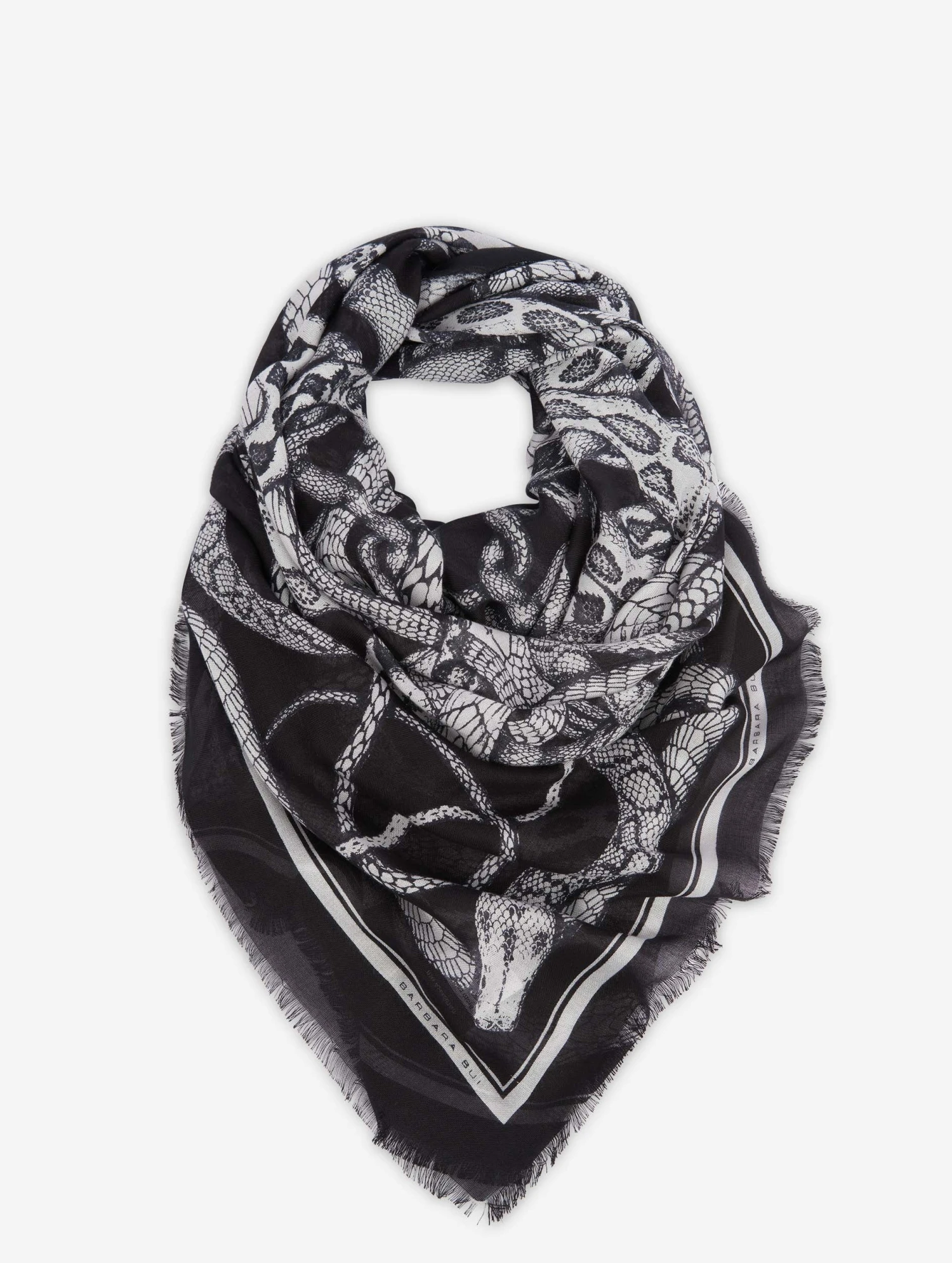 Ce motif aux serpents entrelacés est un imprimé iconique de notre maison retravaillé par notre créatrice à partir de nos archives personnelles. Adoptant des teintes noires et blanches indémodables, ce foulard femme se portera aisément avec notre vestiaire automne-hiver ou un total look monochrome. Ses bords francs renforcent l’allure rock de cet accessoire. Avec le temps, ses finitions légèrement frangées évolueront pour lui donner un style authentique. Ce foulard en viscose douce et fluide vous accompagnera du matin jusqu’au soir pour habiller vos looks les plus simples ou pour accentuer une tenue au caractère affirmé.