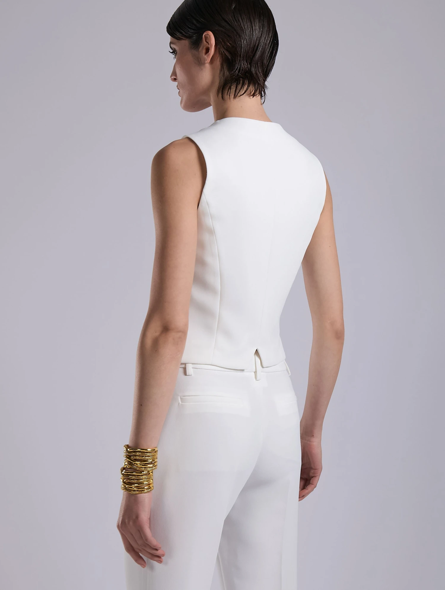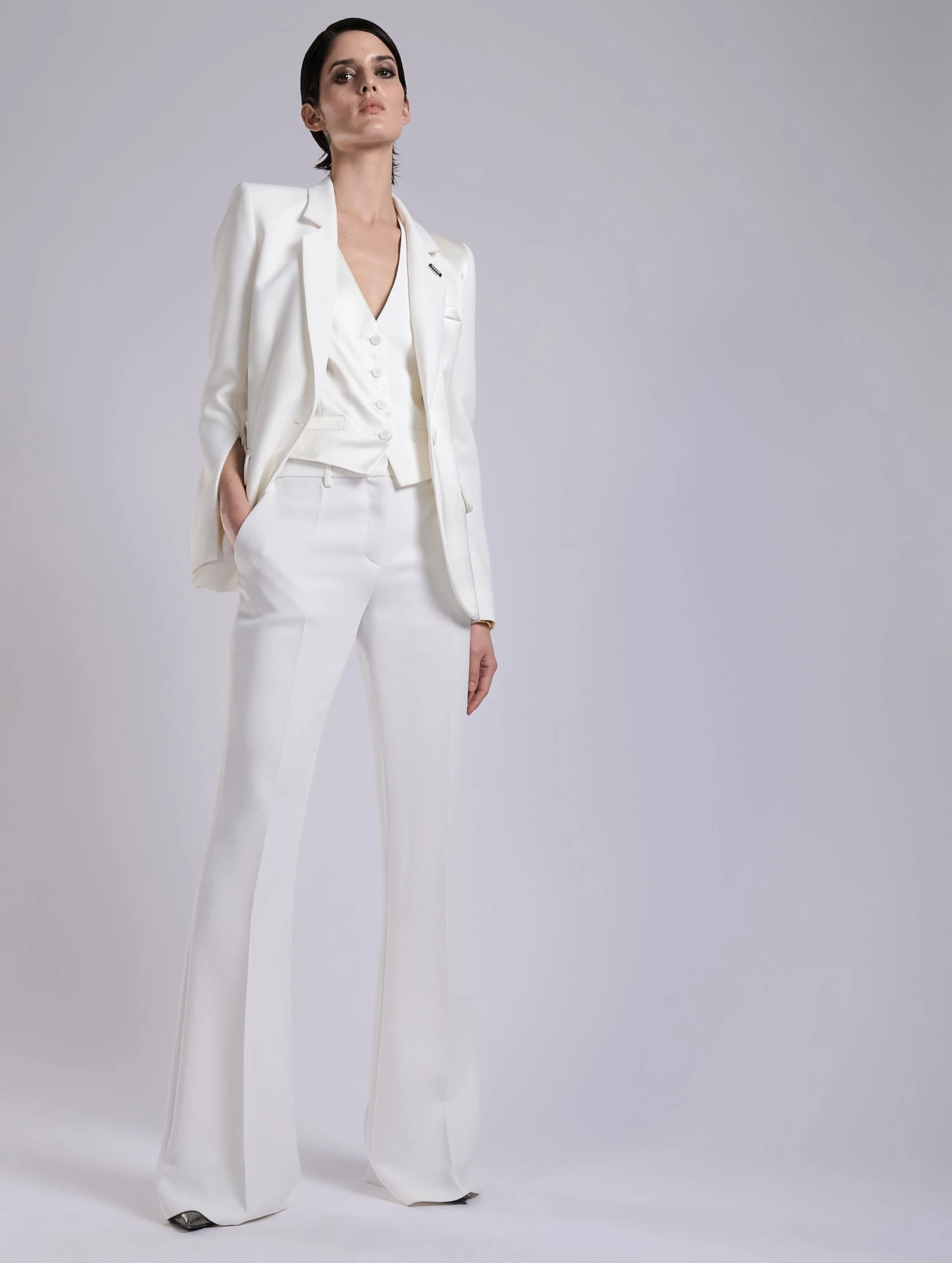 Pensé pour être porté seul, tel un top, ou pour s’affirmer comme l’allié indispensable d’un costume trois pièces, ce gilet de costume en crêpe ivoire et satin ton sur ton incarne l’ambivalence des genres chère à la Maison. Sa coupe impeccable et ses finitions parfaites soulignent ses lignes nettes, à la croisée du tailoring masculin et de la sensualité féminine. À associer au pantalon et à la veste coordonnés pour un total look smoking blanc ou à détourner avec un pantalon plus décontracté.