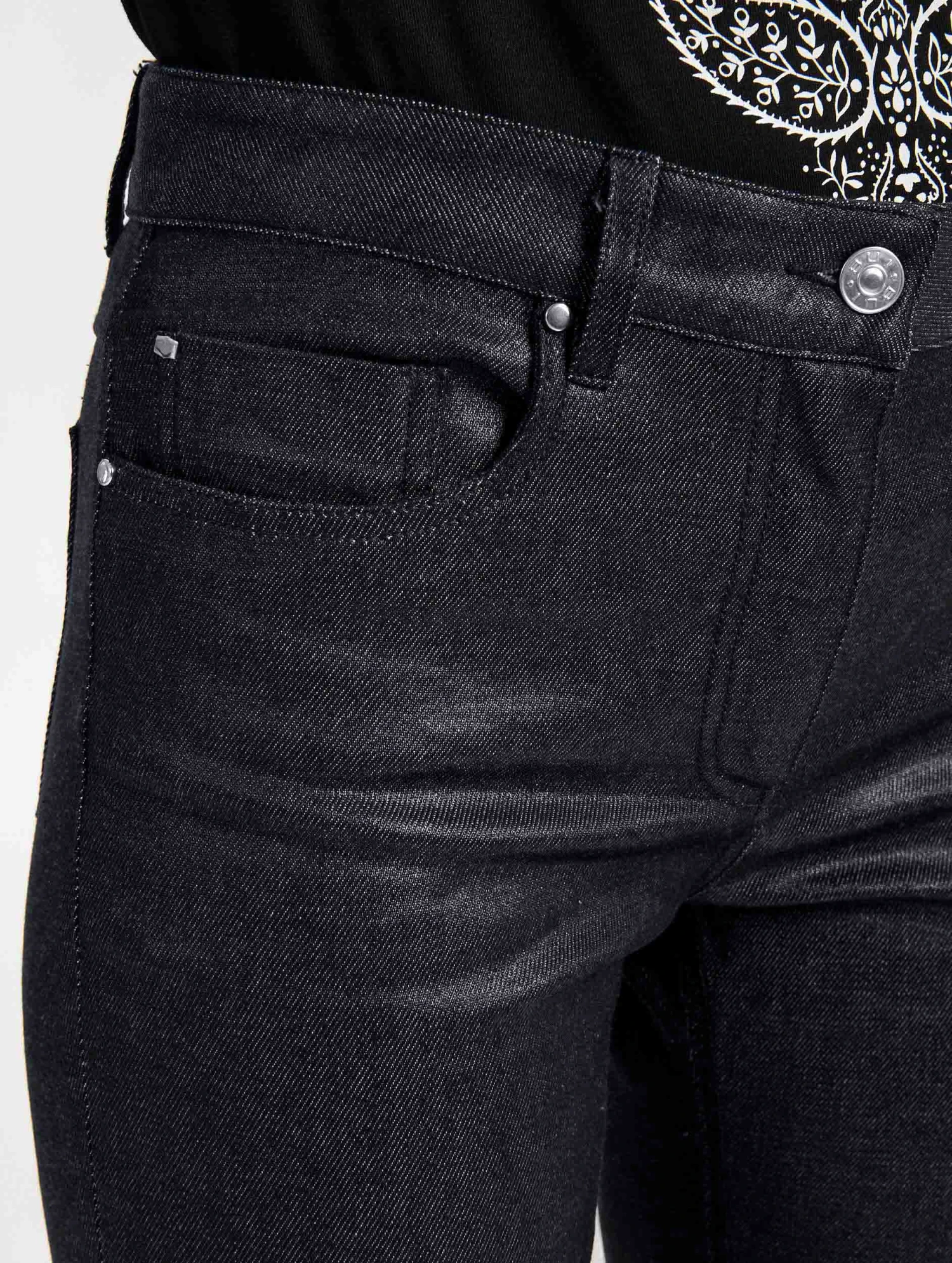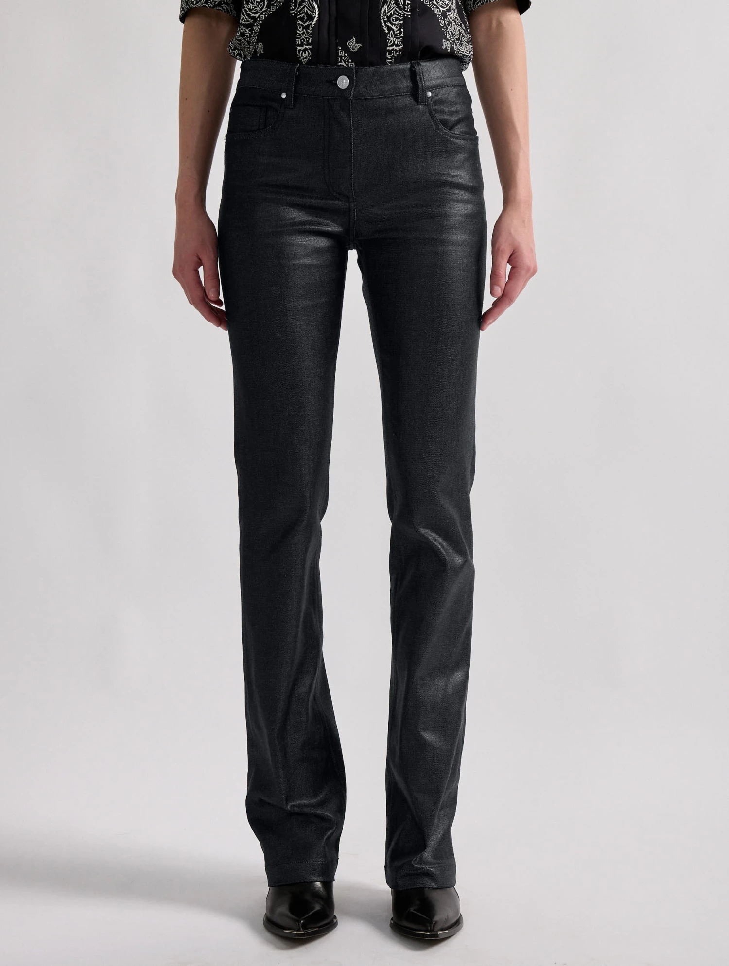Ce jean 5 poches en denim résiné noir ou gold élance la silhouette avec sa coupe ajustée jambes droites. Sur la poche ticket, vous retrouverez le « gold tab », détail bijou rock et précieux en métal plaqué or, signature des denims Barbara Bui depuis toujours. Associé à une veste, en alternative savamment décontractée à un pantalon de costume, ce jean droit flatteur signe une silhouette éminemment moderne.