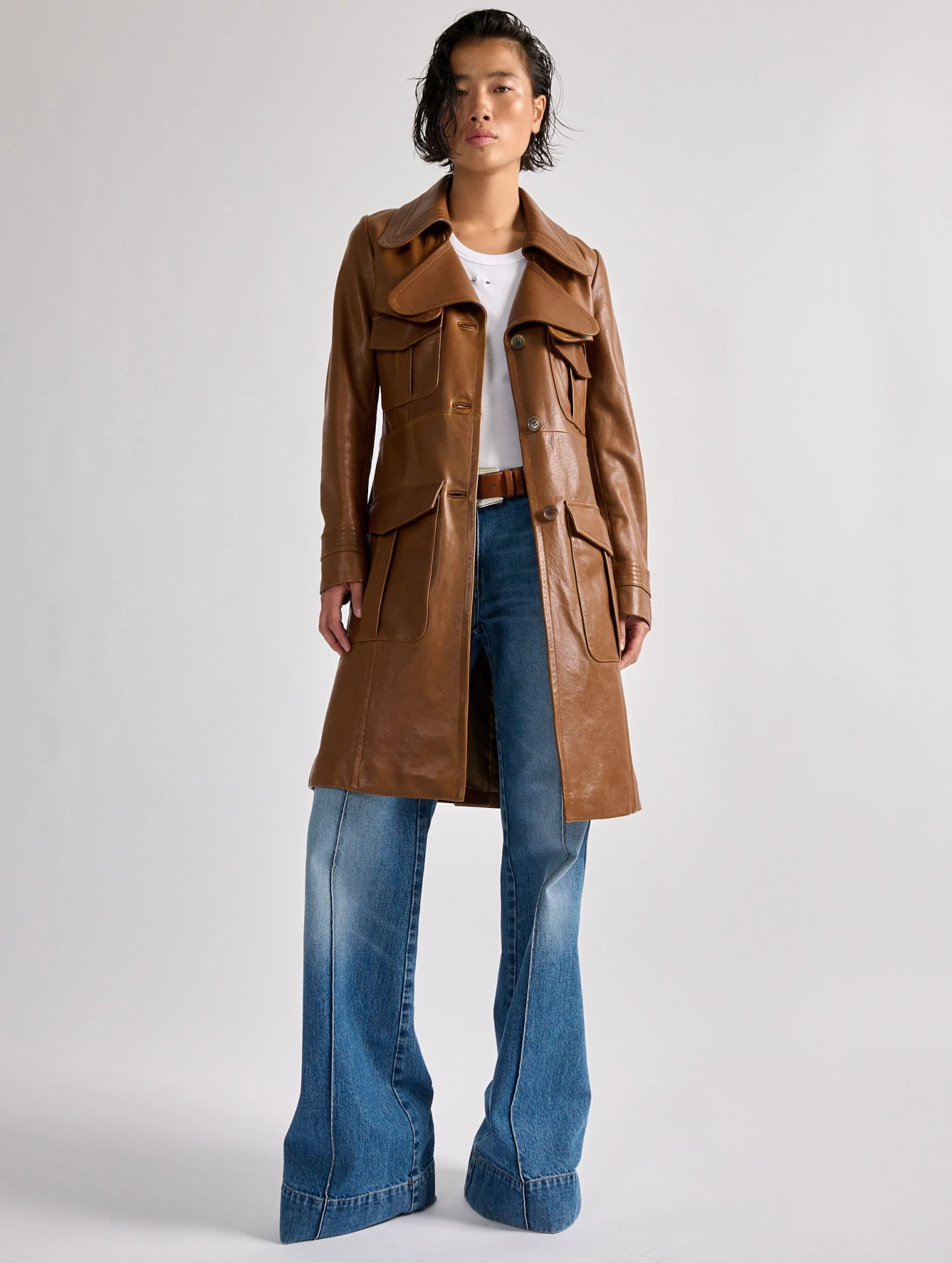 Réalisé dans un cuir d’agneau plongé ponctué de surpiqûres soignées, ce manteau ravive le cool des années 70. Cette pièce de caractère s’approprie des détails empruntés au trench-coat et à la saharienne tandis que sa coupe cintrée en souligne l’élégance. Associé aux pantalons coupe flare de la saison ce manteau mi-long proposé en cuir navy ou camel fait une apparition remarquée dans le vestiaire Barbara Bui.