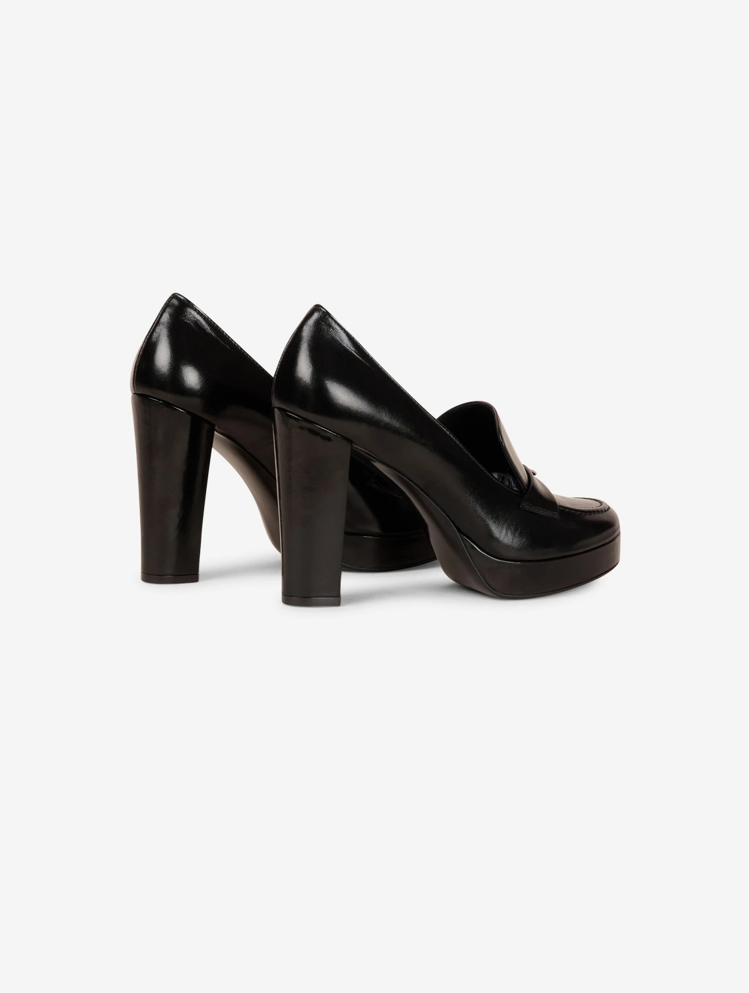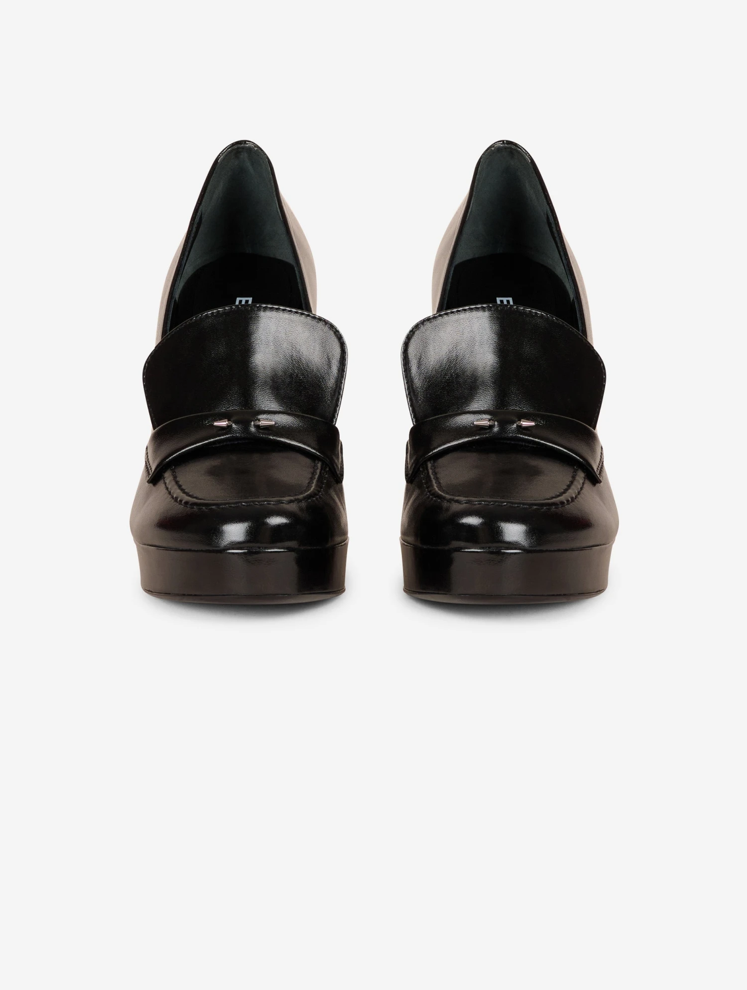 Mocassins en cuir nappa verni noir orné de notre piercing signature en métal. Plateau de 2,5 cm et talon de 10,5 cm, recouverts de cuir ton sur ton.