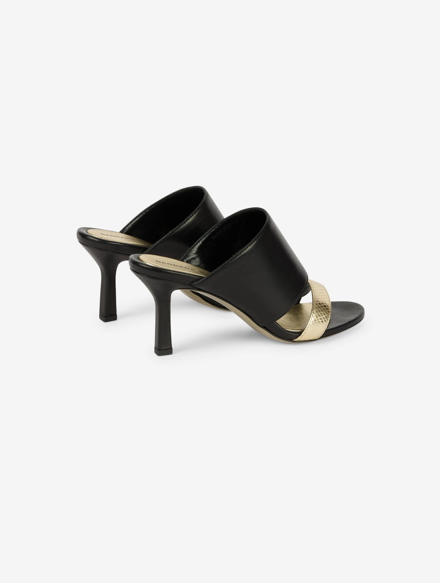 Mules en nappa noir et cuir gaufré doré clair. Semelle intérieur ouatinée en contraste graphique de nappa noir et métallisé doré clair. Talon sexy de 7,5 cm recouvert de nappa noir.