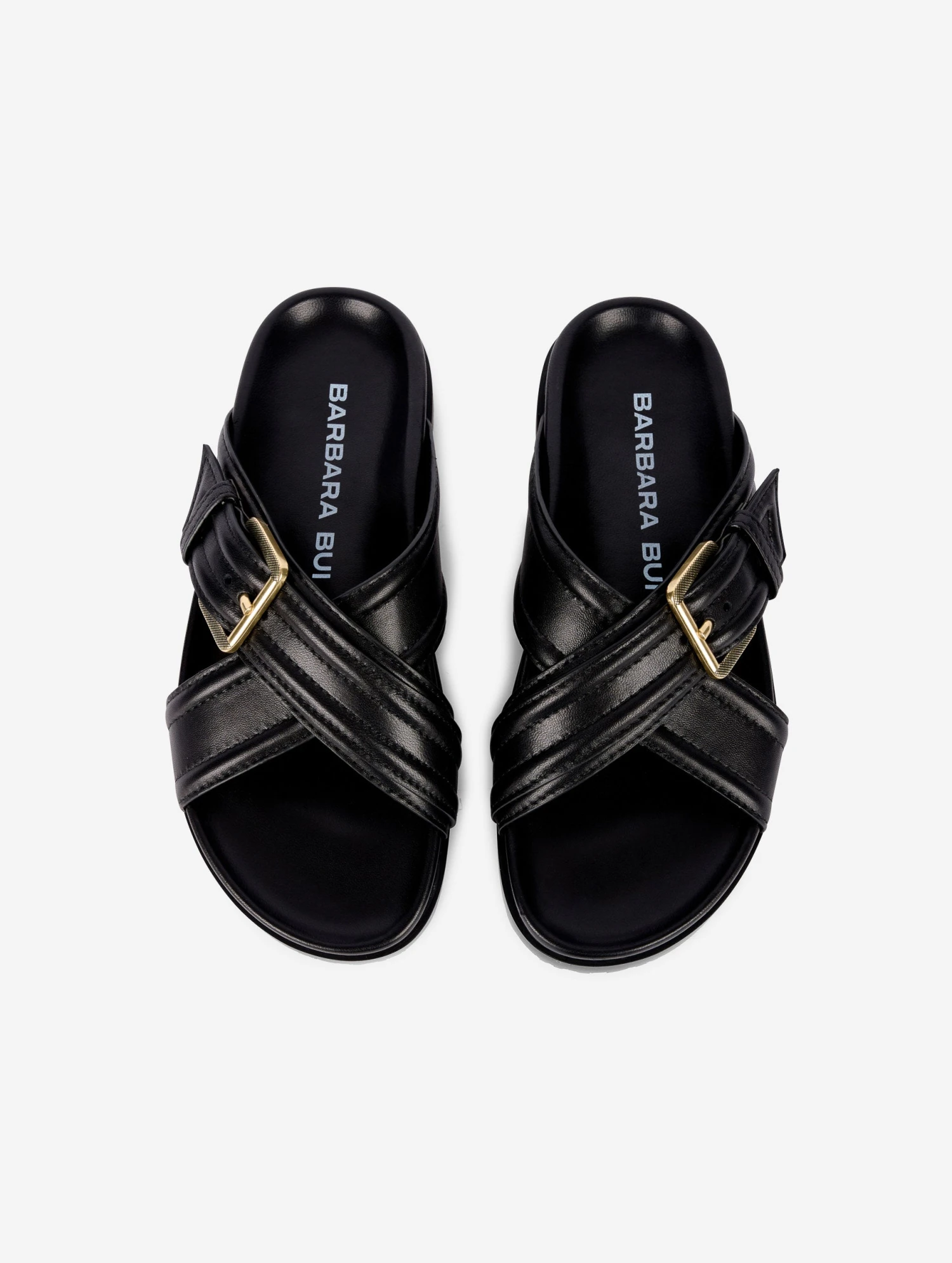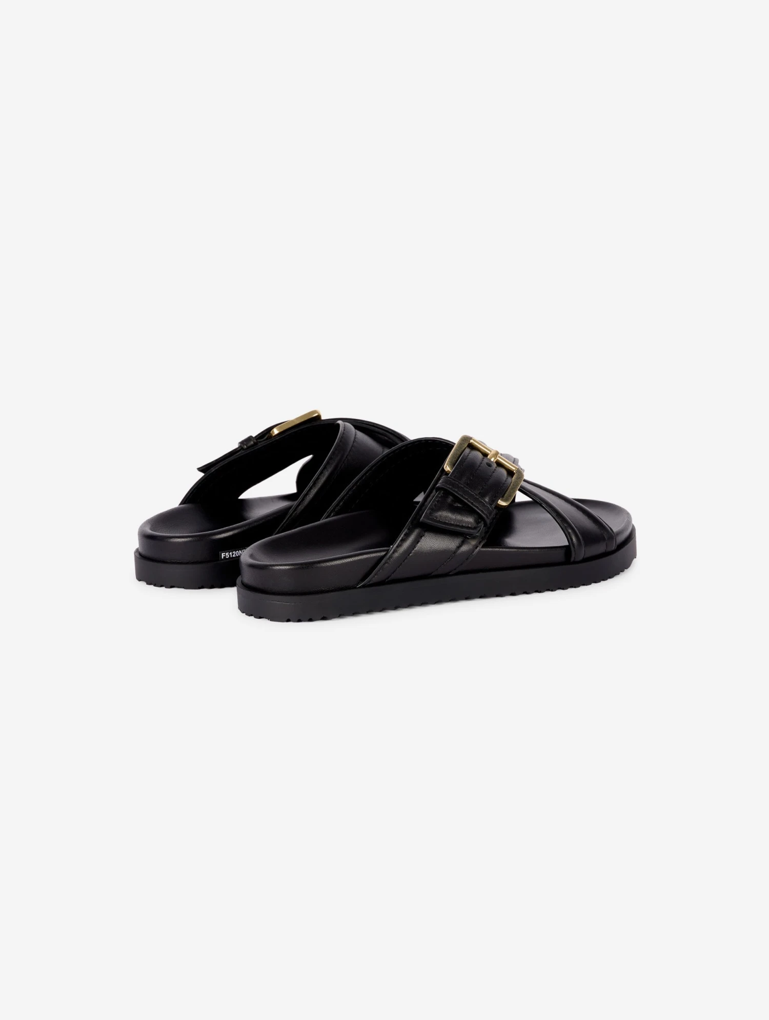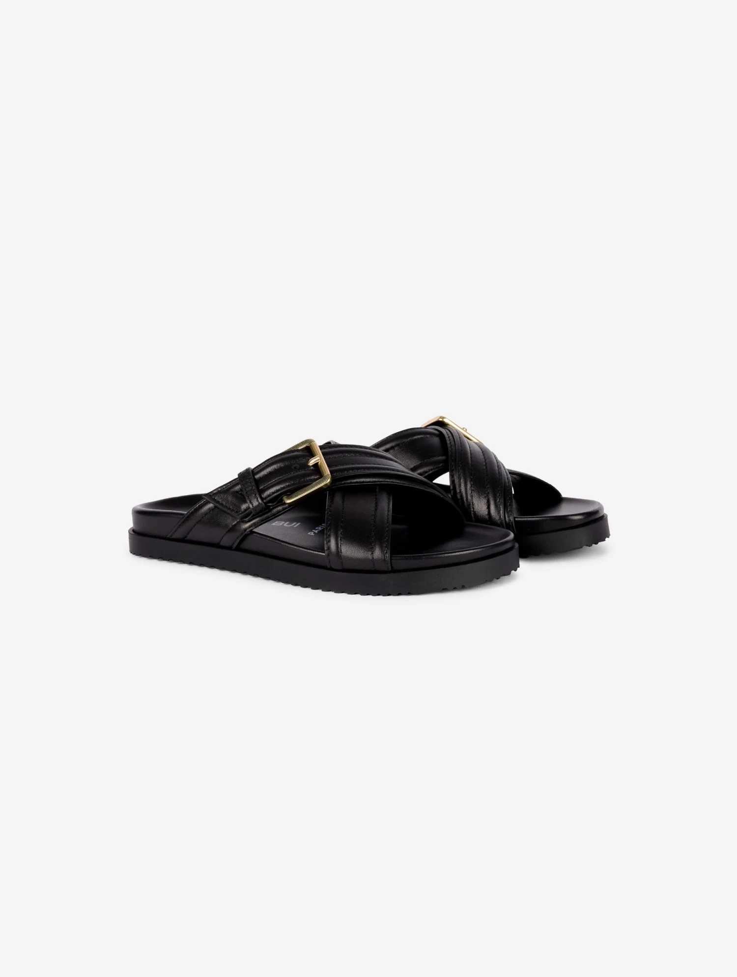 Mules à larges brides croisées en nappa noir fixées par une ceinture à grosse boucle militaire finition laiton vieilli. Finition bombée à double couture façon vintage. Semelle anatomique également recouverte de nappa noir. Semelle en gomme crantée.