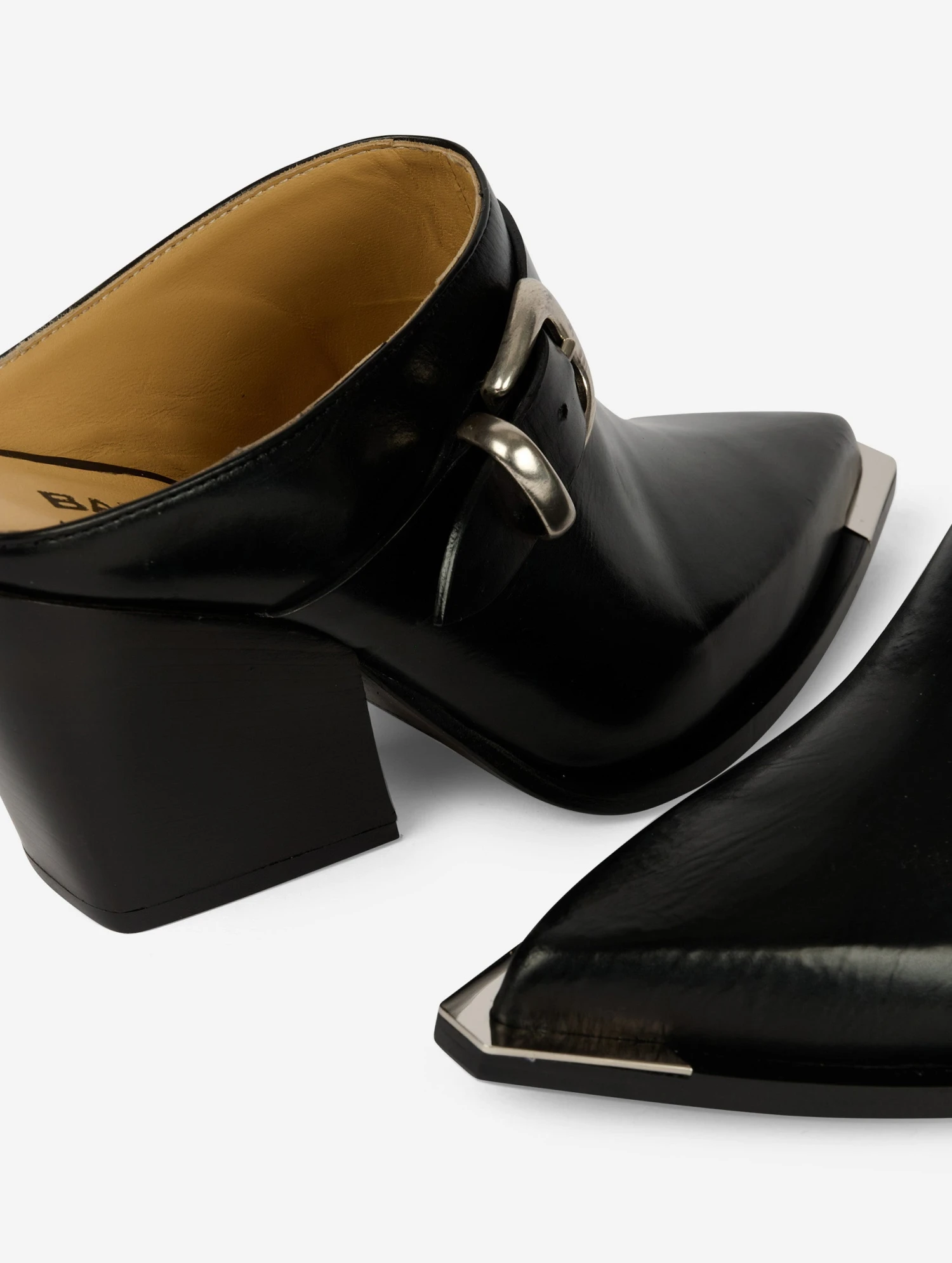 Mules sabots en cuir brillant noir. Ceinture coup de pied fermée par une boucle en métal vieil argent. Forme « santiag » féminisée par un talon de 7,5 cm, large semelle graphique soulignée en pointe par une plaque de métal.