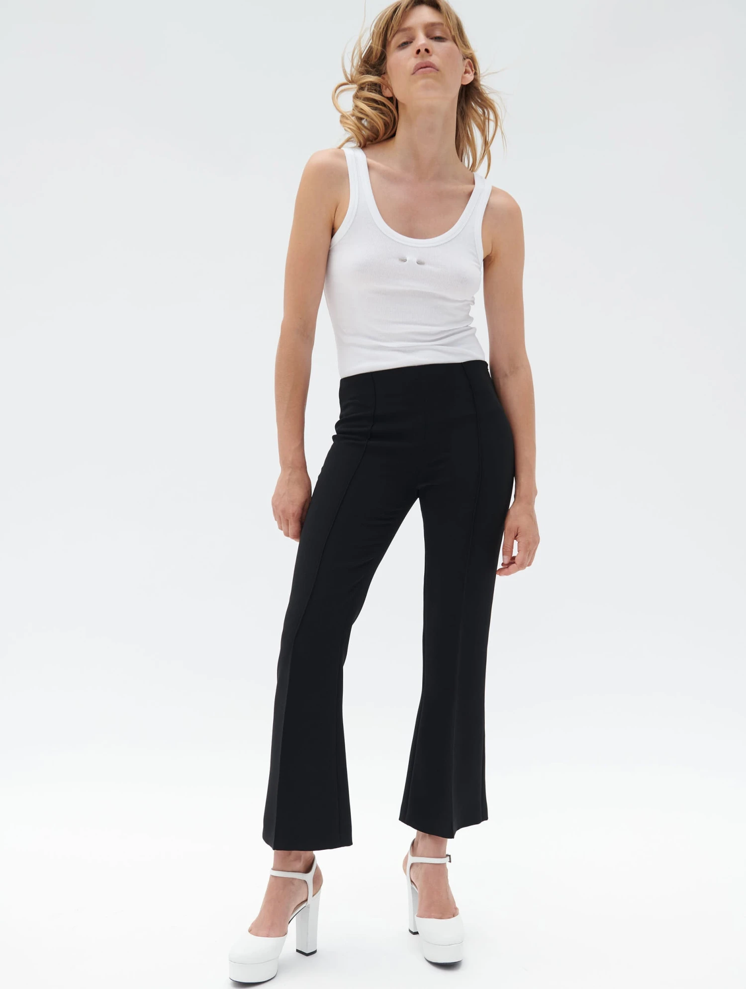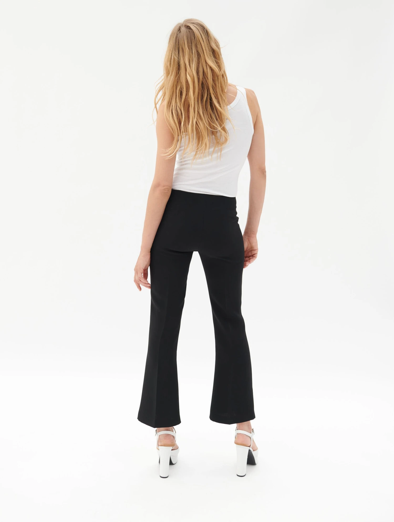 Notre pantalon de costume Roxy en crêpe confortable est proposé pour la saison printemps-été dans une coupe flare de longueur 7/8 révélant élégamment la cheville. Ce pantalon de tailleur féminin allonge la jambe grâce à sa coupe raccourcie et son pli cousu le long de la jambe. Pour accentuer cet effet, n’hésitez pas à lui associer une paire de sandales à plateformes. Ce pantalon femme minimaliste proposé en blanc, noir ou bleu délavé pastel se porte de manière décontractée simplement associé à un débardeur en coton ou plus habillé à l’occasion d’un évènement, d’un mariage ou d’une cérémonie civile grâce à la veste de costume assortie.