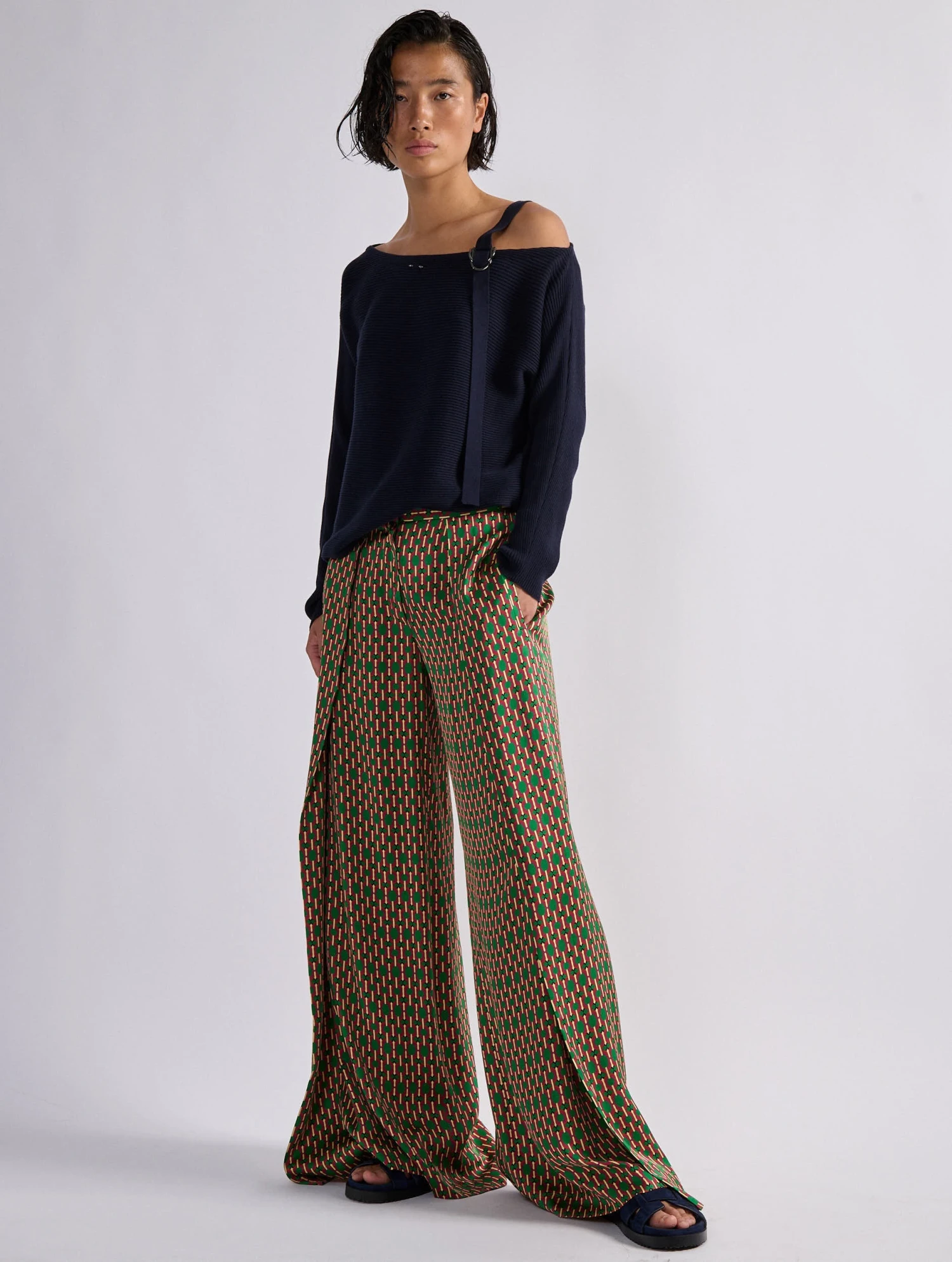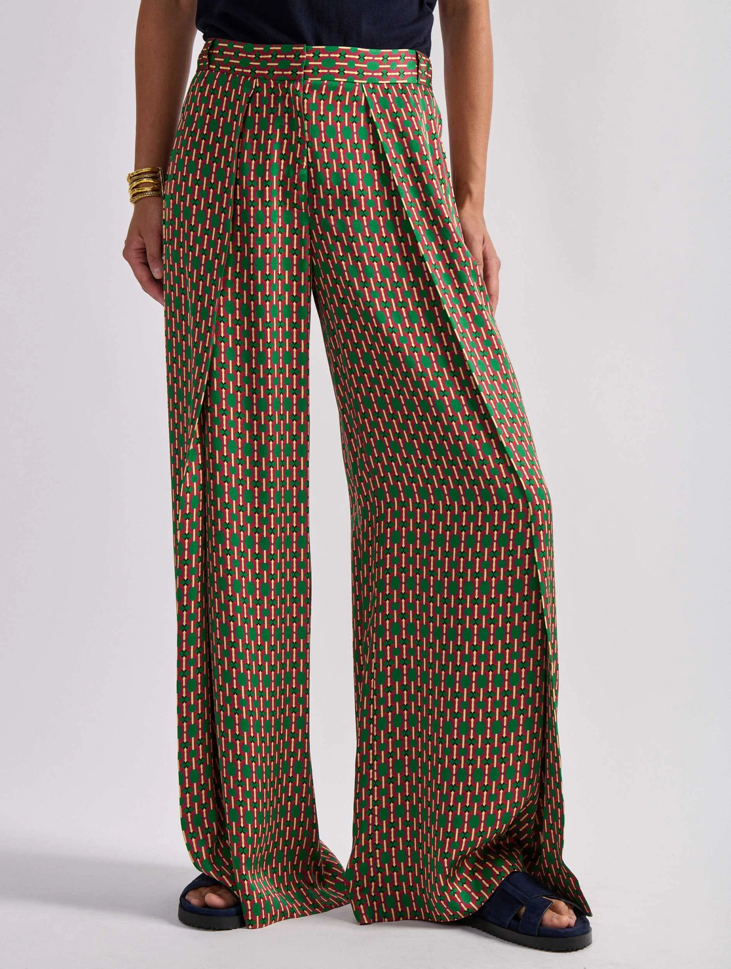 Ce pantalon à jambes larges apportera une touche graphique contemporaine à vos tenues estivales, de la ville à la plage. Son motif graphique, exclusivement dessiné pour la Maison, se marie parfaitement à un top uni pour des contrastes parfaitement maîtrisés. Ses plis soigneusement réalisés contribuent à l’attitude nonchalante et élégante de ce pantalon d’été imprimé.