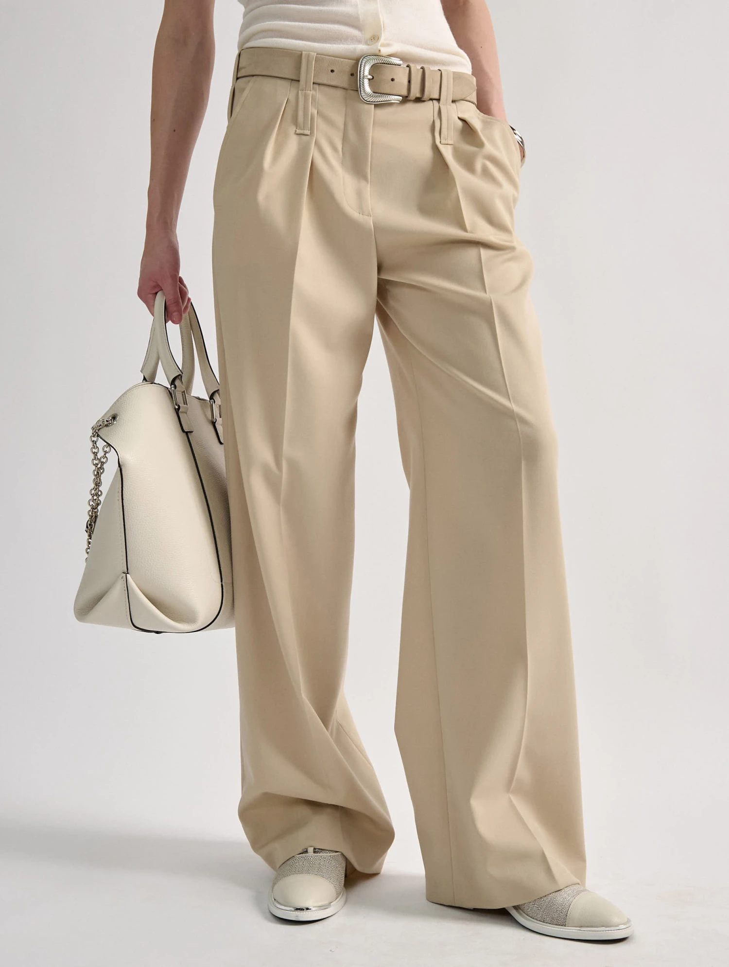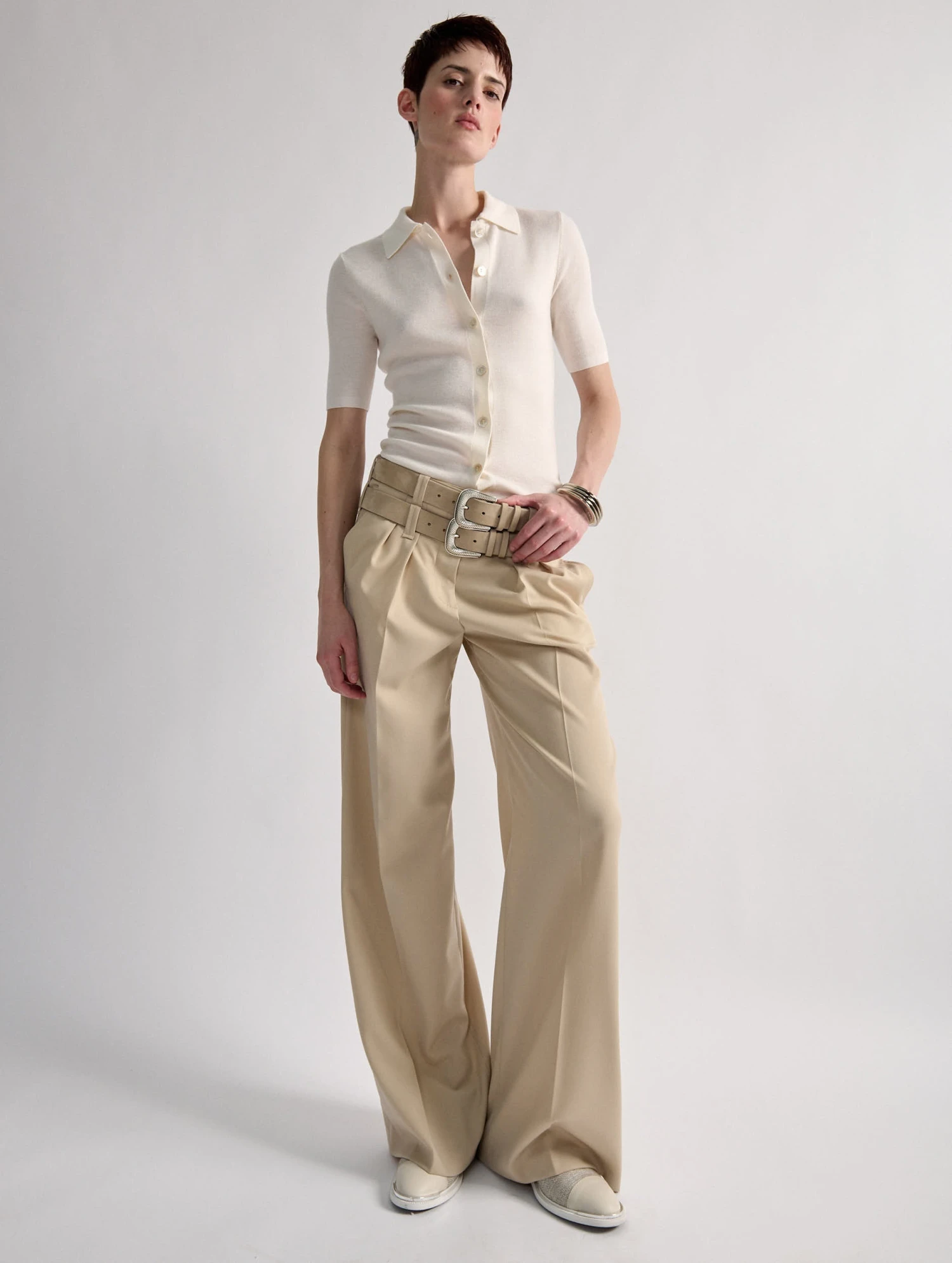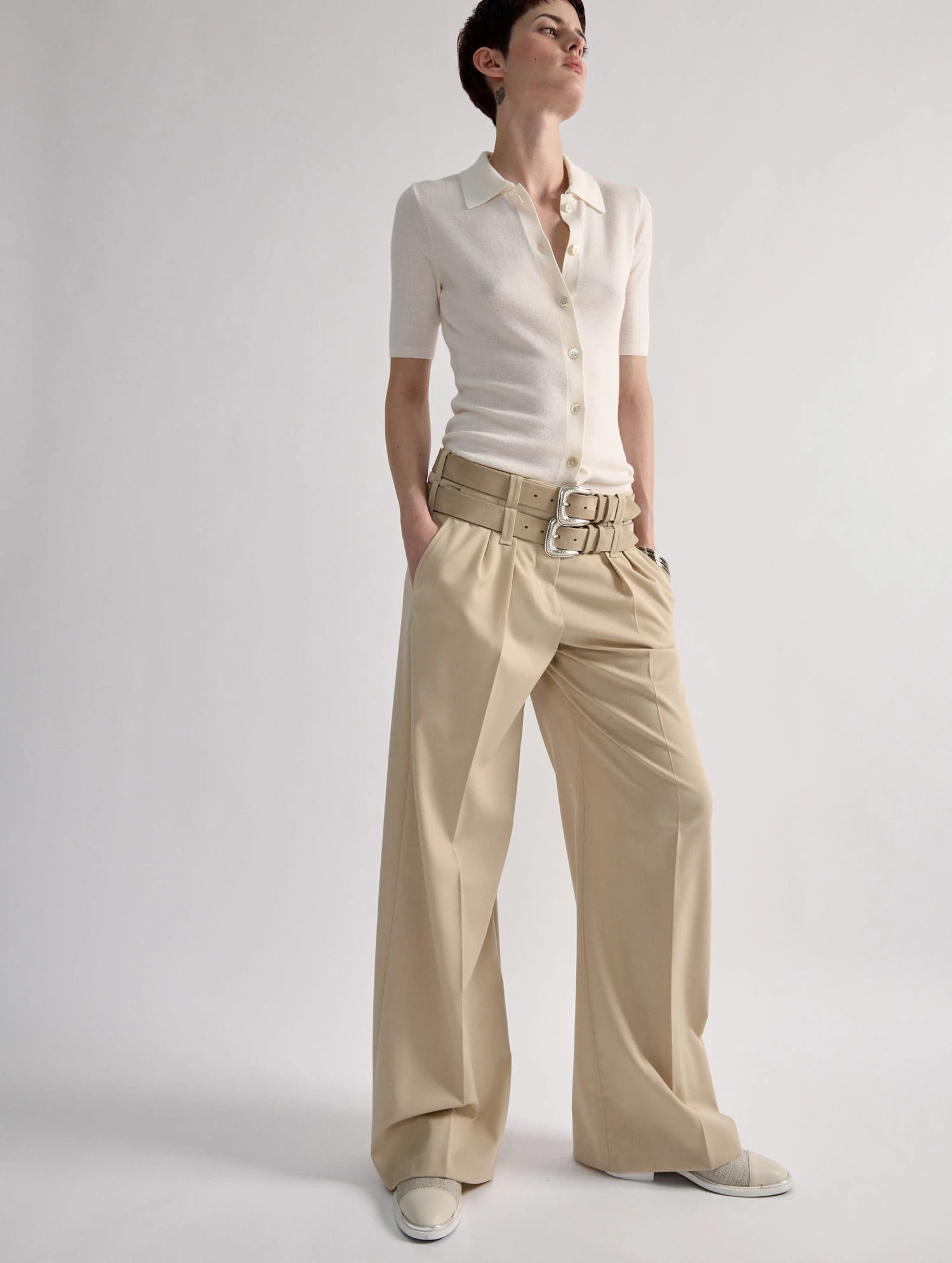 Décliné dans une gabardine de laine stretch sable ou navy, ce pantalon jambes larges à plis est doté de deux rangées de passants pour y glisser, au choix, une ou deux ceintures. En utilisant la second rangée de passants, vous obtiendrez ainsi un effet taille basse. Des finitions méticuleuses héritées du savoir-faire sartorial bien connu de la Maison.
