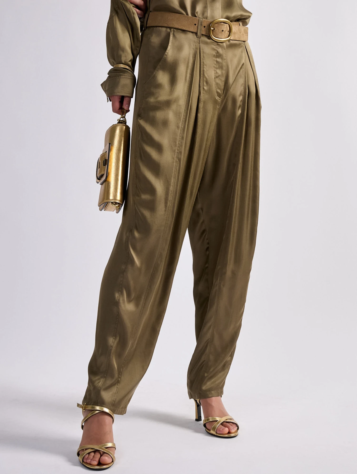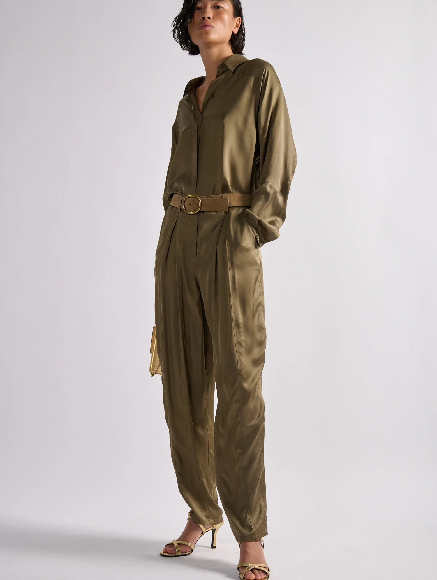 En jouant l’ambivalence entre structure et fluidité, ce pantalon femme affirme son originalité. Réalisé dans une étoffe fluide sable ou kaki, ce pantalon à plis cousus apporte un effet de volume résolument contemporain aux silhouettes. Promesse de confort et de douceur, ce modèle s’associe à la chemise assortie pour un effet combinaison pantalon très seyant.
