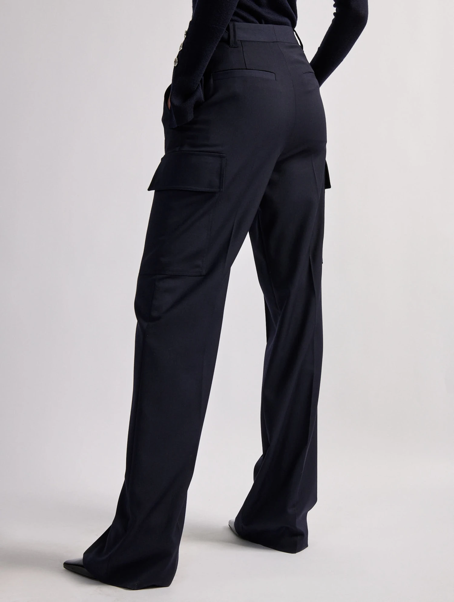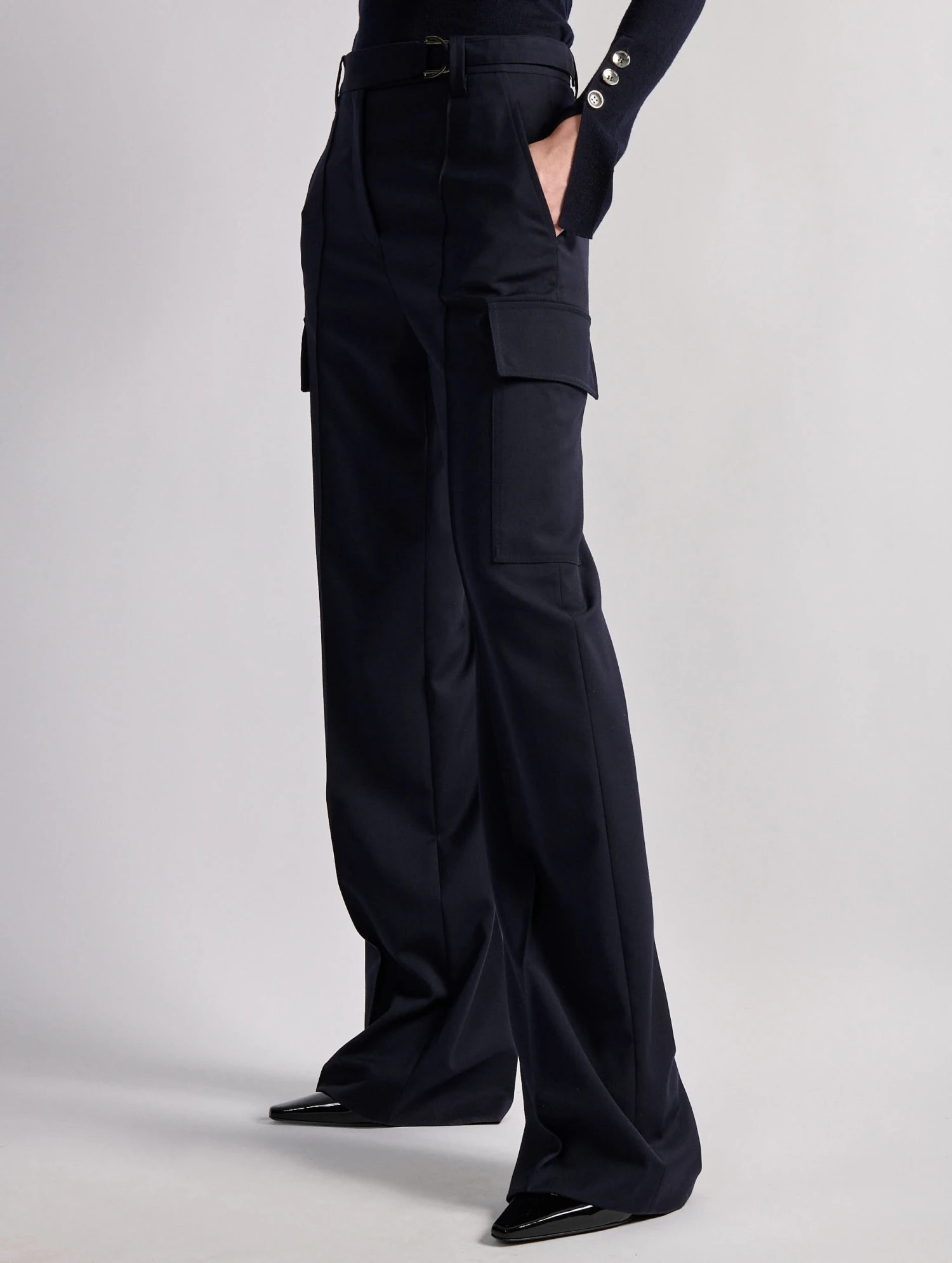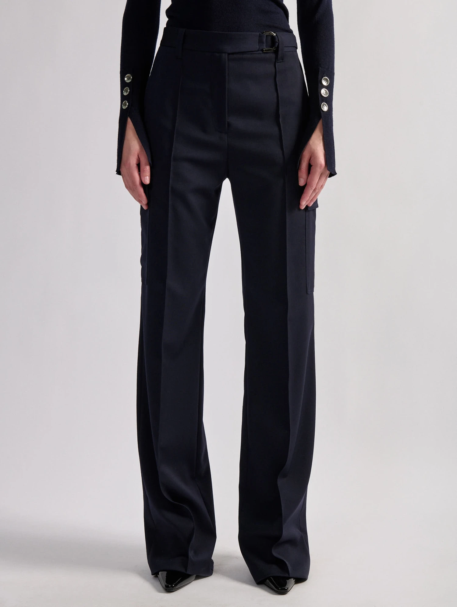– Patte de boutonnage cachée; Taille haute et jambes larges