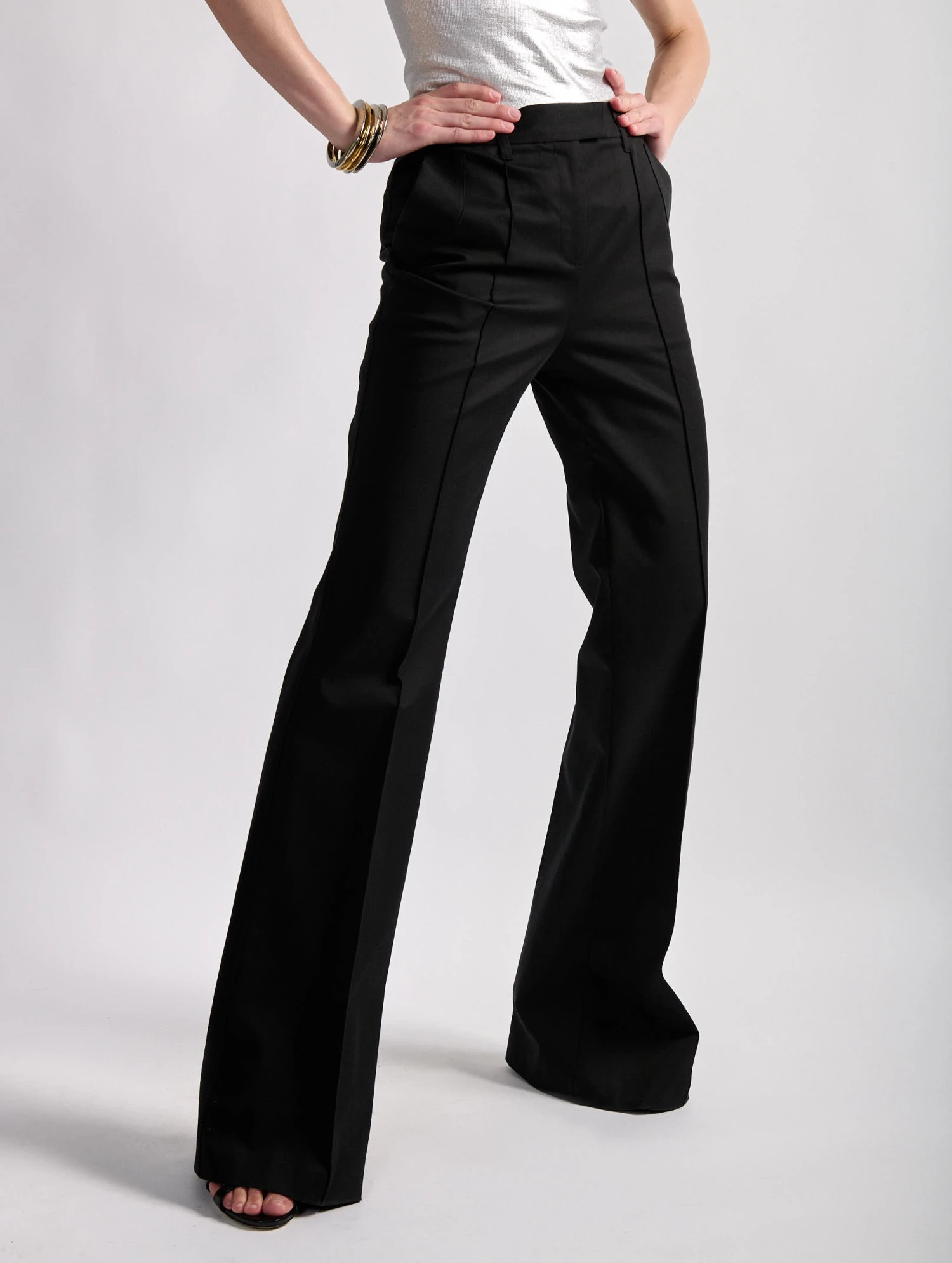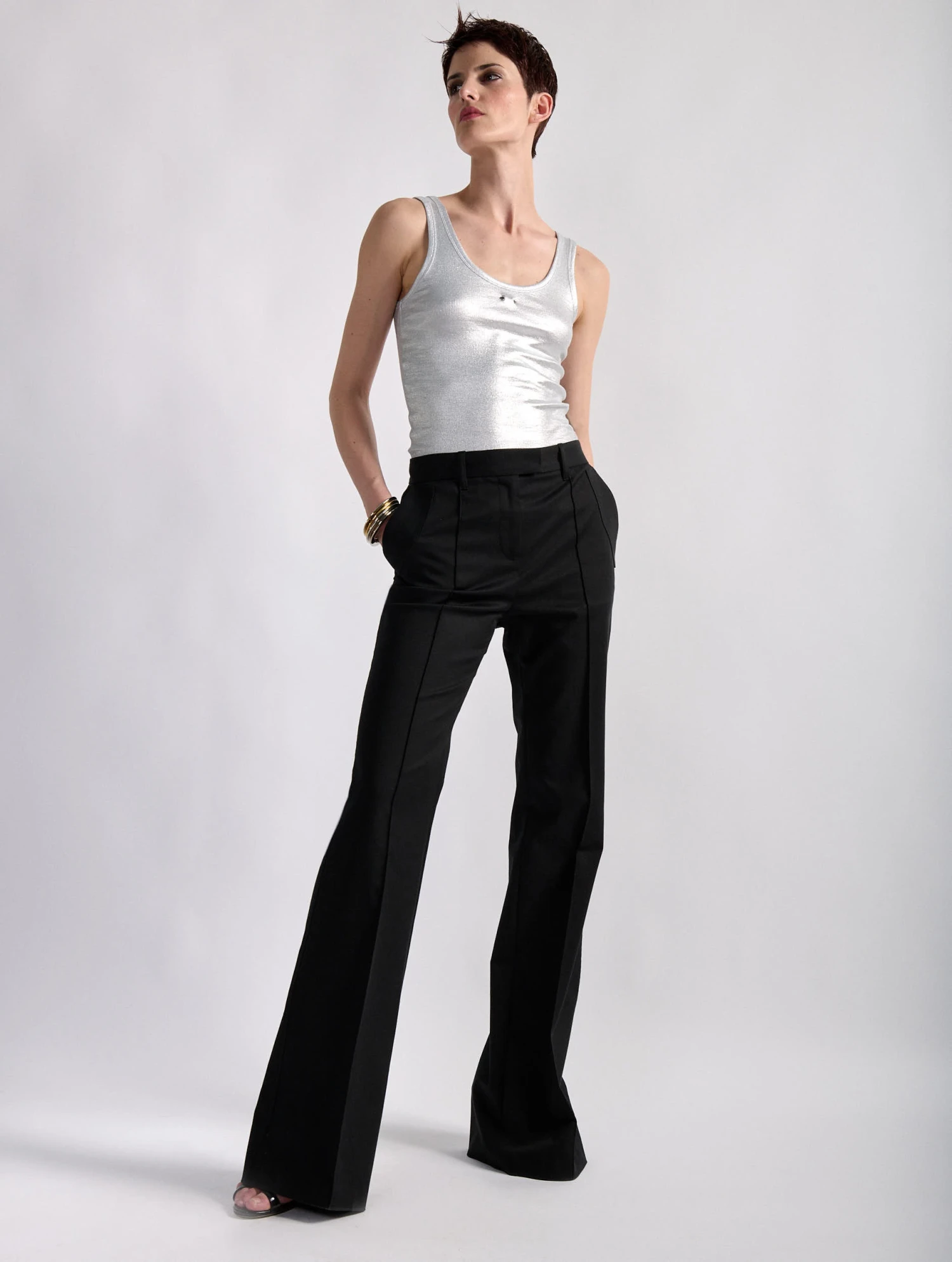 Réalisé dans une toile de coton stretch sable ou noir, ce pantalon femme bootleg allonge élégamment la jambe grâce à sa coupe et ses plis marqués le long de la jambe. Ses poches italiennes sont dotées d’un rabat en entrée de poche, un élégant trompe-l’oeil qui s’accorde parfaitement avec les détails de la veste 3 poches confectionnée dans la même toile de coton.