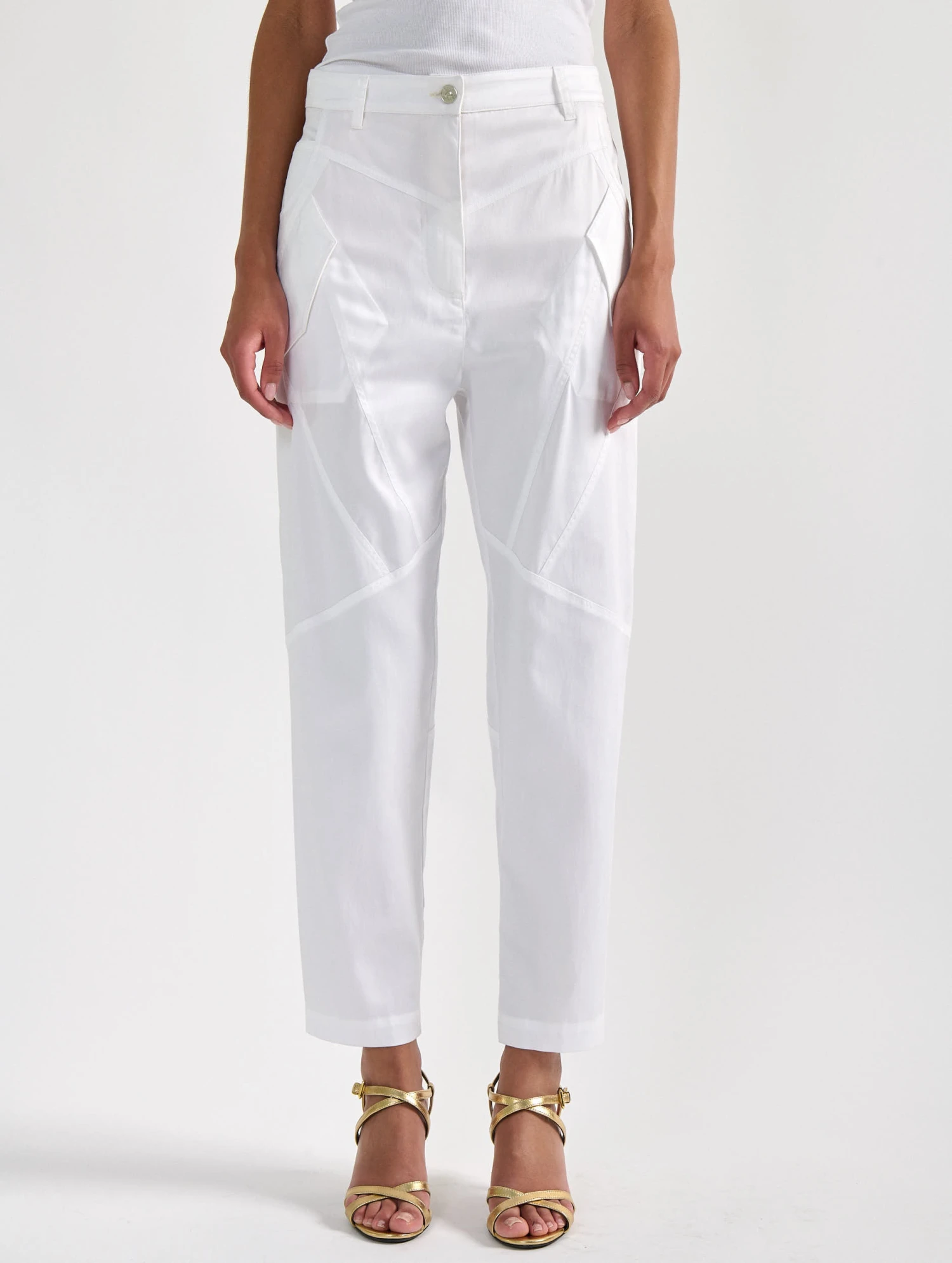 Idéal pour le printemps-été, ce pantalon cargo en satin mercerisé blanc ou kaki apporte une touche sport-chic aux tenues du quotidien. Ses détails de découpes et ses poches italiennes dotées de larges rabats pour un effet poches plaquées illustrent une inspiration utilitaire. Associé à la chemise au style militaire assorti pour un effet combinaison pantalon, ce pantalon cargo féminin acquiert une élégance sans équivoque à souligner grâce à une paire de sandales hautes.