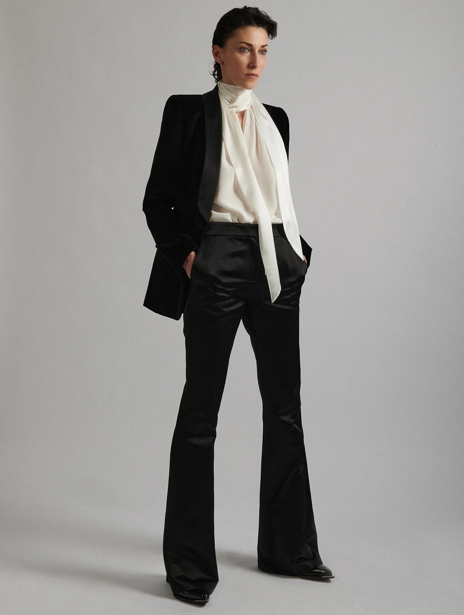 Hommage aux smokings masculins, féminisés par Barbara Bui grâce à la maîtrise sartoriale des ateliers de la Maison, ce pantalon assure une silhouette sculpturale aux lignes parfaitement esquissées. Confectionné dans un satin smoking, ce pantalon noir adopte une coupe bootleg évasée en bas de jambe pour une allure élancée. Poches italiennes, poches dos passepoilées et patte de boutonnage cachée soulignent son minimalisme épuré. À l’occasion d’une soirée, associez ce pantalon à notre veste smoking en velours noir.