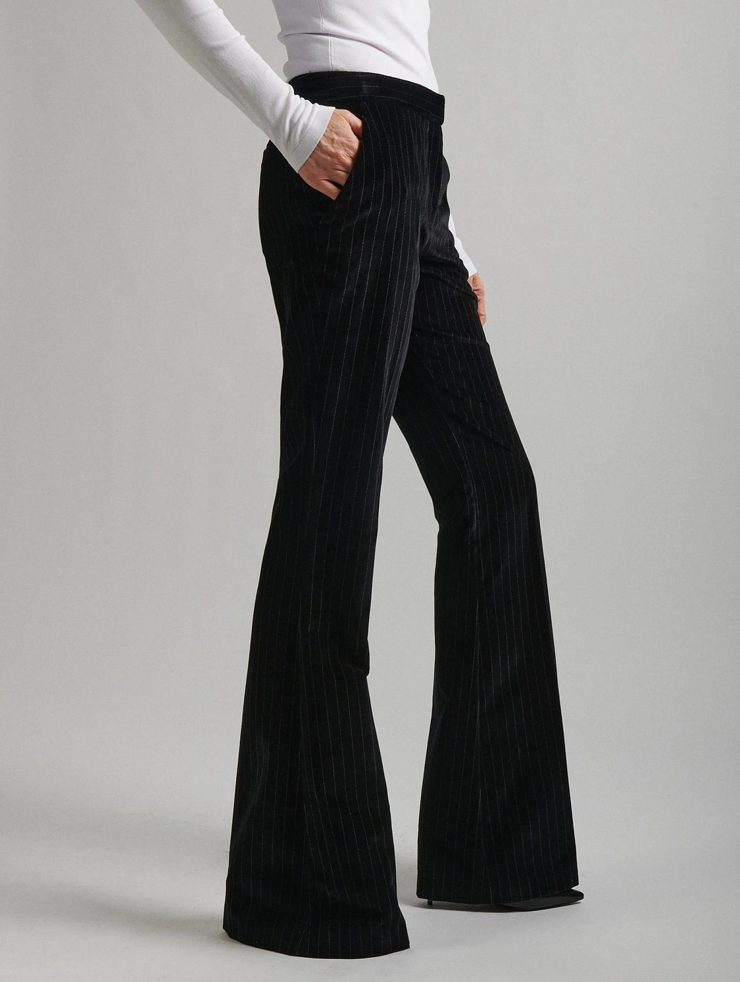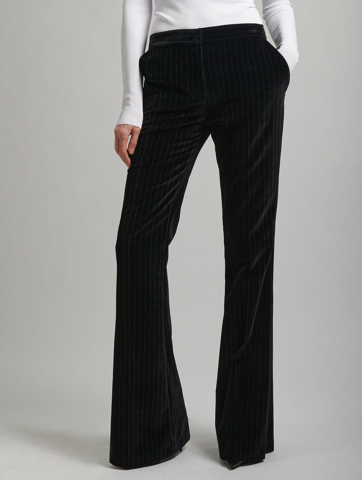 Notre pantalon de costume en velours noir à rayures apporte aux looks habillés un raffinement moderne. Conçu pour être porté la veste assortie, ce pantalon à la coupe bootleg seyante mêle avec brio les codes du vestiaire sartorial masculin à la féminité assumée de Barbara Bui. Le savoir-faire tailleur de la Maison se manifeste dans chaque détail, offrant des finitions précises pour un tombé impeccable.