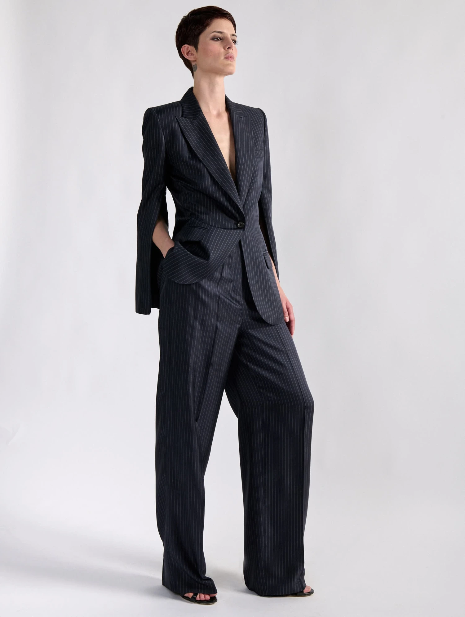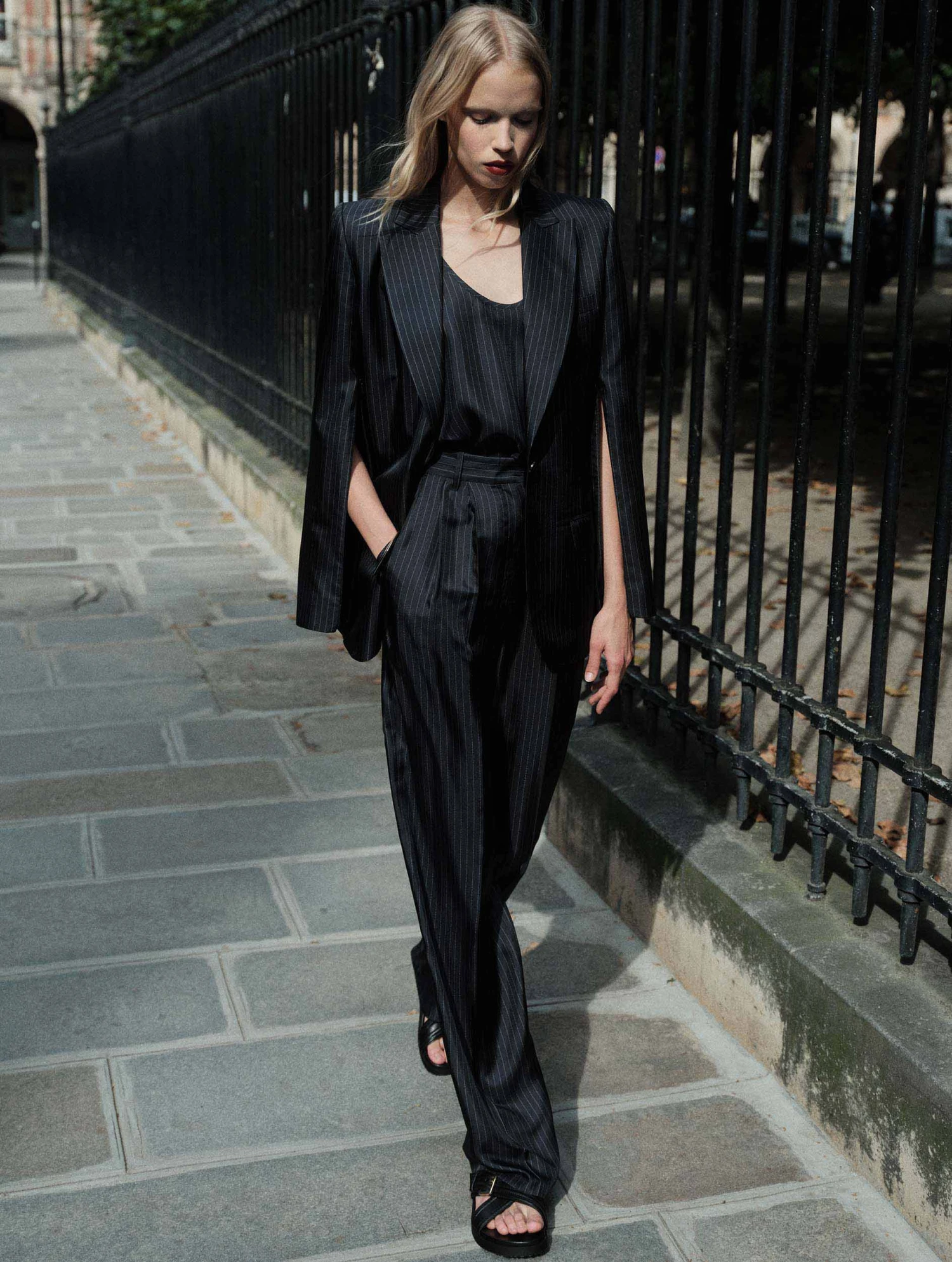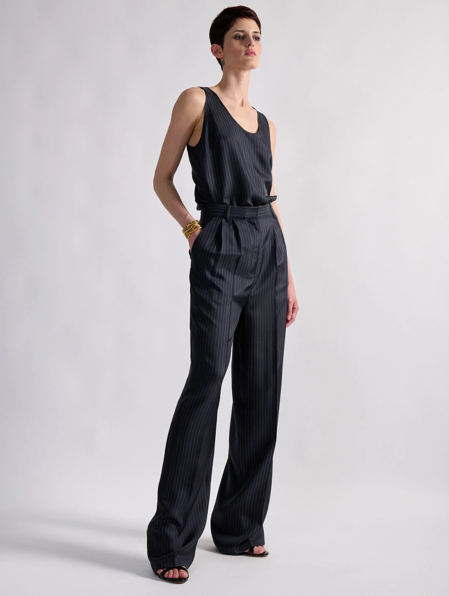Proposé dans un twill de soie fluide et léger, ce pantalon à jambes larges joue sur les détournements avec audace. La soie imprimée revisite le tissage rayé des costumes italiens masculins pour en proposer une version féminine au confort incomparable. Doté des mêmes finitions tailleurs que nos pantalons de costume classiques, ce modèle tendance s’accorde aussi bien à la veste assortie qu’au débardeur en soie rayée pour un total look revisité.