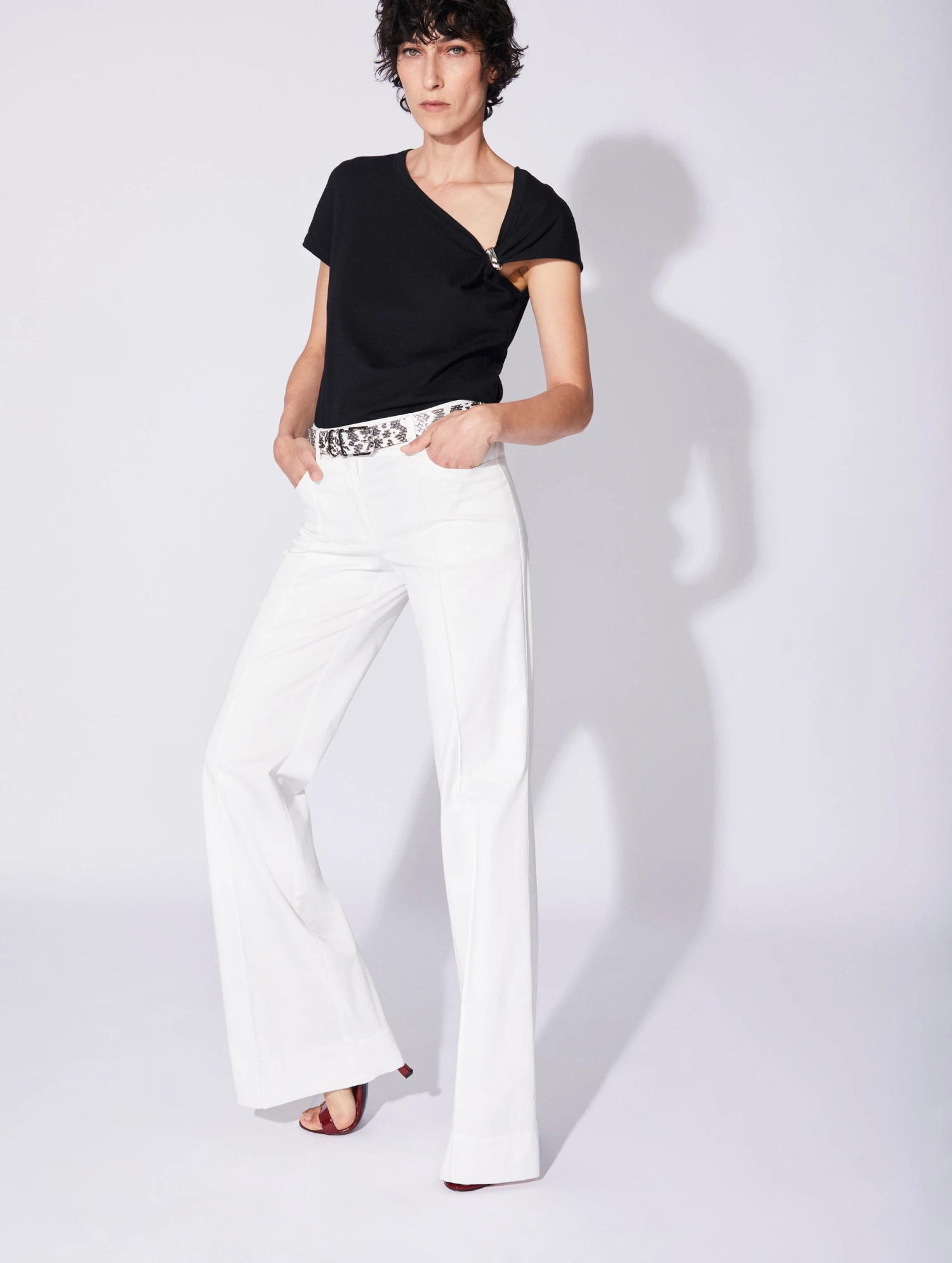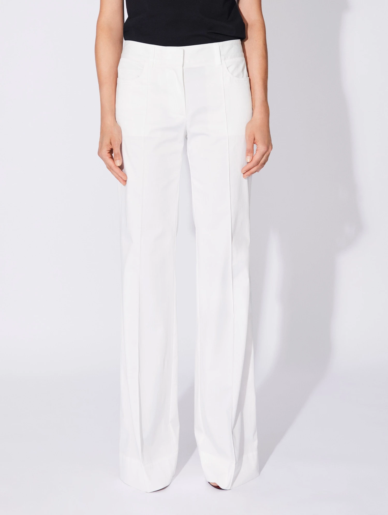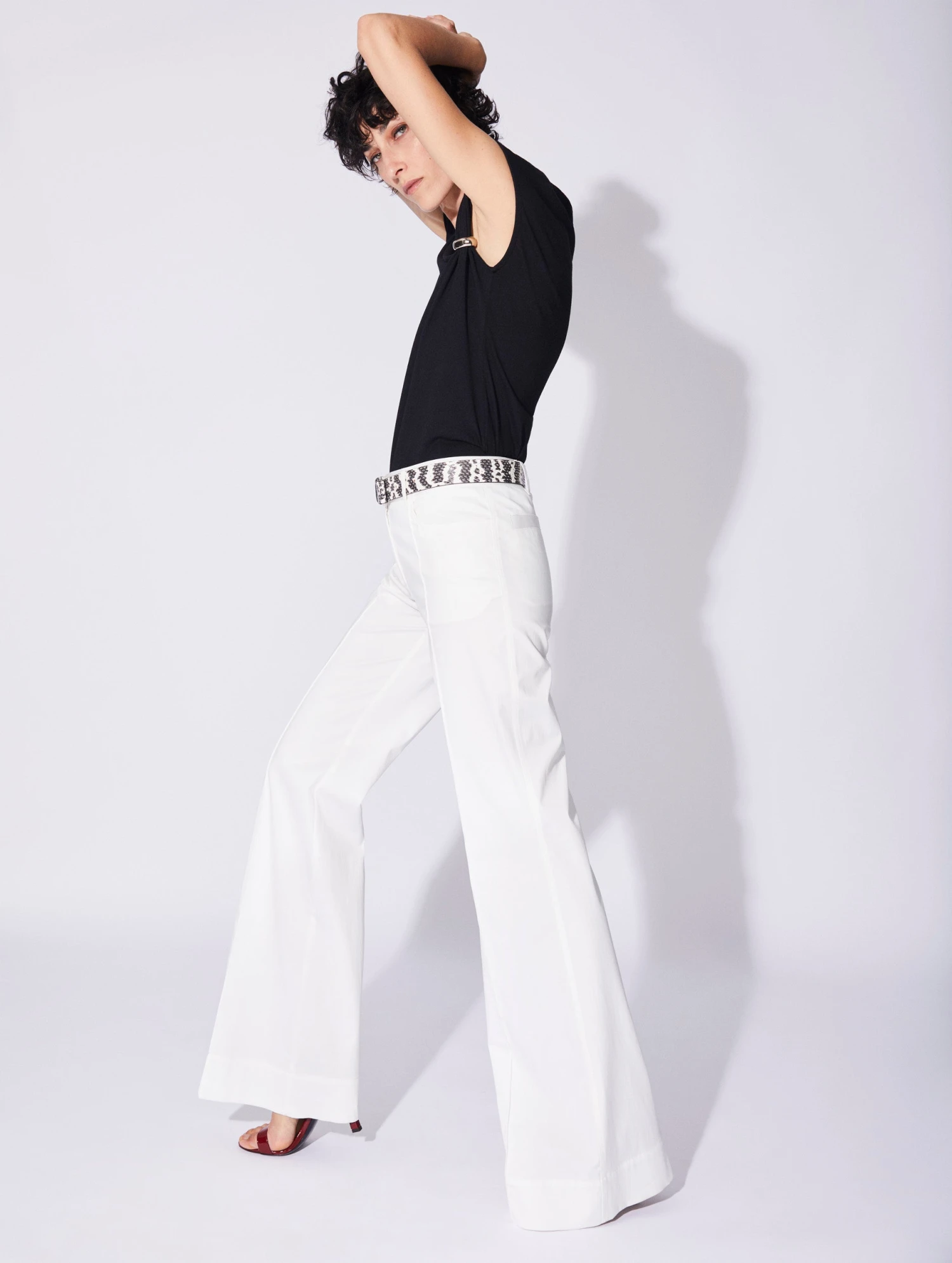 Ce pantalon femme est confectionné dans un satin de coton stretch pour un porté confortable et un bel effet de lumière. Sa coupe flare évasée au pli marqué allonge dramatiquement la jambe, un effet à souligner en l’associant à une paire de sandales à talons. Pour garantir un porté seyant plus flatteur, nos ateliers ont travaillé sur la construction de ses pinces et ajouté à ce pantalon deux poches arrière passepoilées et des poches frontales élégamment découpées. De larges passants vous invitent à souligner votre taille à l’aide d’une ceinture de cuir.