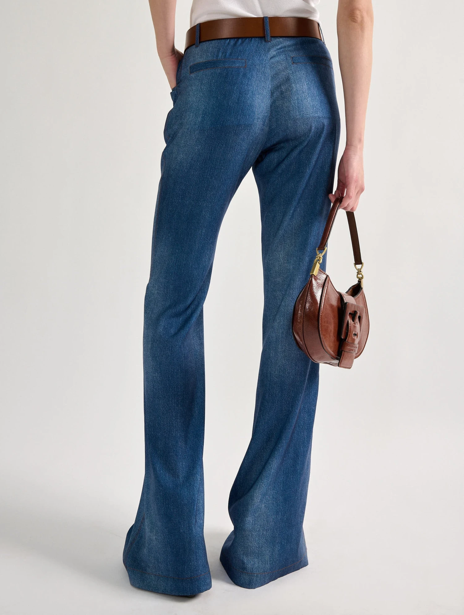 Réalisé dans une étoffe fluide imprimée façon toile denim, dont on reconnaît également les surpiqûres couleur tabac, ce pantalon joue sur le détournement des matières pour faire sien le cool du denim sans se départir du confort et de la légèreté. Sa coupe flare flatteuse apporte une nuance de féminité à une silhouette d’inspiration masculine lui associant la veste de costume assortie proposée dans une coupe boyfriend.